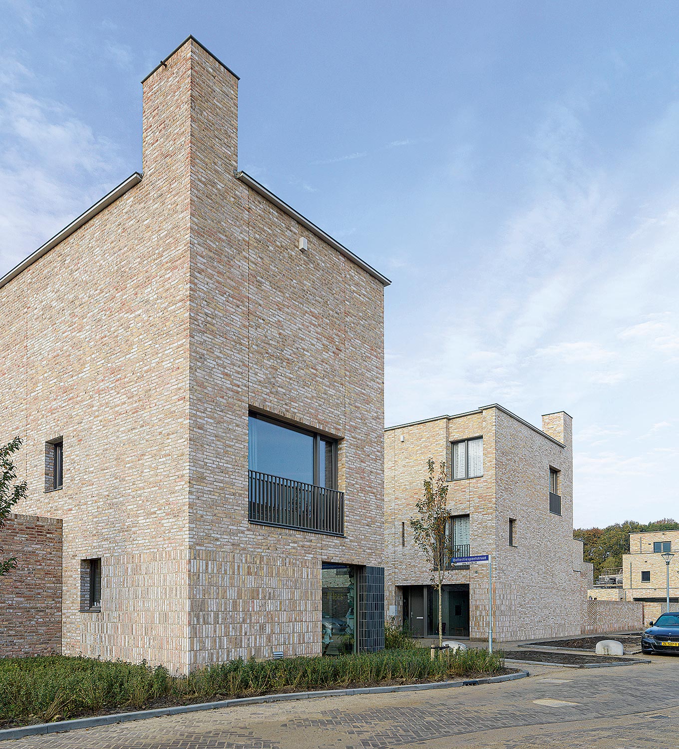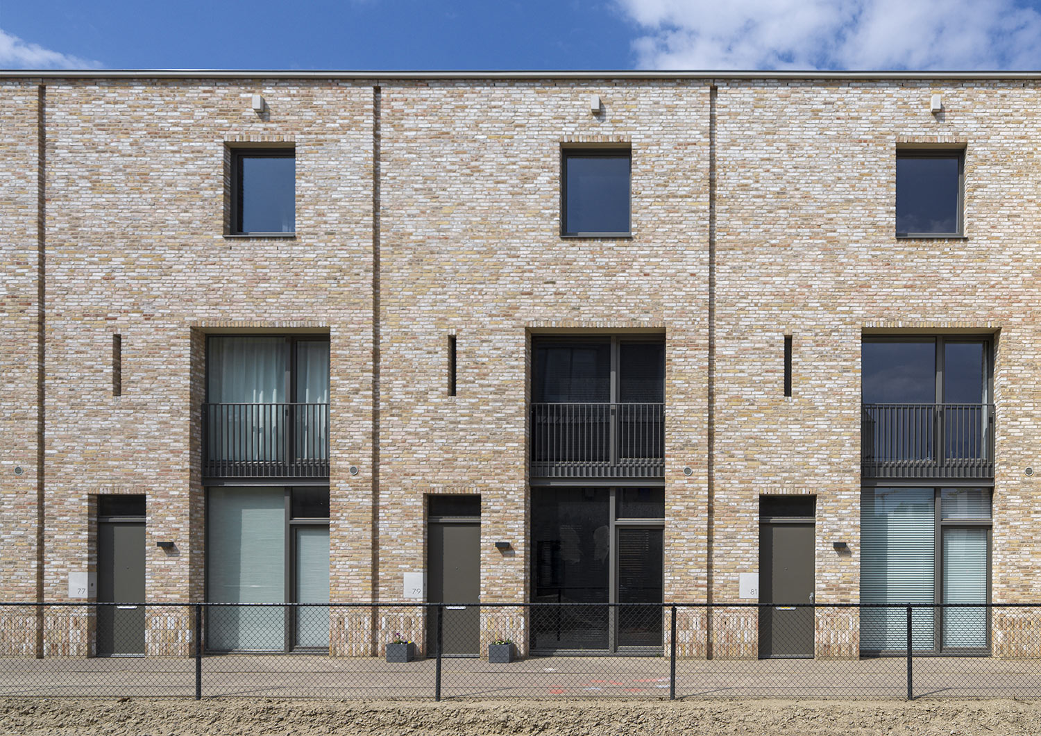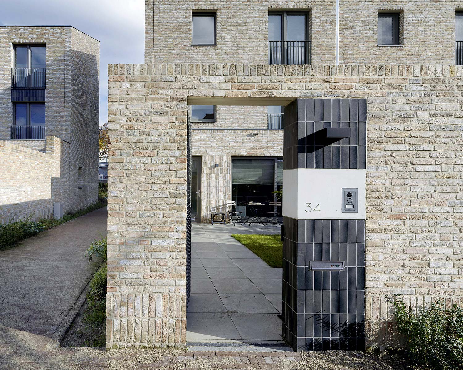 Der Entwurf setzt auf Höhenunterschiede, die bei Eingängen und Grundrissen Anwendung finden. So sind die Eingänge mancher Häuser mit einer Treppe und einer vertieften Haustür ausgestattet. In anderen Häusern wird der Höhenunterschied im Inneren durch eine hausbreite Treppe erzielt, was zu einem besonders hohen Innenraum und einer erhöhten Fassade an der frontalen Gebäudeseite führt. Für den Planer eine Möglichkeit, die Beziehung zwischen offen und privat zu stärken. Die Häuser sind zur Straße hin großzügig verglast und schaffen so die Verbindung zum öffentlichen Raum. Ähnlich sorgfältig ist die Grenze zwischen Garten und öffentlichen Flächen gestaltet, die aus speziellen, in Teilen durchbrochenen Backsteinwänden besteht.