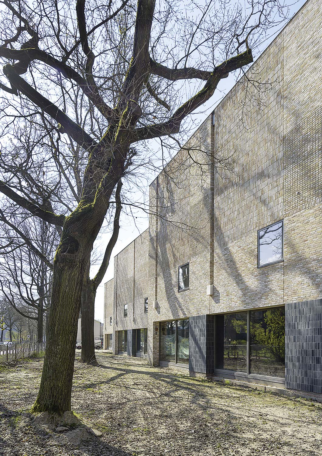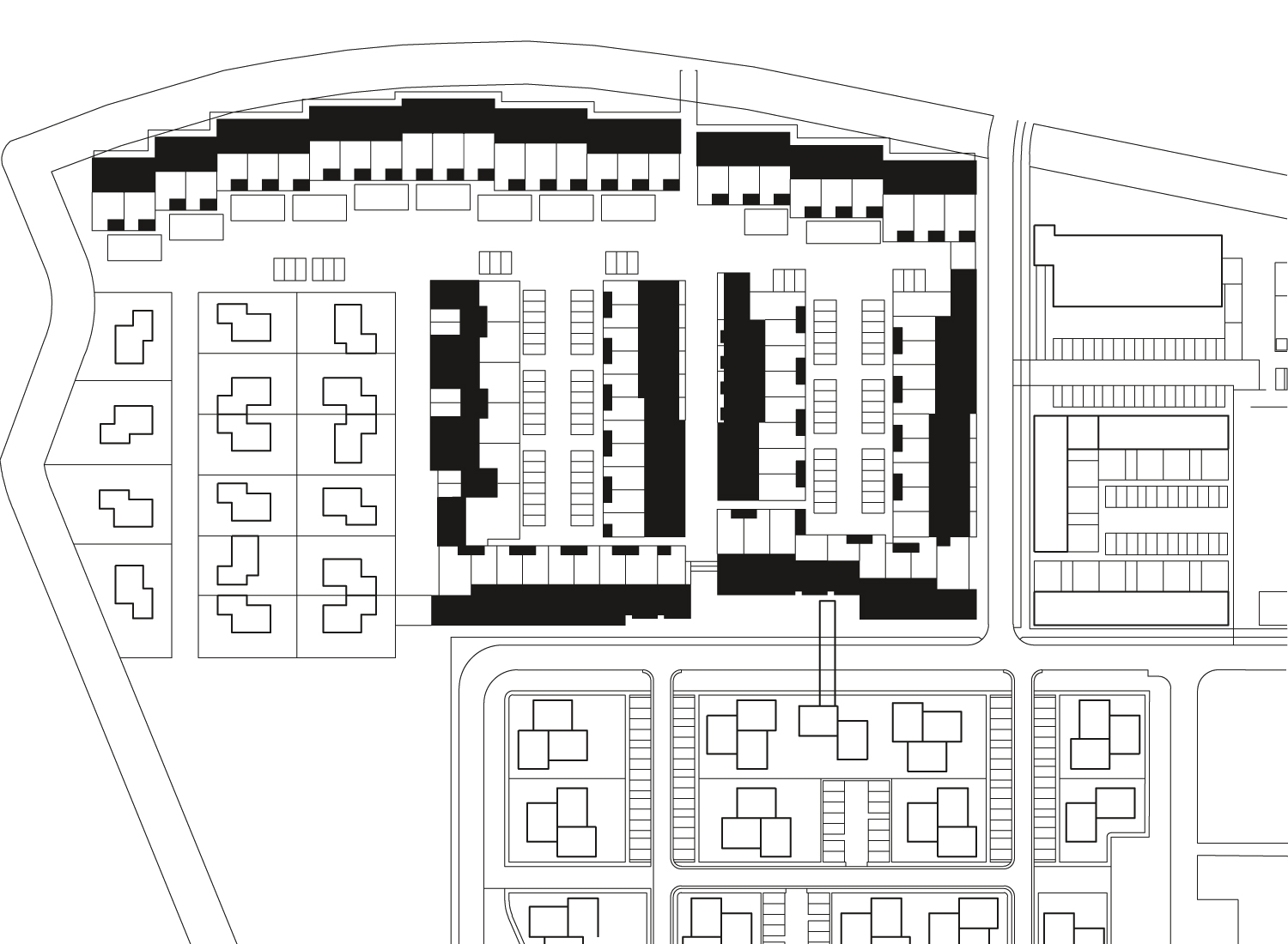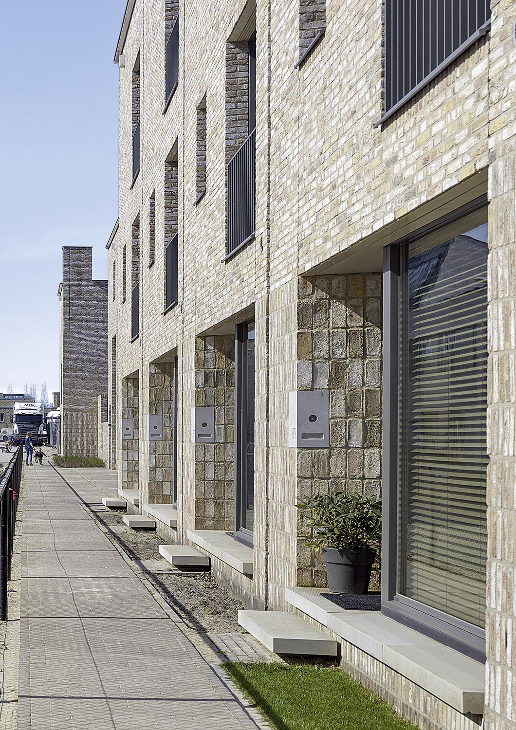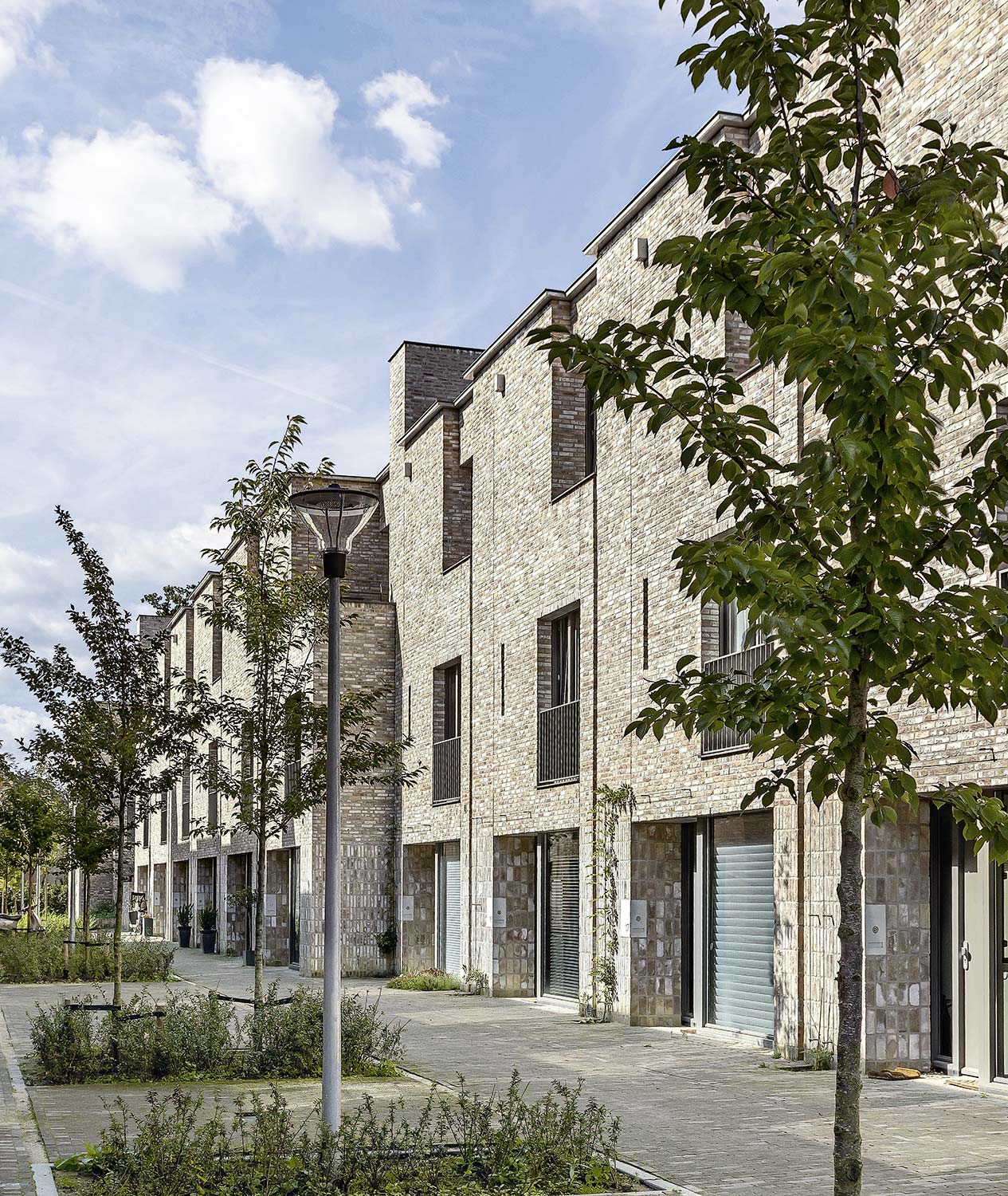 Der Entwurf setzt auf Höhenunterschiede, die bei Eingängen und Grundrissen Anwendung finden. So sind die Eingänge mancher Häuser mit einer Treppe und einer vertieften Haustür ausgestattet. In anderen Häusern wird der Höhenunterschied im Inneren durch eine hausbreite Treppe erzielt, was zu einem besonders hohen Innenraum und einer erhöhten Fassade an der frontalen Gebäudeseite führt. Für den Planer eine Möglichkeit, die Beziehung zwischen offen und privat zu stärken. Die Häuser sind zur Straße hin großzügig verglast und schaffen so die Verbindung zum öffentlichen Raum. Ähnlich sorgfältig ist die Grenze zwischen Garten und öffentlichen Flächen gestaltet, die aus speziellen, in Teilen durchbrochenen Backsteinwänden besteht.