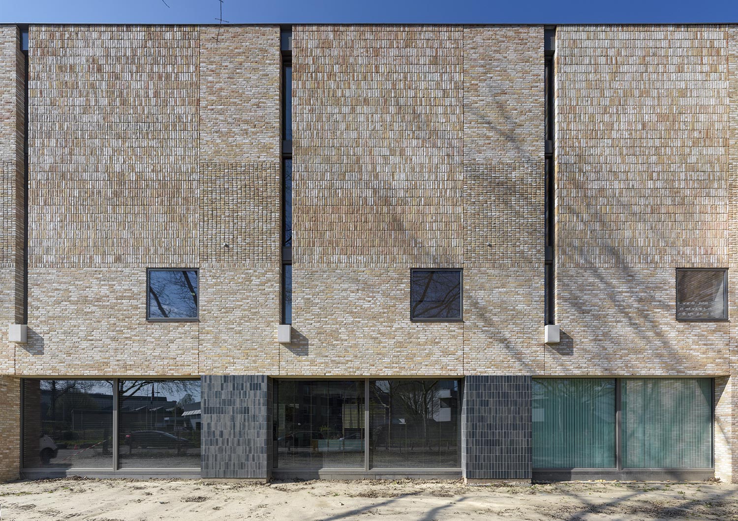 Die Häuser sind aus hellem Mauerwerk gebaut, gebrannt im traditionellen Ringofen. Die verschiedenen Anordnungen und Muster nehmen der Architektur die Strenge und verleihen dem Wohnkomplex einen handwerklichen Look. Die Verwendung von Betonelementen knüpft an die alte Fabrikarchitektur im Quartier an. Blaue Keramikfliesenarbeiten – speziell für diesen Entwurf angefertigt – sorgen an einigen strategischen Stellen für eine heitere Note, verweisen aber auch subtil auf die ehemals hier angesiedelte Elektronikmarke. Alle einzelnen Häuser sind mit Sonnenkollektoren ausgestattet, die durch erhöhte Dachvorsprünge vor den Blicken verborgen sind. Darüberhinaus ist das gesamte Quartier an die Fernwärme angeschlossen.