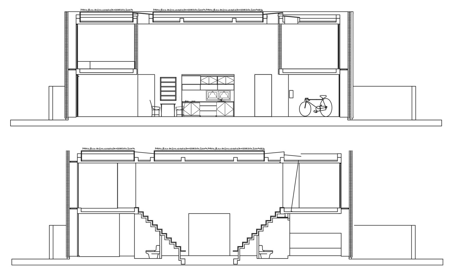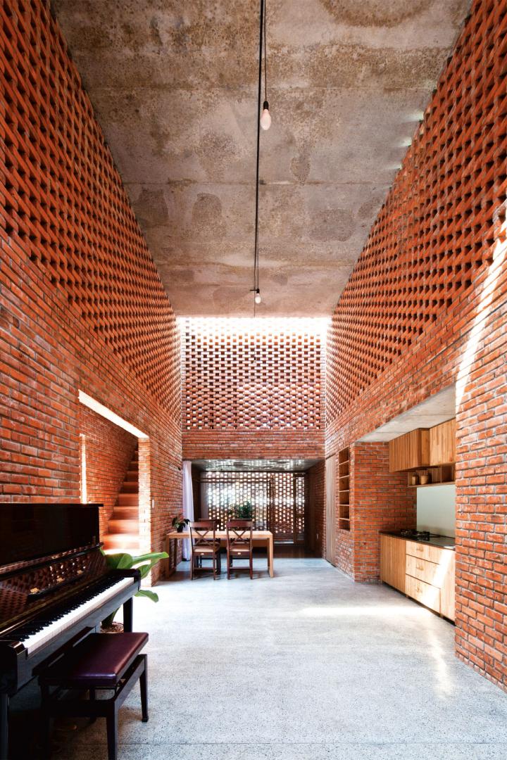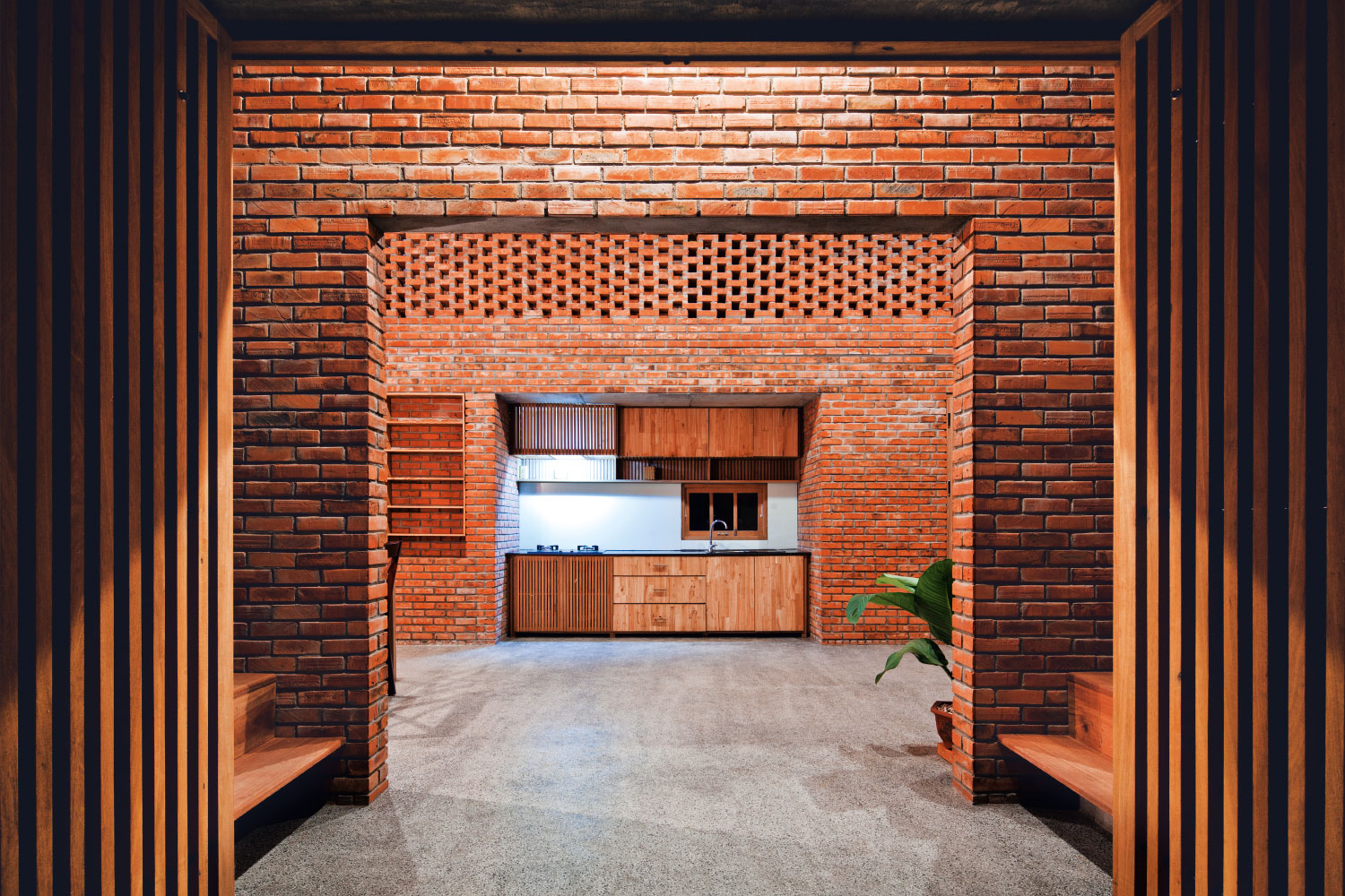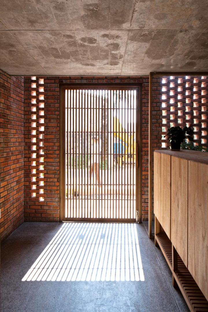 In der Hausmitte befindet sich ein großer Gemeinschaftsraum mit Kochstelle, Esstisch und Unterhaltungsecke. Diese „Lobby“ führt dann zu den verschiedenen Funktionsbereichen des Hauses wie Badezimmer, Wohnzimmer und Schlafzimmer. Im Zwischengeschoss finden sich ein weiteres Schlafzimmer, ein Altarraum sowie eine kleine Bücherei. In den Gemeinschaftsbereichen des Hauses wird der Raum nicht durch die Wand begrenzt, da sich die Familienmitglieder durch die Löcher darin sehen undmiteinander reden können. Dadurch können die Beziehungen zwischen den Familienmitgliedern im modernen, geschäftigen Leben gestärkt werden. Während des Tages gelangt natürliches Licht hinein und wirft Schattenmuster auf die Innenwände. Schlanke Oberlichter sowie relativ schmale Fenster sorgen für Helligkeit und Belüftung und geben von jedem Raum den Blick auf den Himmel und das satte Grün des Dachs frei. Sie dienen auch zur Ableitung heißer Luft und halten damit den Innenraum kühler. Je nach Tageszeit verändern sich die Farben der Ziegelwände abhängig von der Intensität des Lichts, das durch die Löcher fällt. So entsteht eine Vielfalt an Farbemotionen auf der Oberfläche des Mauerwerks. Am Abend wirkt das Haus wie eine riesige Laterne, wenn das Licht durch die Löcher herausscheint. Zur Kosteneinsparung wurde Holz aus dem alten Haus für die Herstellung von Möbeln in schlichtem Design verwendet. Die Architekten verzichteten auch auf überflüssige Hauselemente wie eine Deckschicht sowie nicht benötigte Wände oder Türen. Auch mechanische und elektrische Installationen wurden vorgenommen, um die Kosten niedrig zu halten. Wichtig war, dass das Team vor einer Entscheidung über Elemente im Entwurf zunächst sorgfältig abwog, inwieweit dieses Einfluss auf die Funktion des Raums hätte, sollte auf sie verzichtet werden. So konnte es die richtige Wahl treffen und gleichzeitig Kosten sparen.