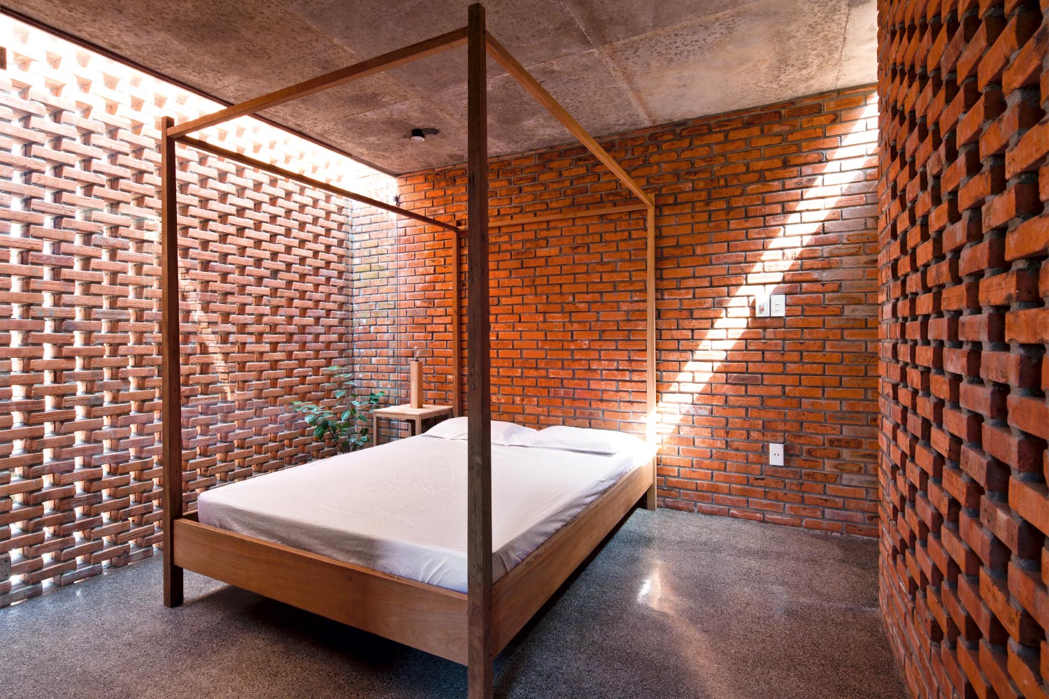 Das knappe Budget stellte eine Herausforderung für das Designteam dar, trug aber auch zur Erkenntnis bei, dass ein gutes Haus nicht unbedingt teuer sein muss. Backsteine sind ein beliebtes lokales Material, das die Menschen an mystische Tempel erinnert, die über Jahrhunderte aus Ziegeln erbaut wurden. Im tropischen Sonnenlicht verändert sich die Farbe der Backsteine und weckt je nach Tageszeit unterschiedliche Gefühle. Der Einsatz von Ziegeln und der Erhalt des alten Gartens stellen sicher, dass sich die Besitzer in ihrem neuen Heim zu Hause fühlen. Der Einsatz von Backsteinen ist in der Region beliebt, da es sich um ein nachhaltiges, günstiges Material handelt. Die Ziegel tragen durch ihre Absorptionsfähigkeit dazu bei, die Feuchtigkeit im Haus zu regulieren, was beim Hausbau in Ländern mit tropischem Klima von entscheidender Bedeutung ist.