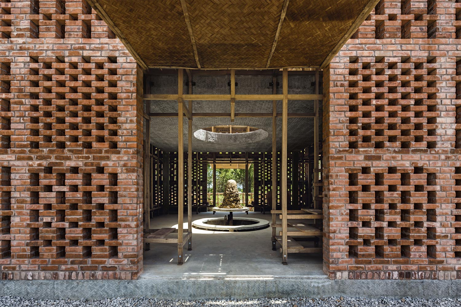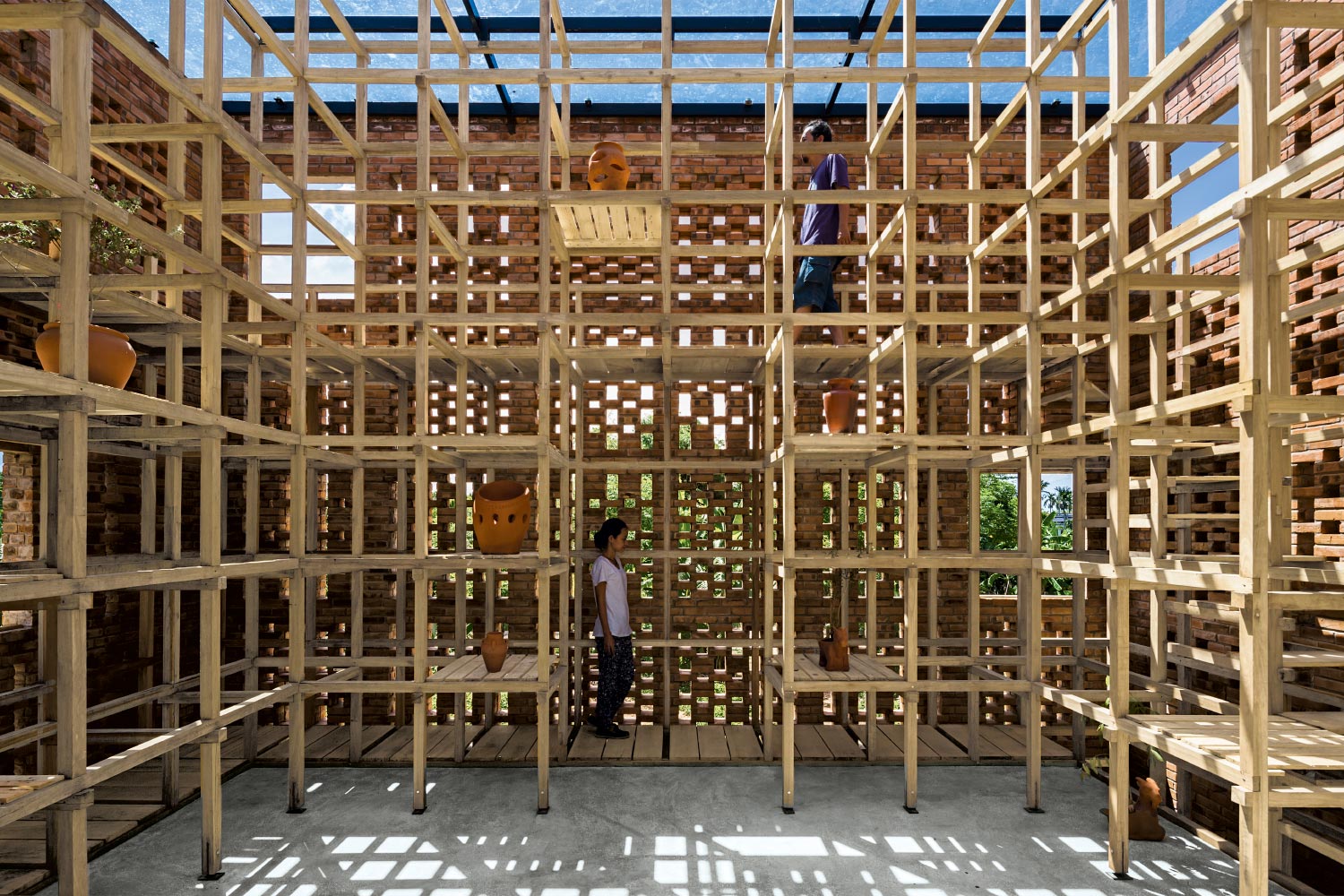 Das Terracotta-Studio in der Nähe des Flusses Thu Bon im Bezirk Dien Ban der vietnamesischen Provinz Quang Nam zeichnet sich durch seine besondere architektonische Struktur aus. Der Arbeitsplatz des renommierten Künstlers Le Duc Ha gibt der Kunst durch seine schöne Gestaltung Raum. Der Fluss ist von hoher Bedeutung für die Menschen vor Ort, da ein Großteil der Bevölkerung von der Landwirtschaft abhängig ist. Daneben gibt es eine Reihe von Handwerkszentren, in denen traditionelle Produkte wie Terrakotta, Matten oder Seide hergestellt werden. Das würfelförmige Gebäude des Studios misst 7 x 7 x 7 m und ist von einer Plattform aus Bambusrahmen umgeben, auf der die Terrakottaprodukte zum Trocknen ausgelegt werden. Außerdem befinden sich auf ihr zwei große Bänke zum Verweilen, Entspannen und Teetrinken.