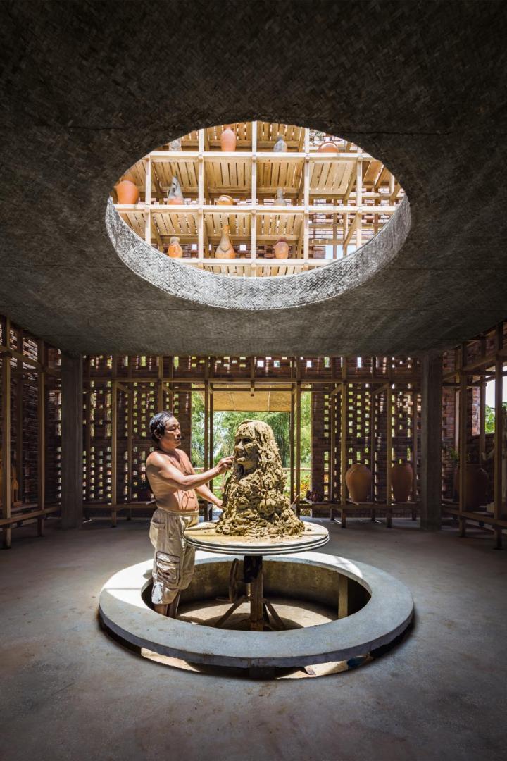 Ein Holzrahmensystem mit einer Höhe von sieben Metern schafft quadratische Module mit einer Fläche von 60 x 60 cm, die als Regale zur Ausstellung der Kunstwerke dienen. In den umlaufenden Gängen laden Bänke zum Verweilen ein. Gäste können von hier den Künstler bei der Arbeit beobachten sowie durch die Fenster das Flussufer und den Garten bewundern. Der Kern des Studios besteht aus zwei Etagen. Auf der unteren Ebene befindet sich die Drehscheibe, an der Le Duc Ha arbeitet. So können der Künstler und seine Arbeiten von Sonnenaufgang bis zur Abenddämmerung mit dem Sonnenlicht interagieren. Hier können Gäste mit dem Künstler über seine Werke ins Gespräch kommen oder ihn und seinen Schatten still beobachten. Gleichzeitig können sie sehen und spüren, wie die Zeit vergeht, wenn sich die Stimmung der Terrakottakunstwerke mit dem Lauf der Sonne verändert.