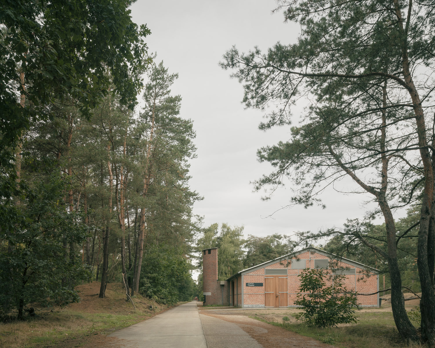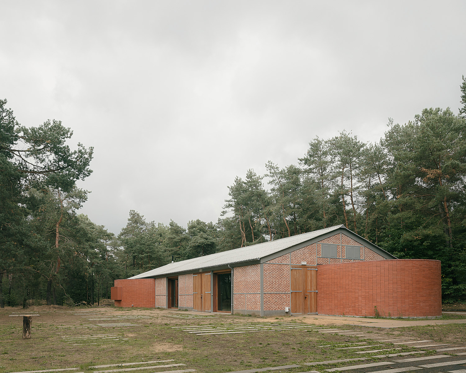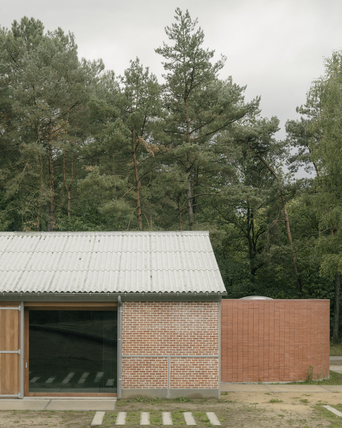 Several sheds were renovated from scratch to serve as accommodation buildings. The theater is an example of this, as here a large chimney of brown-red masonry was added, which also covers the front facade. In 2004, a master plan was developed by Studio Secchi & Viganó that divides the site into natural, military and educational levels, with the buildings considered military heritage. The theater is an interesting externalization of the history of De Hoge Rielen domain. It is a unique hybrid brick project, where the different periods are visible through different types of brick masonry. For example, the original military phase is reflected in the steel skeleton with infill masonry in stretcher bond. The beginning of the educational phase in the 1980s is visible through the brickwork bond at the chimney. Refinement and preservation of this historic legibility was the main principle in planning the rebuild.