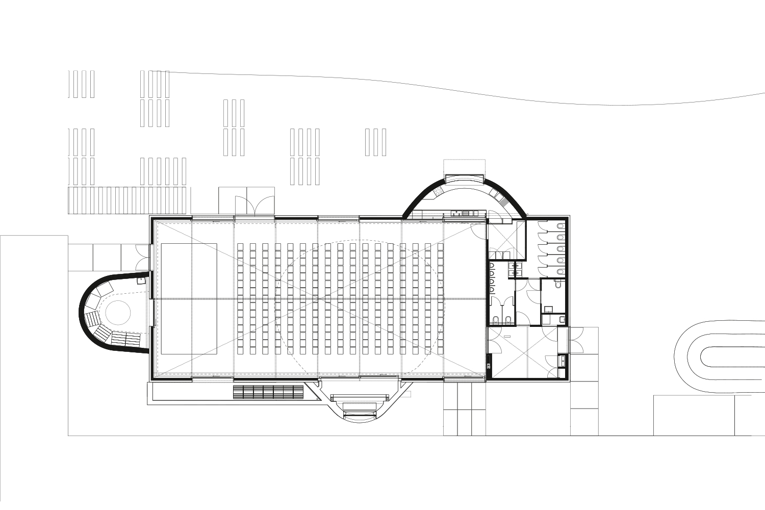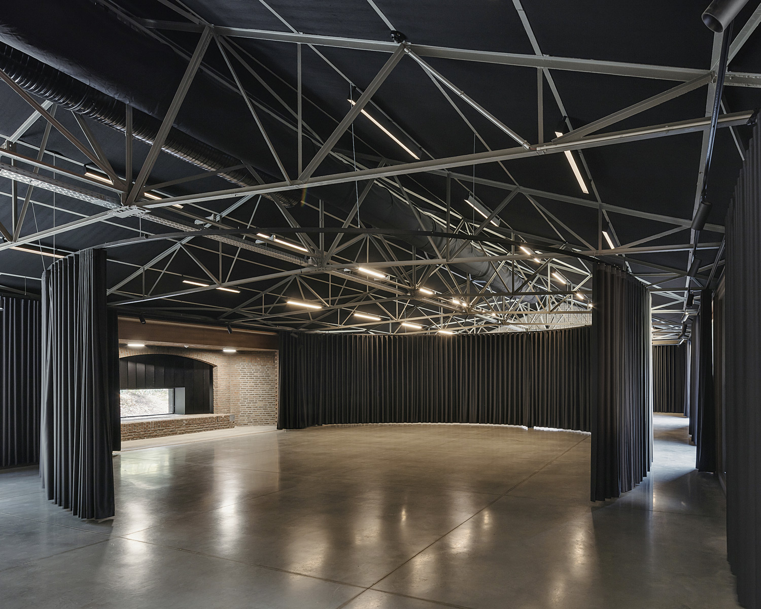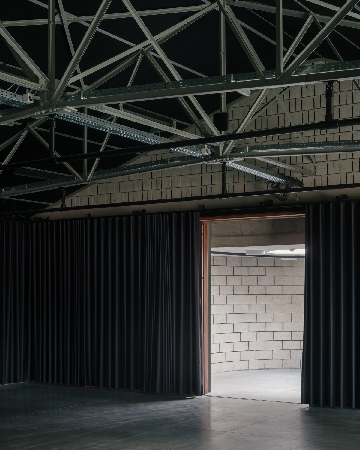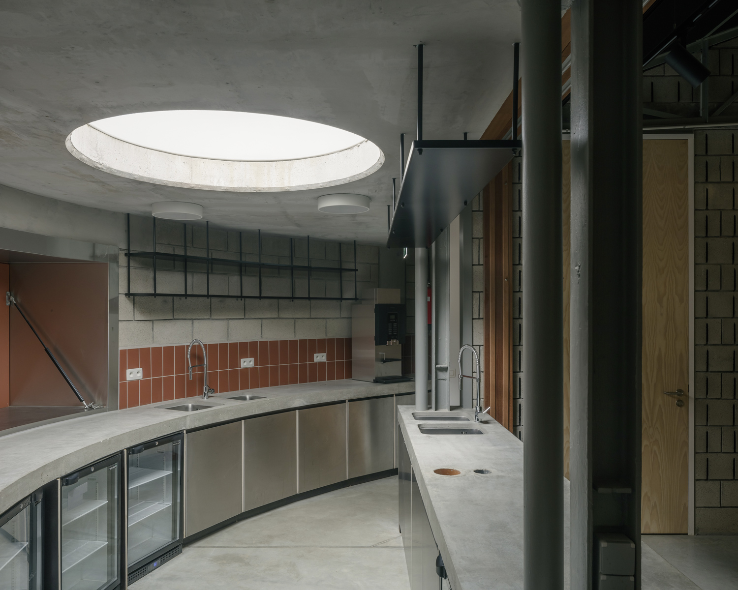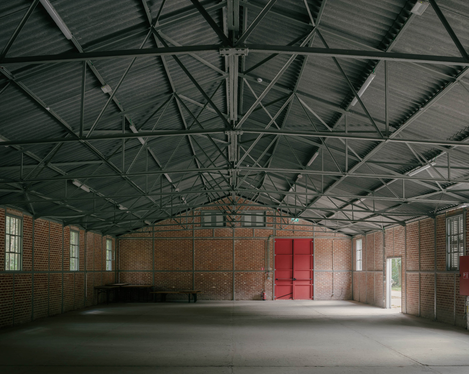dmvA chose to insulate the interior of the shed to keep the military framework and its appurtenances legible. The wall construction successively incorporates the original military masonry, thermal insulation and acoustic concrete blocks to improve the acoustic indoor environment. The choice of materials also creates a duality of atmosphere: the interior looks sober and neutral, while the exterior radiates a warm atmosphere through the red bricks.