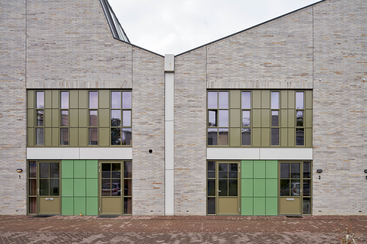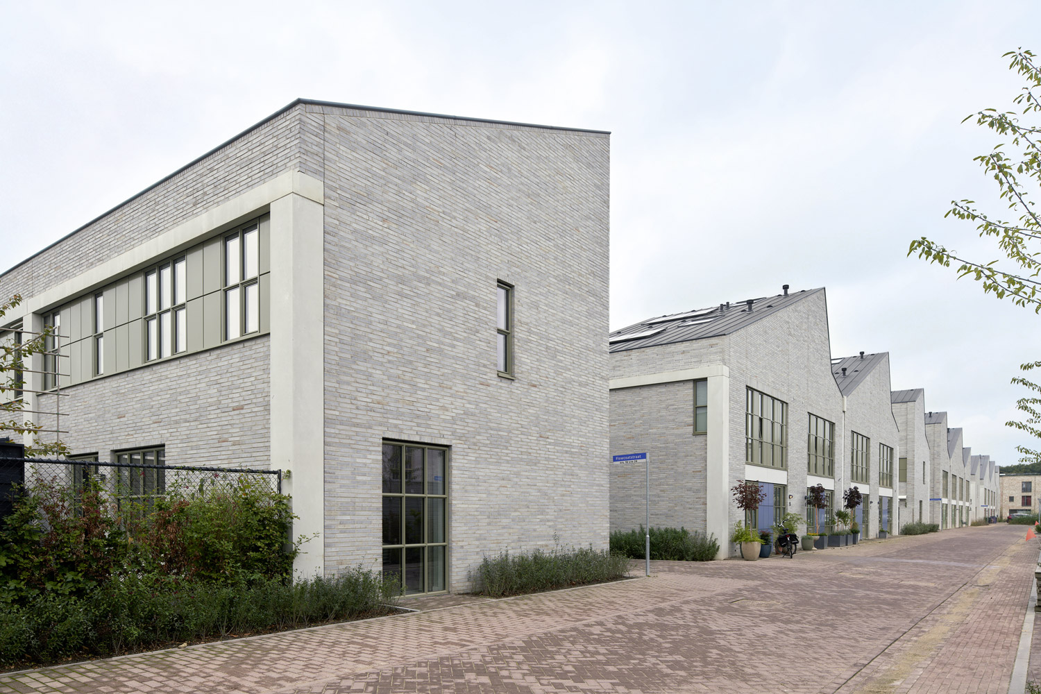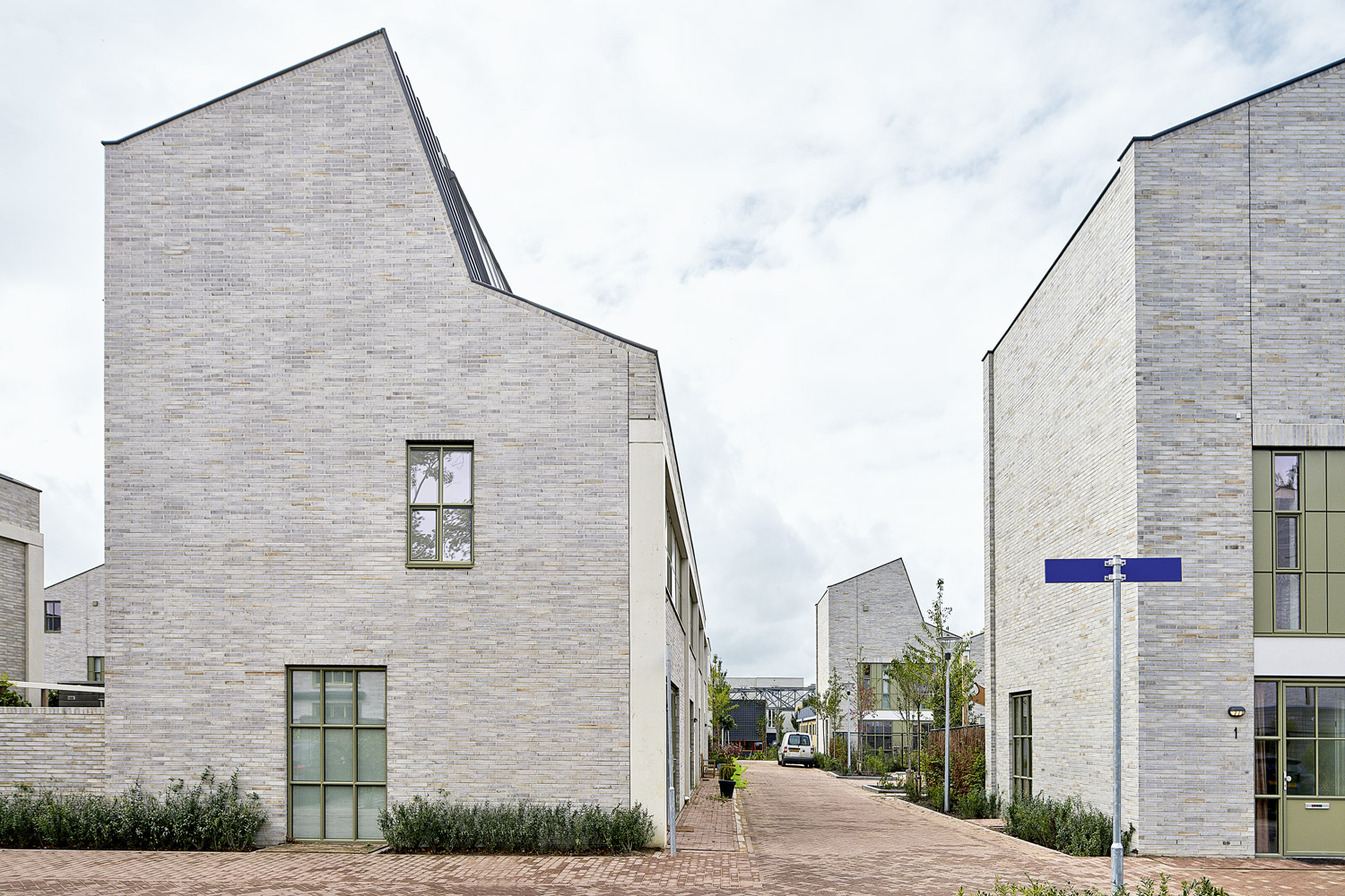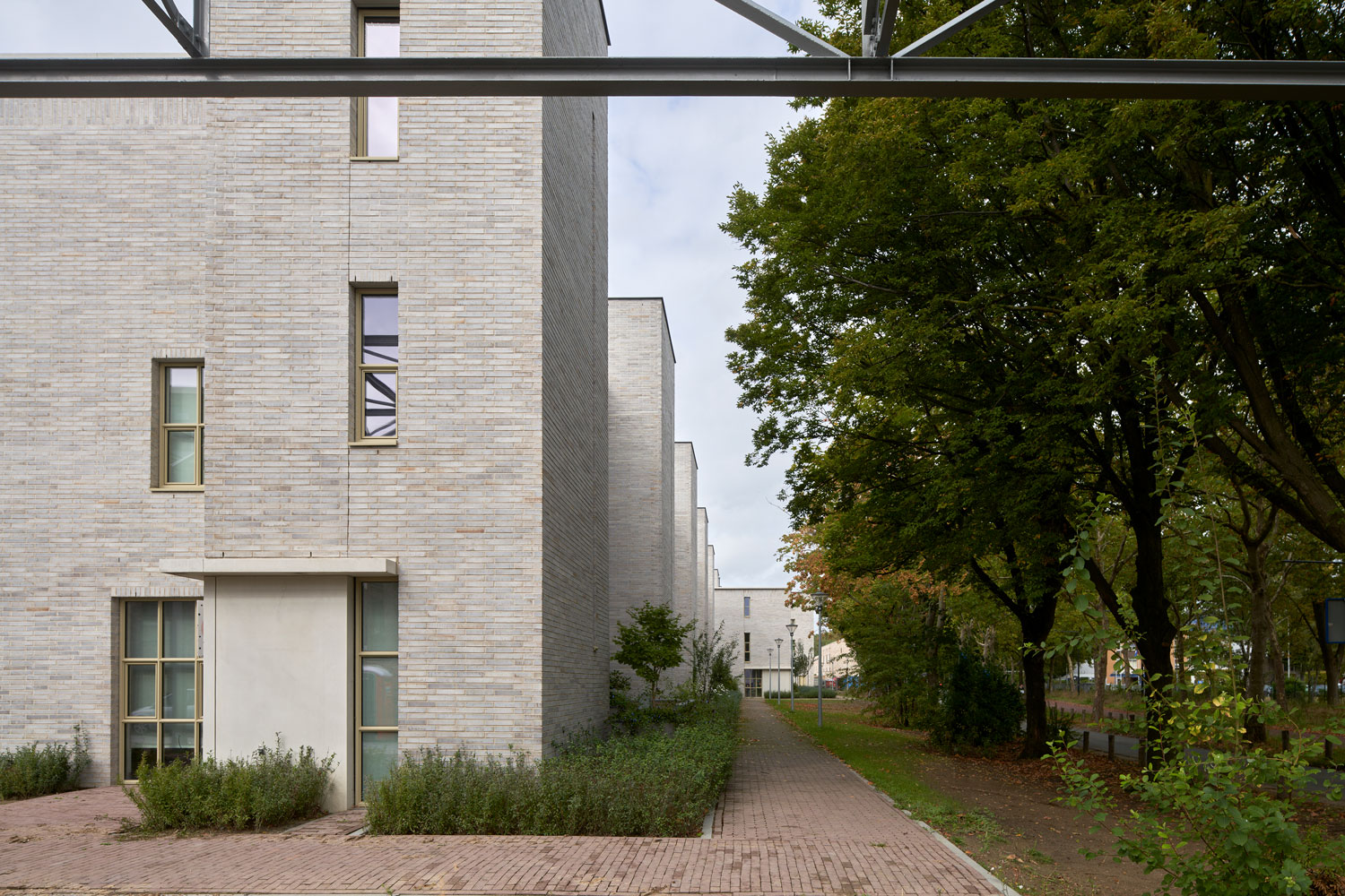 Drei Querstraßen, die diese starre Sägezahnstruktur durchdringen, führen zu den drei Höfen. Da die Straßen die Struktur an drei zufälligen Stellen durchschneiden, wird der Schnittpunkt der durchgehenden Struktur sicht- und spürbar. So entstehen besondere Ecken und Häuser, die jeder inneren Straße ihre eigenen Qualitäten und ihren eigenen Charakter verleihen. Bei den Fassaden wechseln sich große Mauerwerksflächen aus klarkantigem Backstein mit Aluminiumfronten ab. Die Rahmenkomposition dieser Fassaden hat die spezifischen Maße und die Verteilung der Philips-Stahlrahmen übernommen und stellt eine Verbindung zu den monumentalen Industrierelikten des Viertels her. Die unterschiedlich unifarbenen Paneele in den unteren Fronten trennen die Höfe optisch voneinander und stellen gleichzeitig einen Bezug zu den Grundfarben des (Bildröhren-)Lichts – Rot, Grün und Blau – her. Die Treppenhäuser sind in separaten Türmen untergebracht, die in einer Linie stehen und in Anlehnung an die charakteristischen Kühltürme der Glasschmelze leicht aus der Rück- oder Frontfassade herausragen. Eine Ecke des Geländes ist für einen viergeschossigen Wohnkomplex mit Tiefgarage reserviert, dessen Fassaden in Anlehnung an die alten Philips-Büros einen Wechsel von Mauerwerksflächen und großen, sich wiederholenden Öffnungen aufweisen. Auch hier betonen vertikale Betonelemente die Struktur, da sie einen schlanken, auskragenden Dachrand aus Beton tragen.