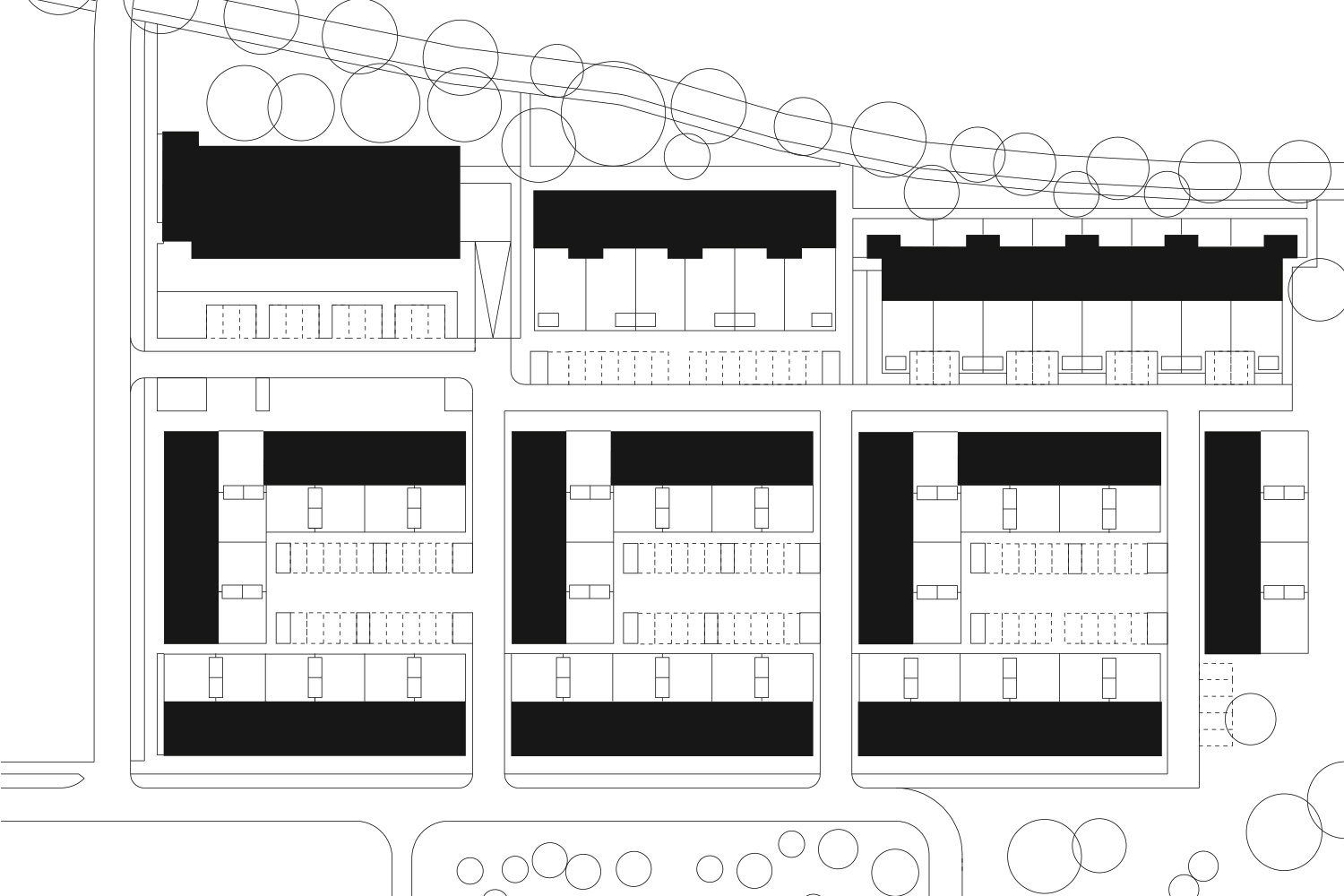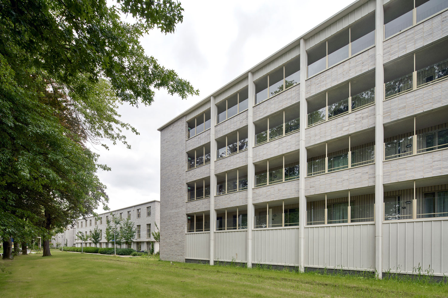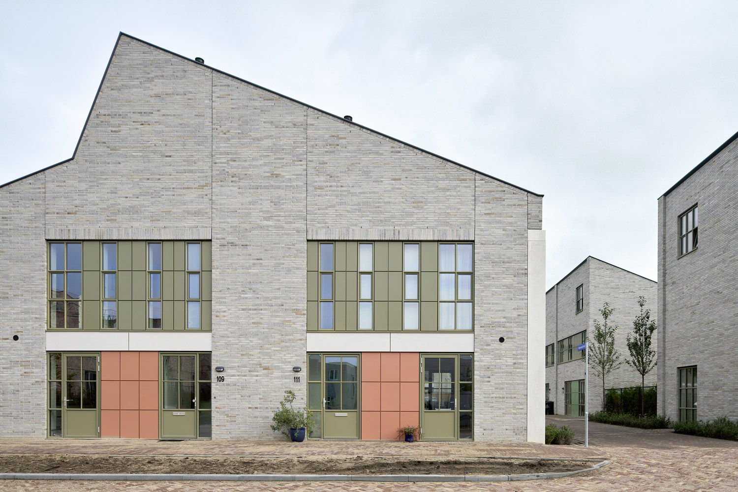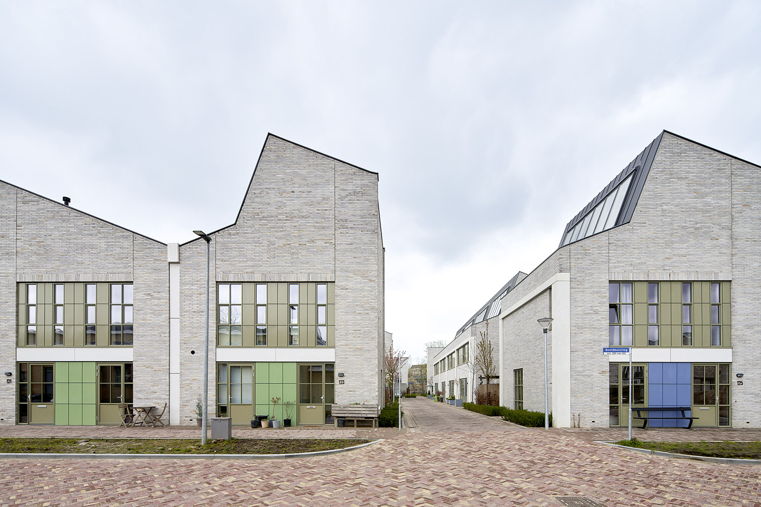 Drei Querstraßen, die diese starre Sägezahnstruktur durchdringen, führen zu den drei Höfen. Da die Straßen die Struktur an drei zufälligen Stellen durchschneiden, wird der Schnittpunkt der durchgehenden Struktur sicht- und spürbar. So entstehen besondere Ecken und Häuser, die jeder inneren Straße ihre eigenen Qualitäten und ihren eigenen Charakter verleihen. Bei den Fassaden wechseln sich große Mauerwerksflächen aus klarkantigem Backstein mit Aluminiumfronten ab. Die Rahmenkomposition dieser Fassaden hat die spezifischen Maße und die Verteilung der Philips-Stahlrahmen übernommen und stellt eine Verbindung zu den monumentalen Industrierelikten des Viertels her. Die unterschiedlich unifarbenen Paneele in den unteren Fronten trennen die Höfe optisch voneinander und stellen gleichzeitig einen Bezug zu den Grundfarben des (Bildröhren-)Lichts – Rot, Grün und Blau – her. Die Treppenhäuser sind in separaten Türmen untergebracht, die in einer Linie stehen und in Anlehnung an die charakteristischen Kühltürme der Glasschmelze leicht aus der Rück- oder Frontfassade herausragen. Eine Ecke des Geländes ist für einen viergeschossigen Wohnkomplex mit Tiefgarage reserviert, dessen Fassaden in Anlehnung an die alten Philips-Büros einen Wechsel von Mauerwerksflächen und großen, sich wiederholenden Öffnungen aufweisen. Auch hier betonen vertikale Betonelemente die Struktur, da sie einen schlanken, auskragenden Dachrand aus Beton tragen.