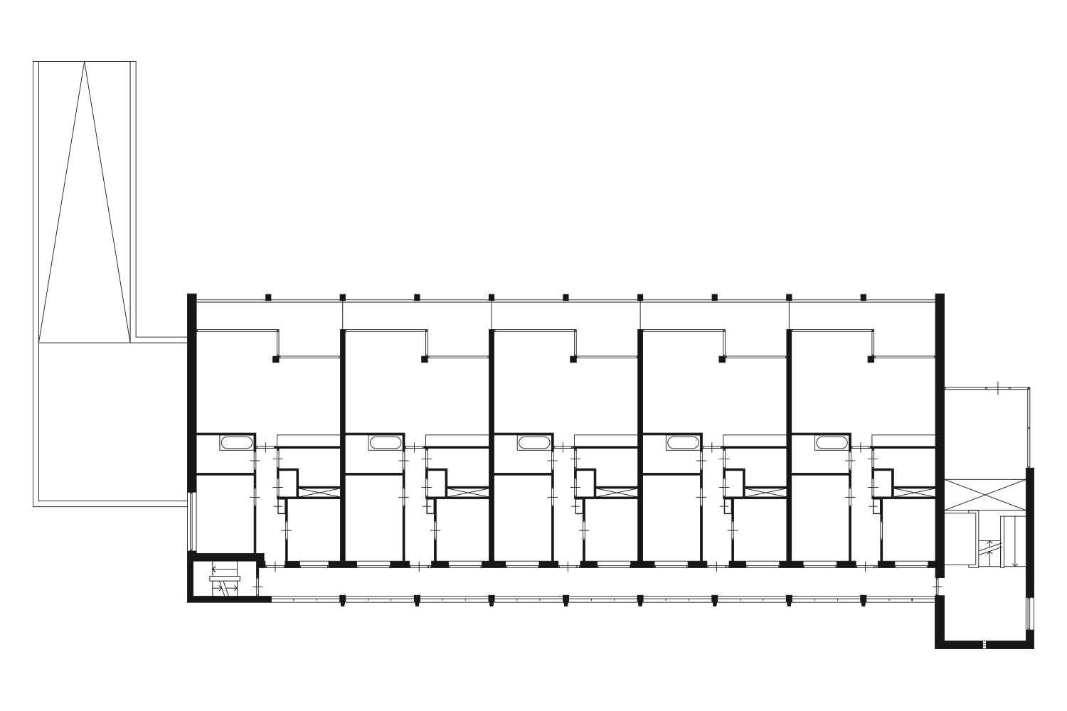 Das Herzstück des neuen Viertels besteht aus Sägezahnwohnungen. Diese Volumen im zentralen Bereich des Stadtteils Strijp R folgen den langen Linien der abgerissenen Fernsehbildröhrenfabrik. Die sichtbare Betonkonstruktion greift den durchgängigen Aufbau auf: Betontrennwände wurden auf ein Planungsraster von 7,50 Metern gesetzt, das sich direkt aus der Breite der alten Fabrikhallen ableitet. Die typische asymmetrische Form der Sägezahndächer ist über zwei Häuser gefaltet, sodass zwei völlig unterschiedliche Wohnformen entstehen.
