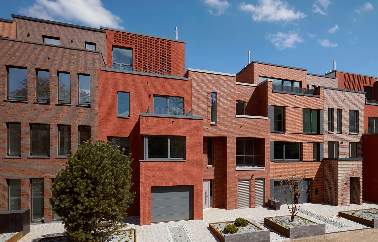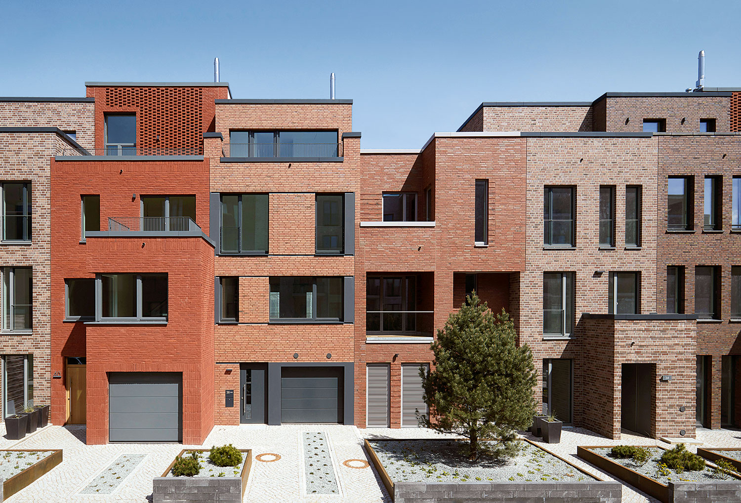 Durch unterschiedliche Breite, Höhenstaffelung und nicht zuletzt die Wahl des Backsteins ist eine lebendige Häuserzeile mit individuellen Adressen entstanden.