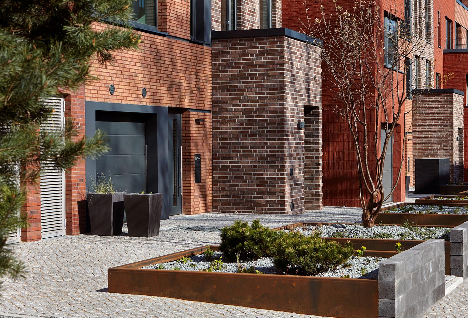 Die Fassaden wurden straßenseitig als steinerne Fassade mit einer rötlichen Verblendansicht ausgeführt, deren Ausformulierung sich je nach Haustyp verändert. Die fein ausgearbeiteten Unterschiede in Farbe, Haptik und Verarbeitung erzeugen eine „Einheit der Vielfalt“ innerhalb der Stadthauszeile.