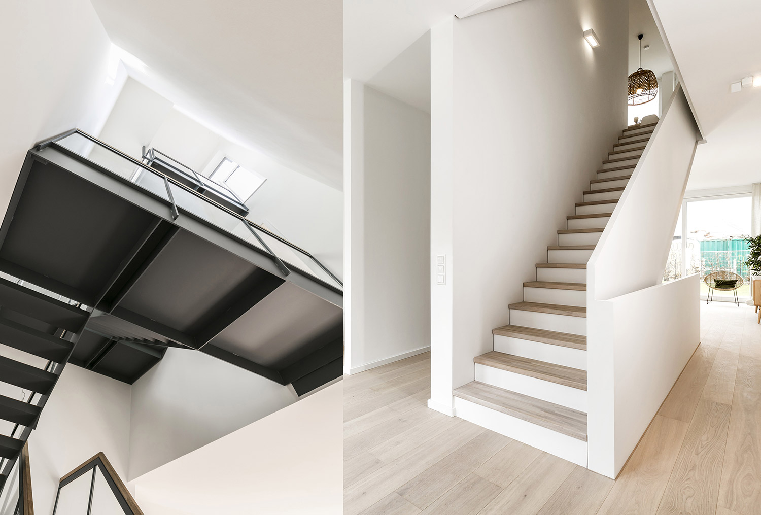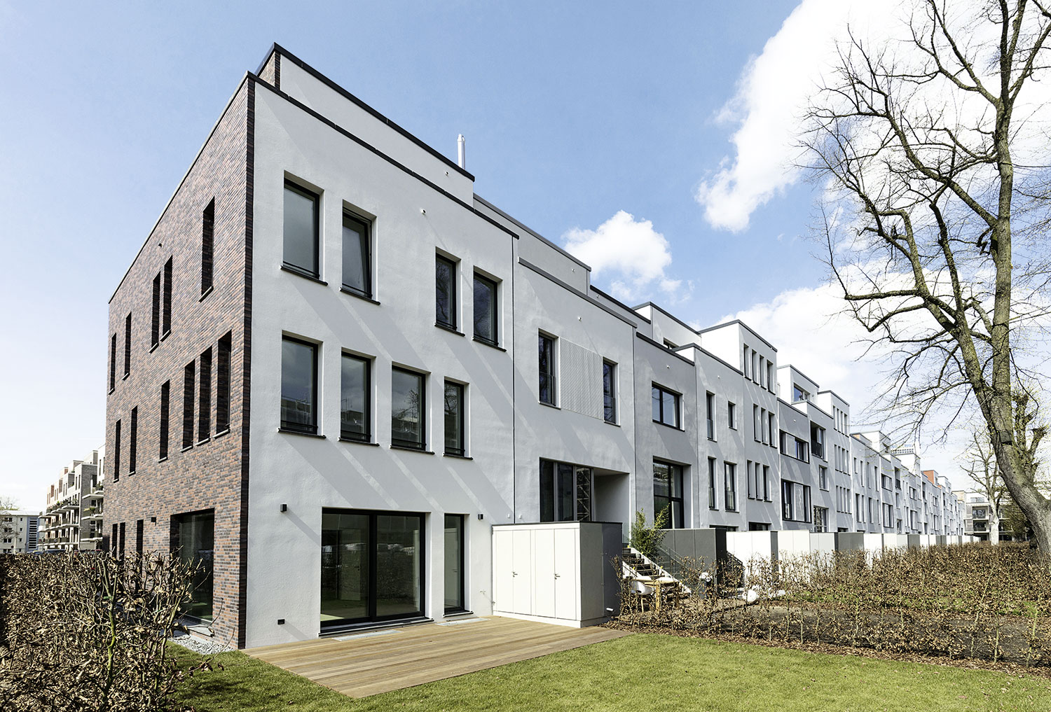 Gartenseitig beziehungsweise zum Blockinneren wurden unterschiedliche, weiße Putzfassaden umgesetzt. Die Dachflächen sind extensiv begrünt und die gesamte Stadthauszeile entspricht dem Standard KfW-Effizienzhaus 40.