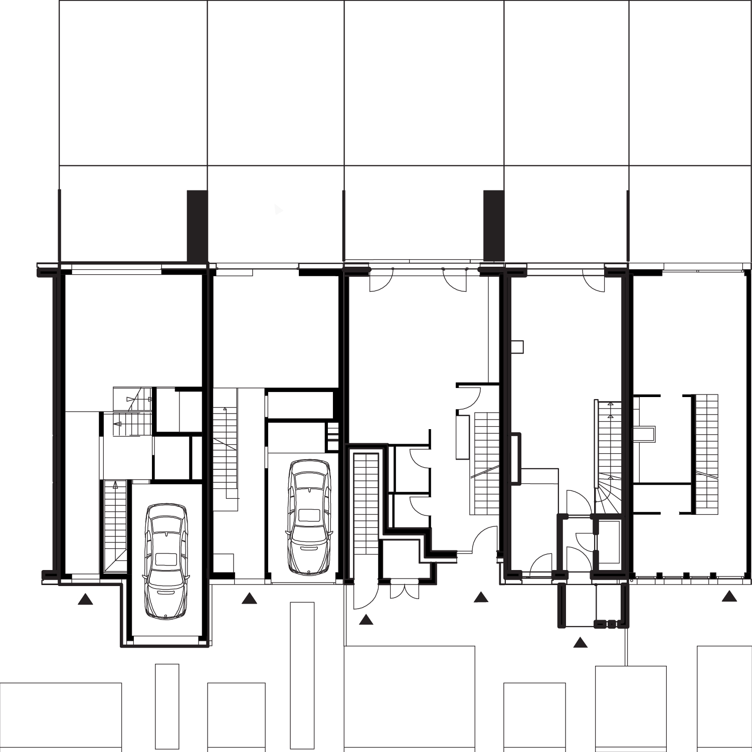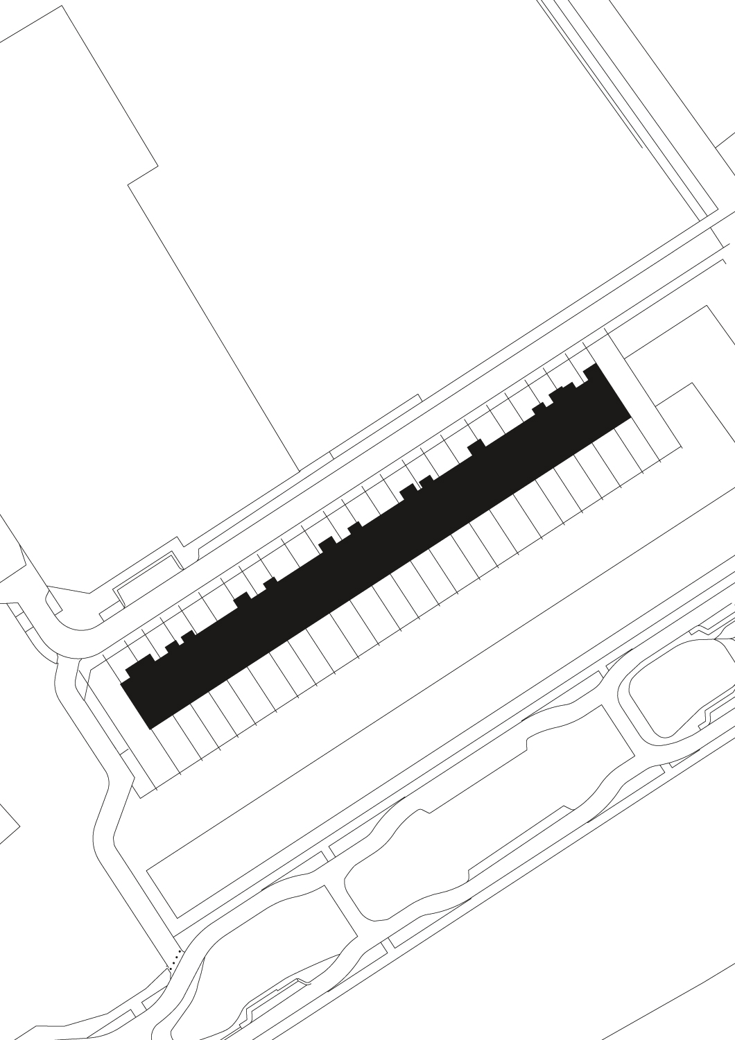 Die Parzellenbreiten variieren von 4,75 bis 6,5 Metern. Durch die unterschiedlichen Breiten und verschiedenen Höhenstaffelungen entsteht eine lebendige Häuserzeile mit individuellen Adressen – zumal die acht Haustypen so konzipiert sind, dass kein Haus die gleichen Nachbarn hat. Verstärkt wird dies zusätzlich durch das Geländegefälle, die wechselnden Vor- und Rücksprünge im Staffelgeschoss sowie durch diverse Vorbauten im Erdgeschoss.