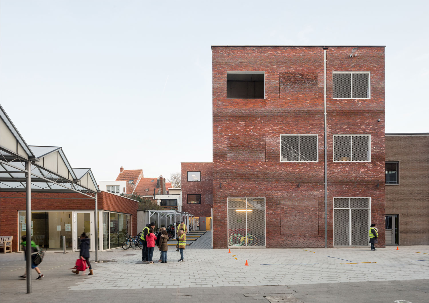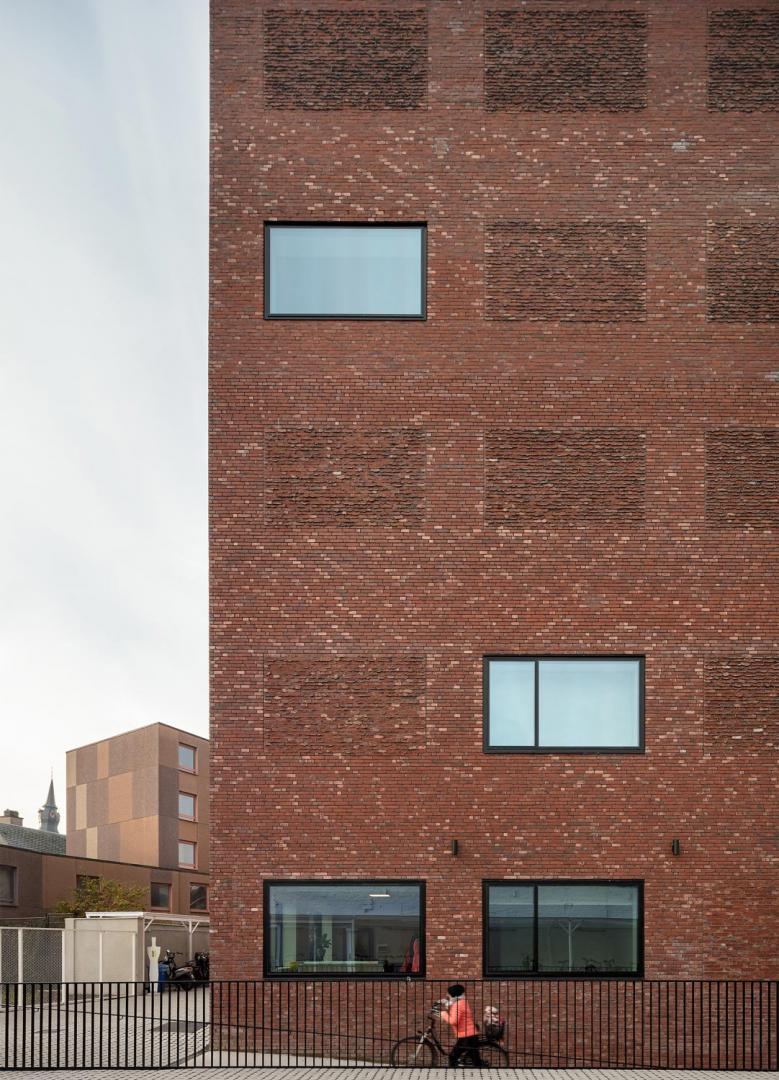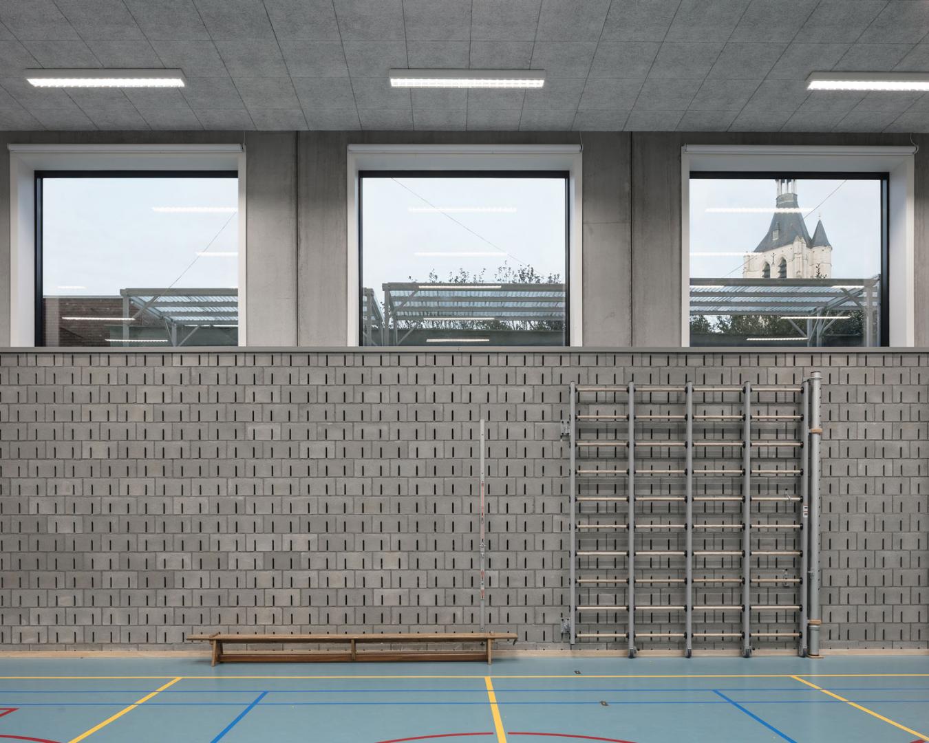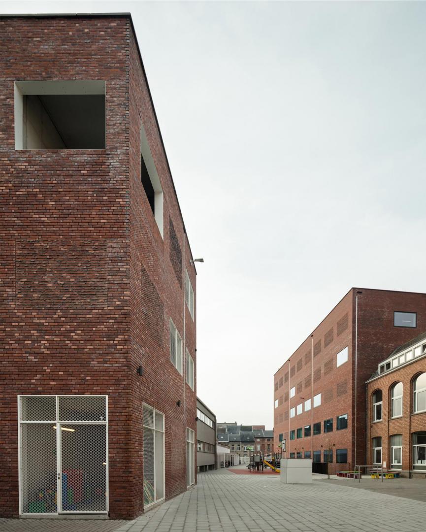 Bei dem Versuch, die Freiflächen des Geländes zu strukturieren, sind eine Reihe von Höfen entstanden, die neben den kompakten Gebäuden große unbebaute Bereiche schaffen und so inmitten des dichten Blocks Raum zum Durchatmen bieten. Der Übergang vom öffentlichen zum privaten Bereich, von der Straße zu den Klassenzimmern, hat eine klare Hierarchie und wird durch die Positionierung und Durchlässigkeit der umgebenden Architektur spürbar. Die Neubauten sind in ihrem Volumen und ihrer Architektursprache in den Bestand integriert. Die vorgefertigten Betonstrukturen sind mit typisch flämischen Ziegeln verkleidet, wobei verschiedene Arten von Mauerwerk und Mörtelfugen verwendet werden. Indem ein Bezug zu den industriellen Archetypen der Vergangenheit hergestellt wird, spielen die Gebäude mit der Erinnerung der Bewohner und stellen die Wahrheit auf den Kopf: Waren die Schulgebäude vielleicht zuerst da, wurden sie ein paar Mal renoviert und wurde der Rest des Gebäudeblocks um sie herum gebaut?