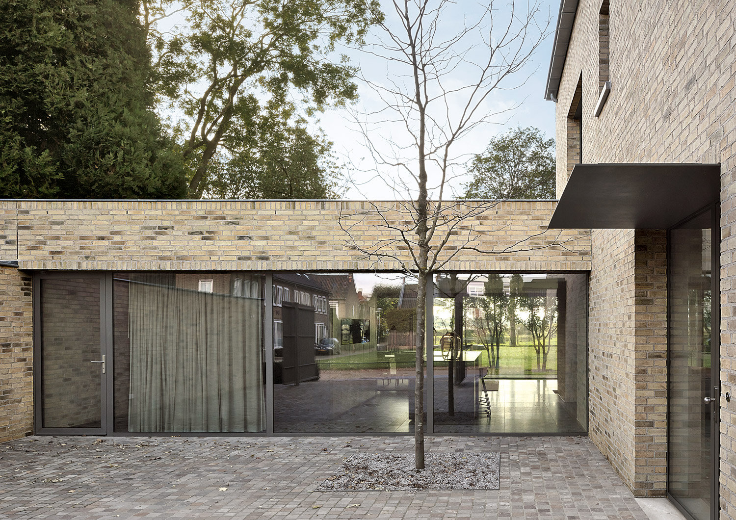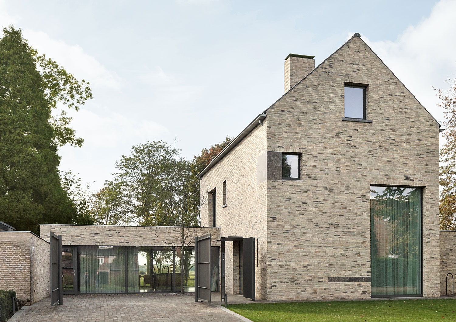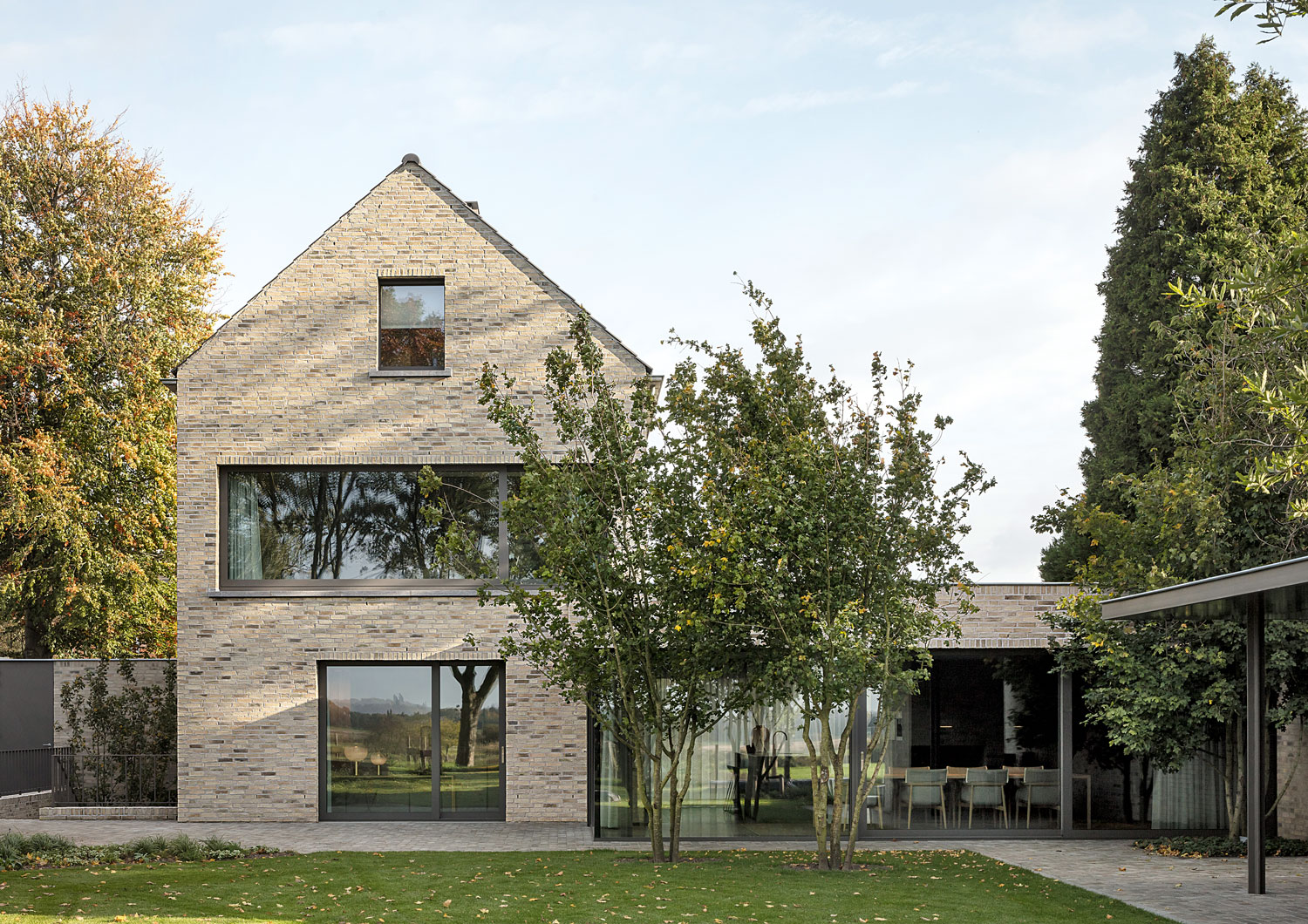 Die Villa Broeck fügt sich mit ihrer Form und Gestalt bewusst in ihre Umgebung ein. Dabei stellte weniger das architektonische Erscheinungsbild als vielmehr die Landschaft die Grundlage für den Entwurf dar. Einer der architektonischen Ausgangspunkte war die Darstellung verschiedener Stimmungen zwischen den ineinander übergreifenden Innen- und Außenbereichen bei gleichzeitigem Erhalt eines kohärenten Gesamtbildes. Die Verwendung des sorgfältig ausgewählten Fassadenmaterials war der Schlüssel zur Erreichung dieses Ziels. Der Backstein stellt eine visuelle Beziehung zu den Nachbarhäusern her und gewährleistet somit die Einpassung des Hauses in das bestehende Straßenbild. Das traditionelle Mauerwerk verstärkt das archetypische Erscheinungsbild des Baukörpers und schärft den Kontrast zu den Glasfassaden mit Panoramablick.