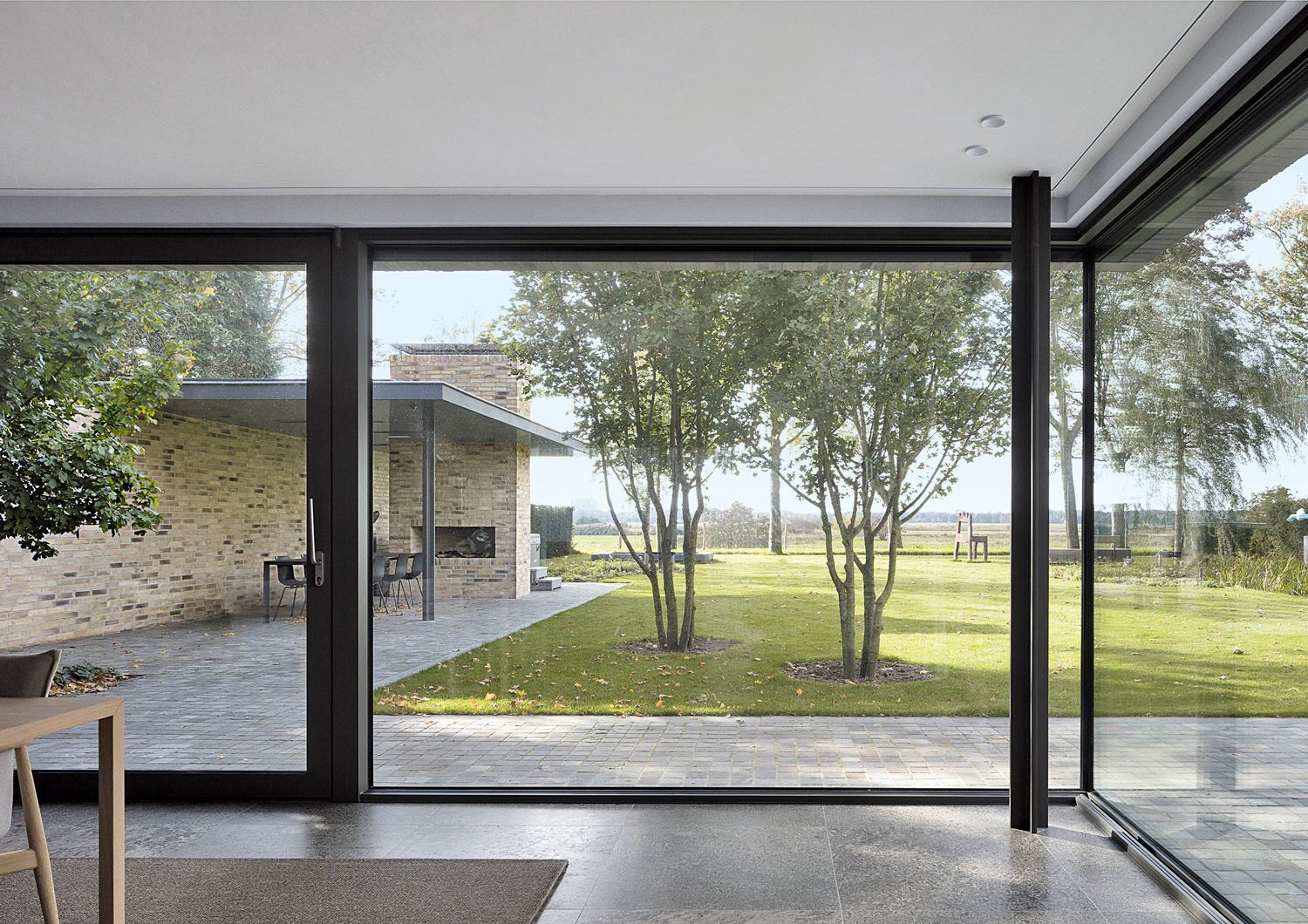 Die Villa Broeck ist ein freistehendes Einfamilienhaus direkt neben einem Naturschutzgebiet in den Niederlanden. In dieser natürlichen Umgebung haben Bedaux de Brouwer Architecten das Haus, den Garten und das Interieur entworfen. Das Grundstück liegt in einer Gruppe von halbmondförmig angeordneten Häusern. Villa Broeck hat dieselbe Form wie die umliegenden Gebäude, wurde jedoch im Verhältnis zu den Nachbarhäusern um 90 Grad gedreht. Durch diese Ausrichtung konnten eine eindrucksvolle Straßenfassade und ein idyllischer Ausblick auf die Natur hinter dem Haus erreicht werden. Darüber hinaus wurden so zwei Terrassen geschaffen: eine im Eingangsbereich und ein vertiefter Innenhof im Garten. Neben dem Hauptbaukörper wurde ein niedrigerer Trakt errichtet, der die Küche enthält. Das Wohnhaus, der Garten und das Interieur stellen untereinander Bezüge her und bilden eine Reihe behaglicher Räume, die inmitten der beeindruckenden Landschaft einen Ort der Ruhe bieten.