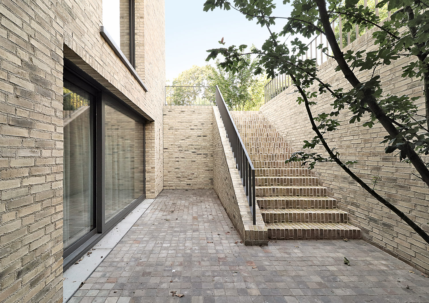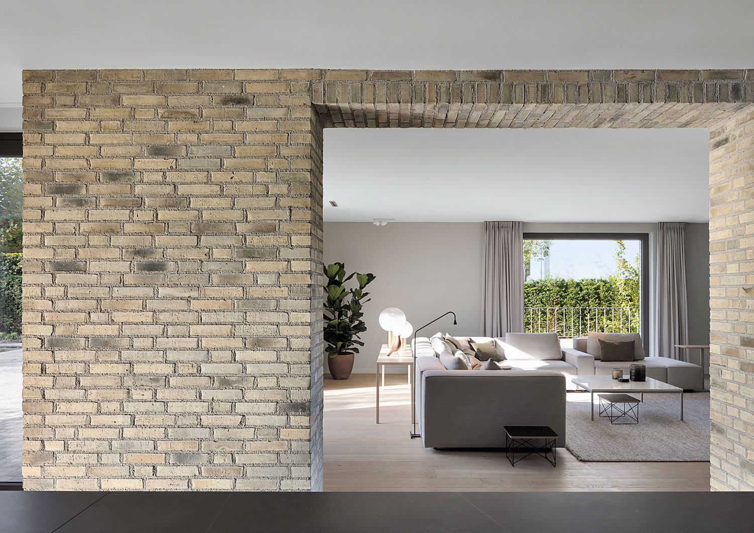 Um die gewünschte Farbpalette zu erreichen, wurde eine speziell auf dieses Projekt abgestimmte Auswahl an Ziegeln getroffen. Das Sichtmauerwerk im Innenraum der Küche und am offenen Kamin verbindet den Außenbereich des Hauses mit dem Innenbereich und sorgt in den verschiedenen Räumen für unterschiedliche Stimmungen. Gleichzeitig verstärkt das Mauerwerk von Gartenmauer, Terrassentreppe und Kamin im Hinterhof die Verbindung mit dem Garten und bildet damit eine Erweiterung in Richtung der umgebenden Landschaft. Die Farbpalette der weiteren Elemente wurde an die des Mauerwerks angepasst, sodass das Innere des Gebäudes ein hohes Maß an Handwerkskunst und Kohärenz aufweist. Jeder Bereich hat durch die verschiedenartige Gestaltung der Öffnungen seine eigene Atmosphäre, während die Abfolge der Räume eine einzigartige und komfortable Wohnumgebung schafft.