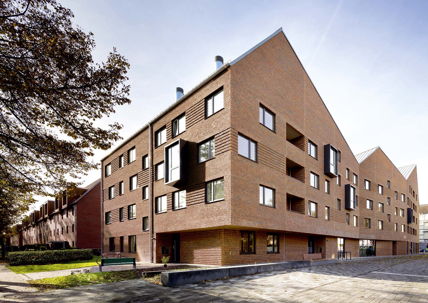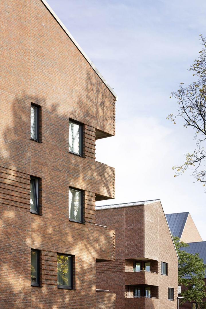 Die Einheitlichkeit des Gesamtquartiers wird dabei besonders durch den Einsatz des mit dem Bestand harmonisierenden Backsteins betont und gestärkt, der auf typische hanseatische Art, reliefartig, mit Vor- und Rücksprüngen akzentuiert eingesetzt und als zweischaliges, kerngedämmtes Mauerwerk ausgeführt wurde. Der Entwurf orientiert sich zudem an den jeweiligen Gebäudefluchten und -höhen der Bestandsbebauung sowie an dem benachbarten Energiebunker und führt auch das Thema der geneigten Dachform des Bestandes fort. Mit ihrer asymmetrischen Satteldachlandschaft und ihren gelegentlichen Hochpunkten markieren die Neubauten das städtebauliche „Tor“ zum Weltquartier und dienen als Orientierung für die gesamte Umgebung. Die 75 öffentlich geförderten Wohneinheiten unterschiedlicher Größe und Wohnform – vom Zweizimmer-Single-Appartement bis hin zur Vierzimmer-Familienwohnung – sorgen für einen abwechslungsreichen Wohnungs-Mix und fördern eine soziale Durchmischung des Weltquartiers.