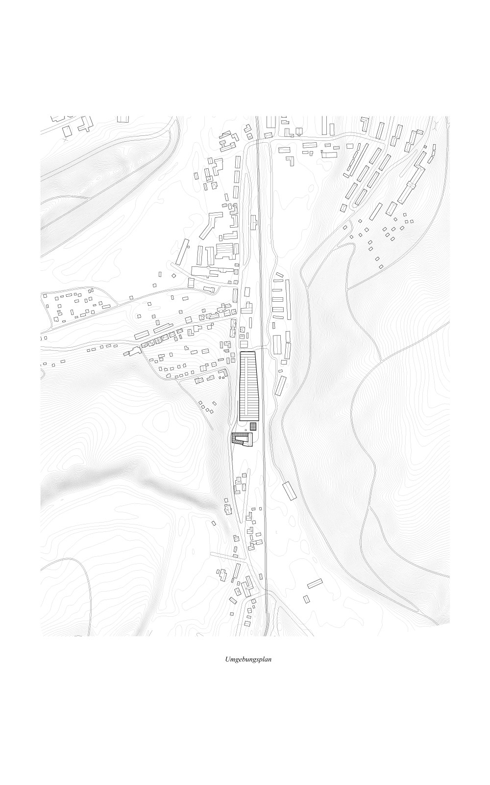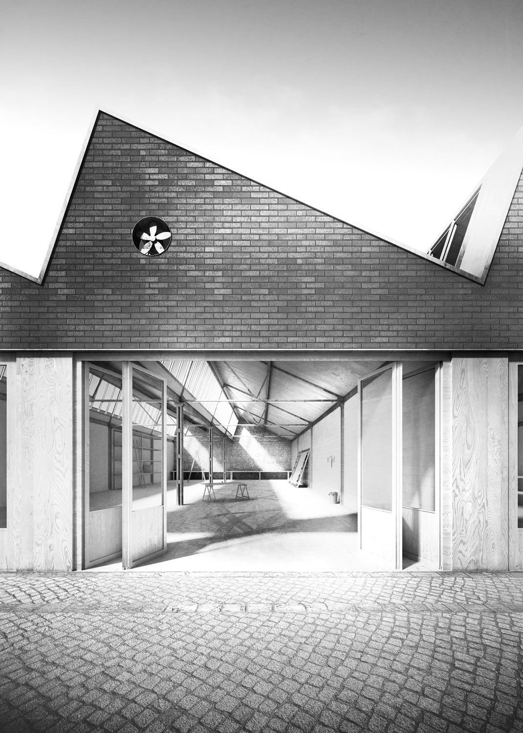 Allerdings besteht die Notwendigkeit die vorhandenen Fragmente mit stadttypischen Typologien zu vervollständigen. Das Projekt versucht hierbei städtebauliche Fragestellungen zu beantworten, in dem die Eingriffe auf den Kontext bezogen formatiert und in ihrem Proportionen und Ausdruck auf die jeweilige Umgebung und Situation hin arrangiert. Klassische Stadtbausteine - Platz, Straße, Innenhof, Fassade - waren hierfür ausschlaggebende Betrachtungsebenen. Dabei war es ein zentrales Anliegen Sehnsuchtsorte zu schaffen, von dem eine suggestive Kraft ausgeht. Die hinzugefügten Baukörper besitzen allesamt einen prägnanten, räumlich-plastischen Charakter und sollen sich unwiderruflich ins Gedächtnis schreiben und in Einklang auf die vorhandene Bebauung, Landschaft der Umgebung, sowie Topographie treten. Die vorhandene Baustruktur der Sheddachhalle bekommt durch den Schnitt über die gesamte Hallenlänge hinweg eine innere Straße, durch die eine neue räumliche Organisation und Parzellierung zu Stande kommt und neue Nutzungspotentiale entstehen. Ein nebeneinander von verschiedensten Nutzungen - Werkstätten, Parkplätze, Läden, Gärtnerei u.ä. - können flexibel ihren Platz finden. Die neu entstandene Fassade ist in ihrer repetitiven Gestalt und den Ziamonikaöffnungsflügeln äußerst flexibel, quasi industriell gedacht, so dass jegliche Halleneinteilung denkbar ist.