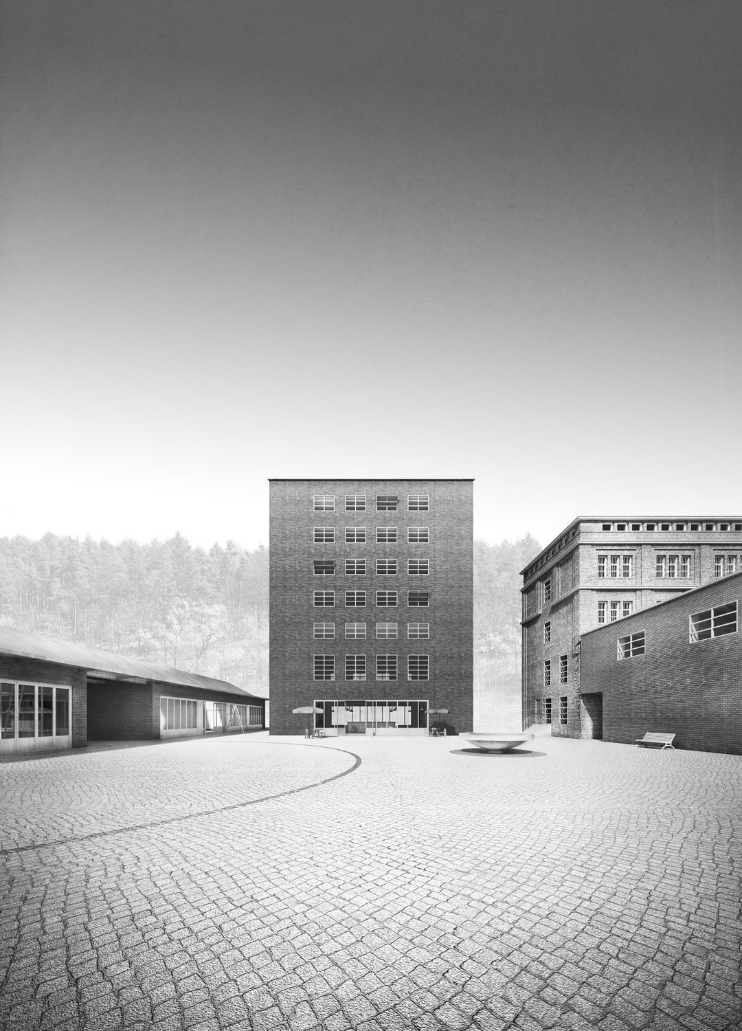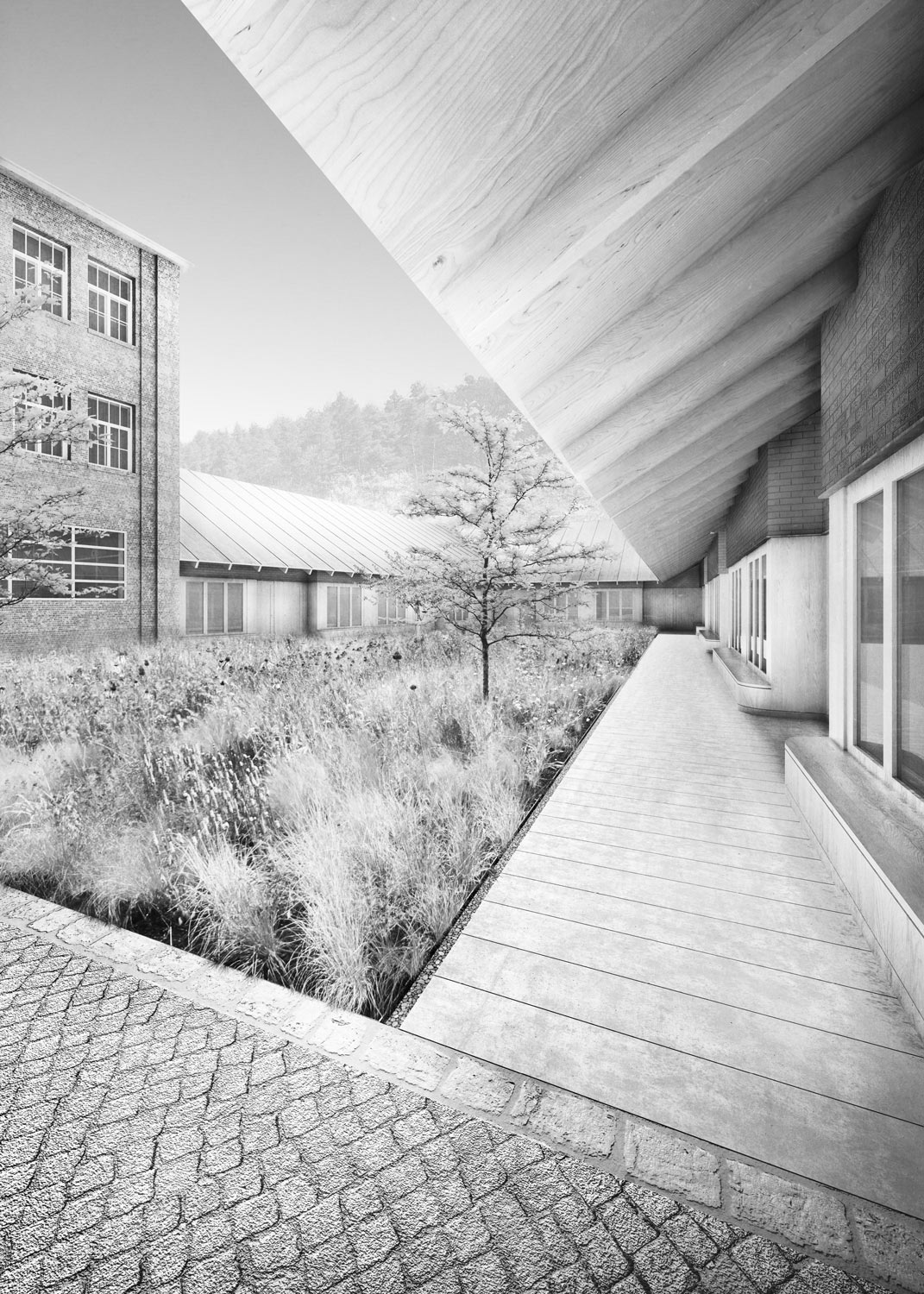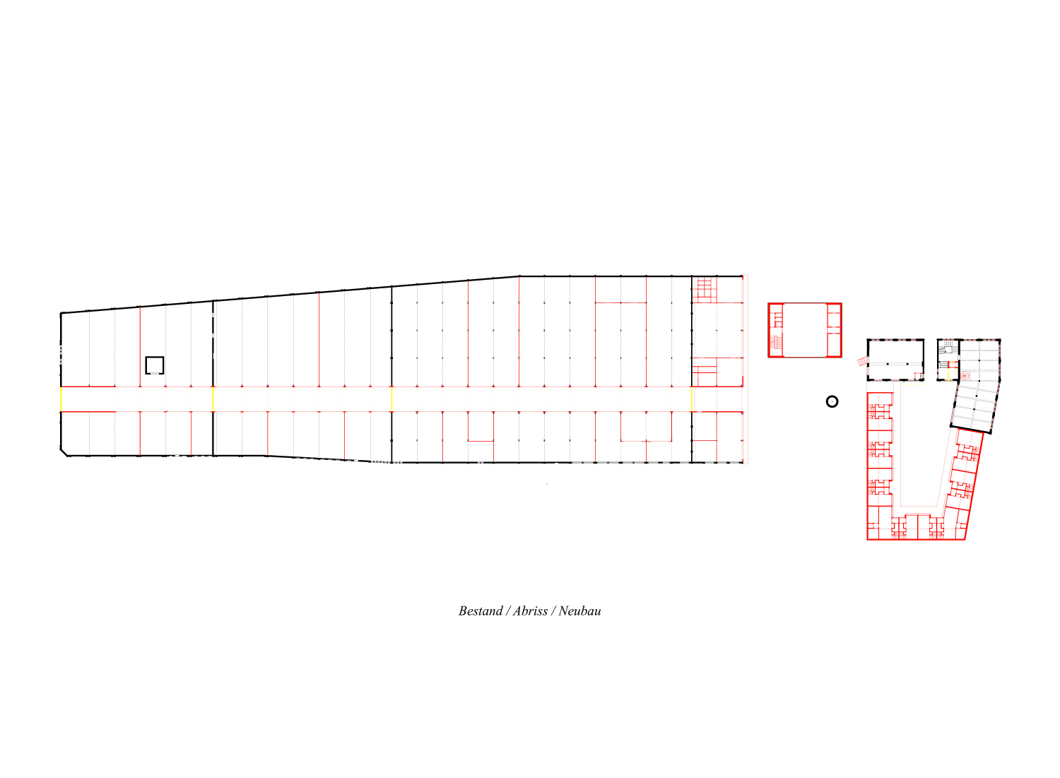 Um ein „Auseinanderfallen“ der beiden entstandenen Teile der Sheddachhalle zu unterbinden, wurden beide Seiten des Hallenendes überdacht gelassen und geben den Eingängen in die Halle einen würdigen Rahmen. Der Solitär versteht sich als Bindeglied und Gelenk zwischen den bisher bestehenden Baukörpern. In seiner Archaik markiert der Solitär schon von weitem diesen Ort und ist das Prägnanteste und zugleich öffentlichste Gebäude. In ihm finden sich ein Café, ein Veranstaltungsraum, ein Seminarraumgeschoss, sowie die Herberge wieder. In seiner Grundrisskonfiguration ist der Solitär pragmatisch, wie effizient gedacht; zwei dienende Funktionsspangen umklammern einen großen auf die Nutzung hinausgerichteten Raumkörper. Das Verwaltungsgebäudes bietet in seinem guten rohbauähnlichen Zustand die perfekte Grundlage für behutsame kleinere Eingriffe. So wird im Inneren der Bau durch eine neue zweite Haut ergänzt, um auch thermischen Anforderung gerecht zu werden.