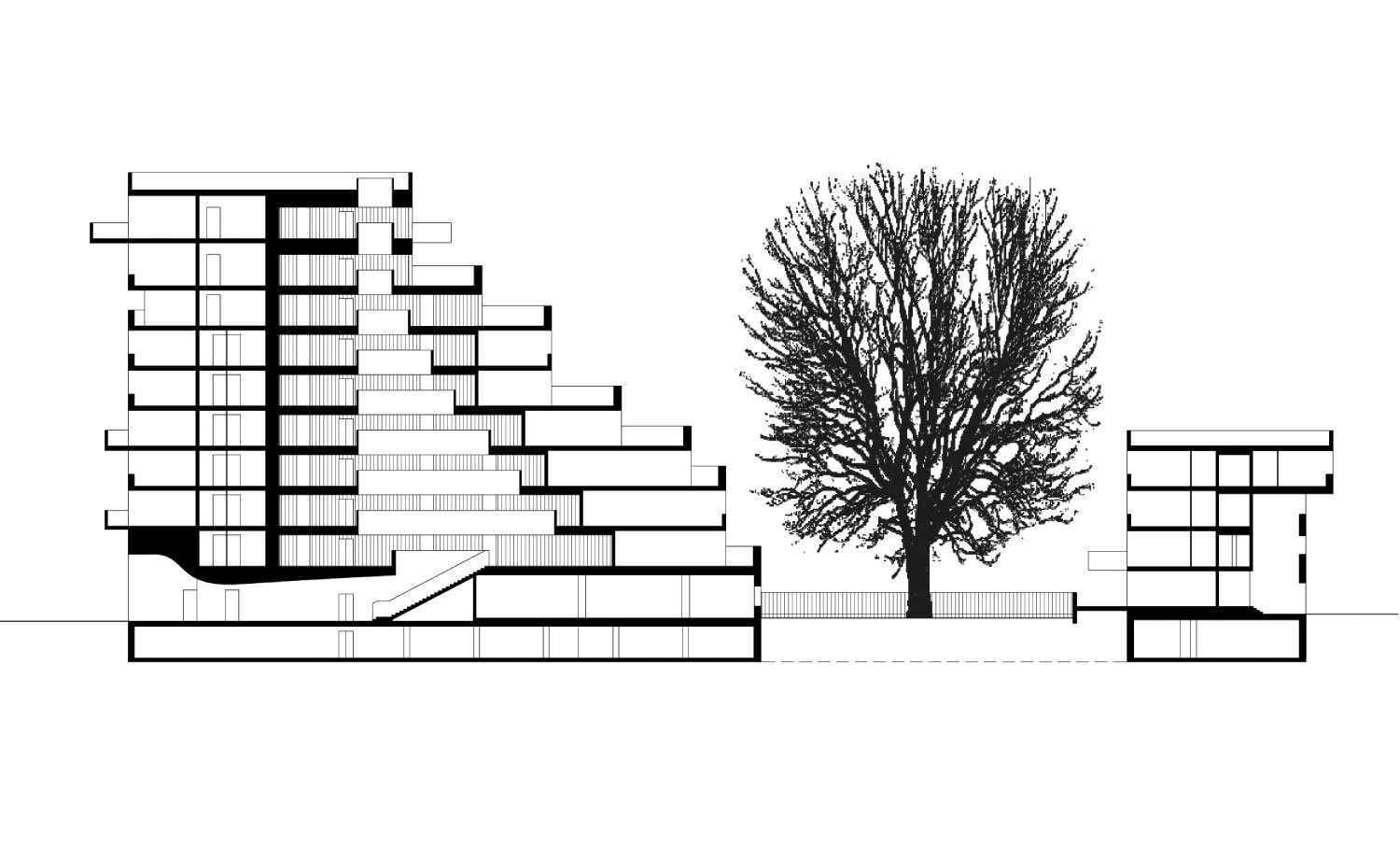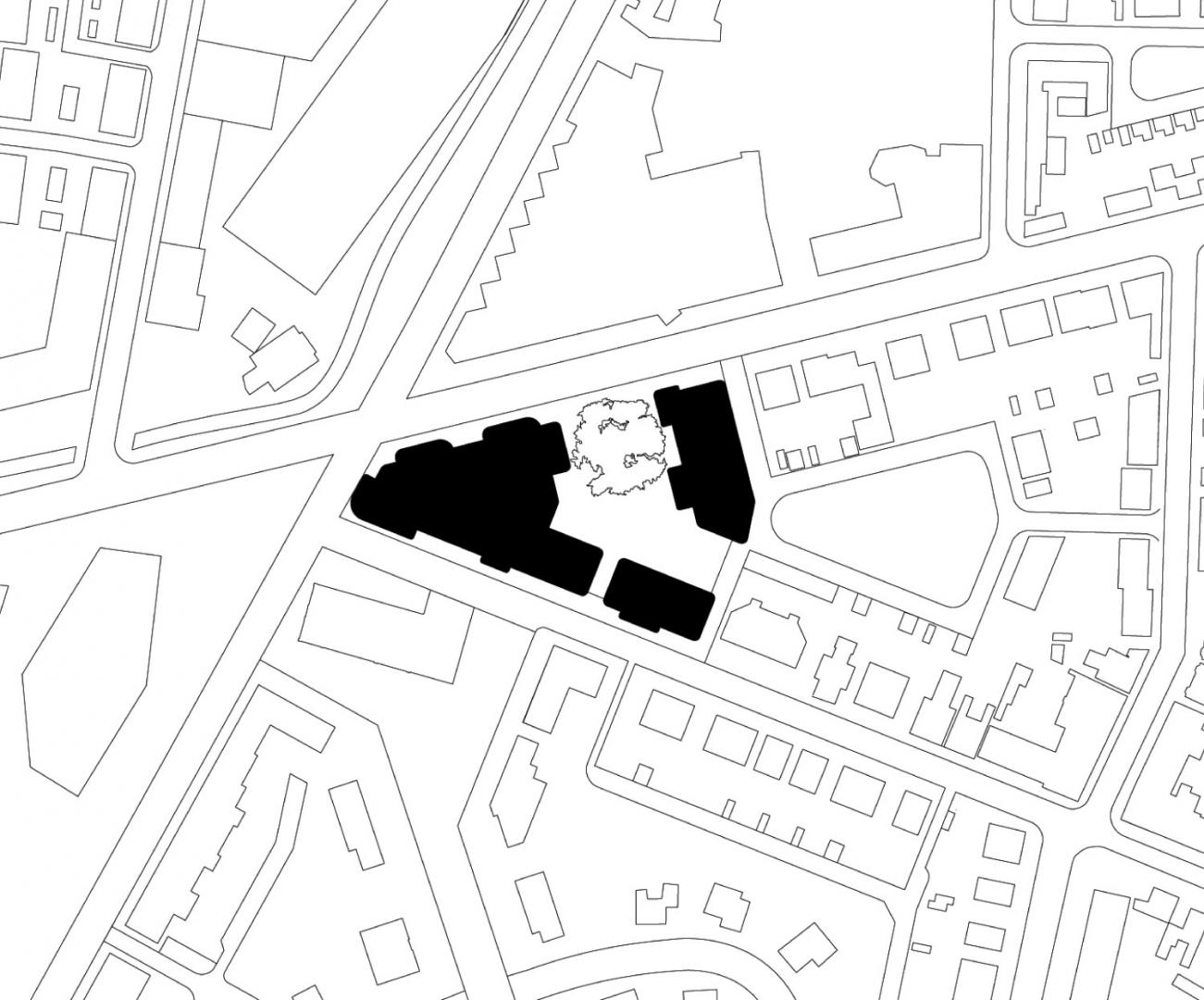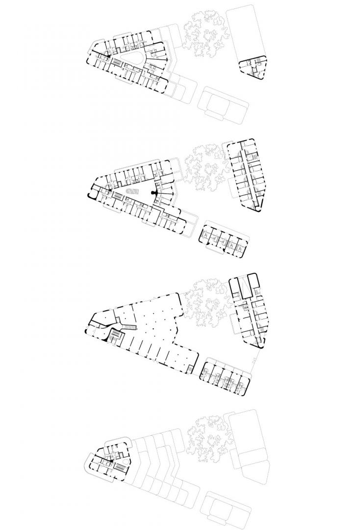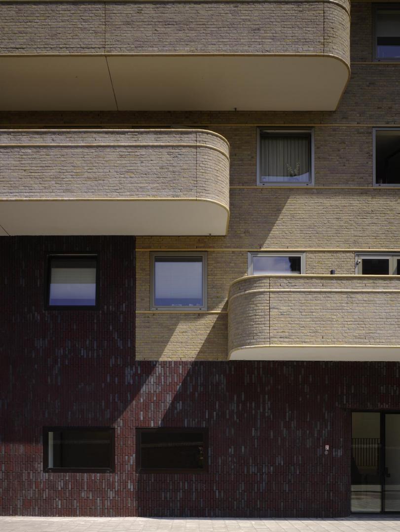 Das Gebäude umfasst eine Kombination aus Pflegeeinrichtungen und Wohnungen: In der Spitze des Dreiecks liegt der Eingang zur Apotheke, im Rest des Sockels verteilt sich das Gesundheitszentrum mit verschiedenen Praxisräumen. Darüber angeordnet 52 Miet- und Kaufapartments in einem 10-geschossigen Gebäude, das auf zurückhaltende Weise eine spektakuläre Komposition aufweist, mit einer fließenden, allseitigen Komposition aus abgerundeten, gelben Backsteinbalkons.