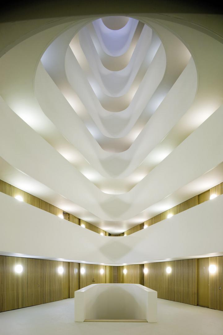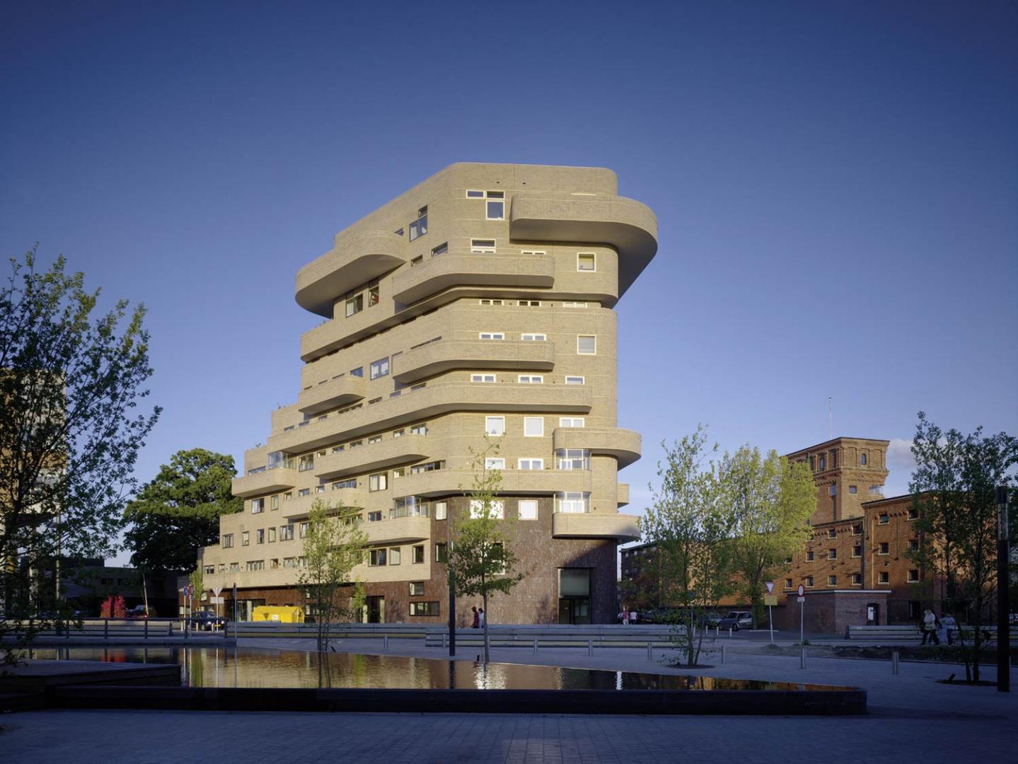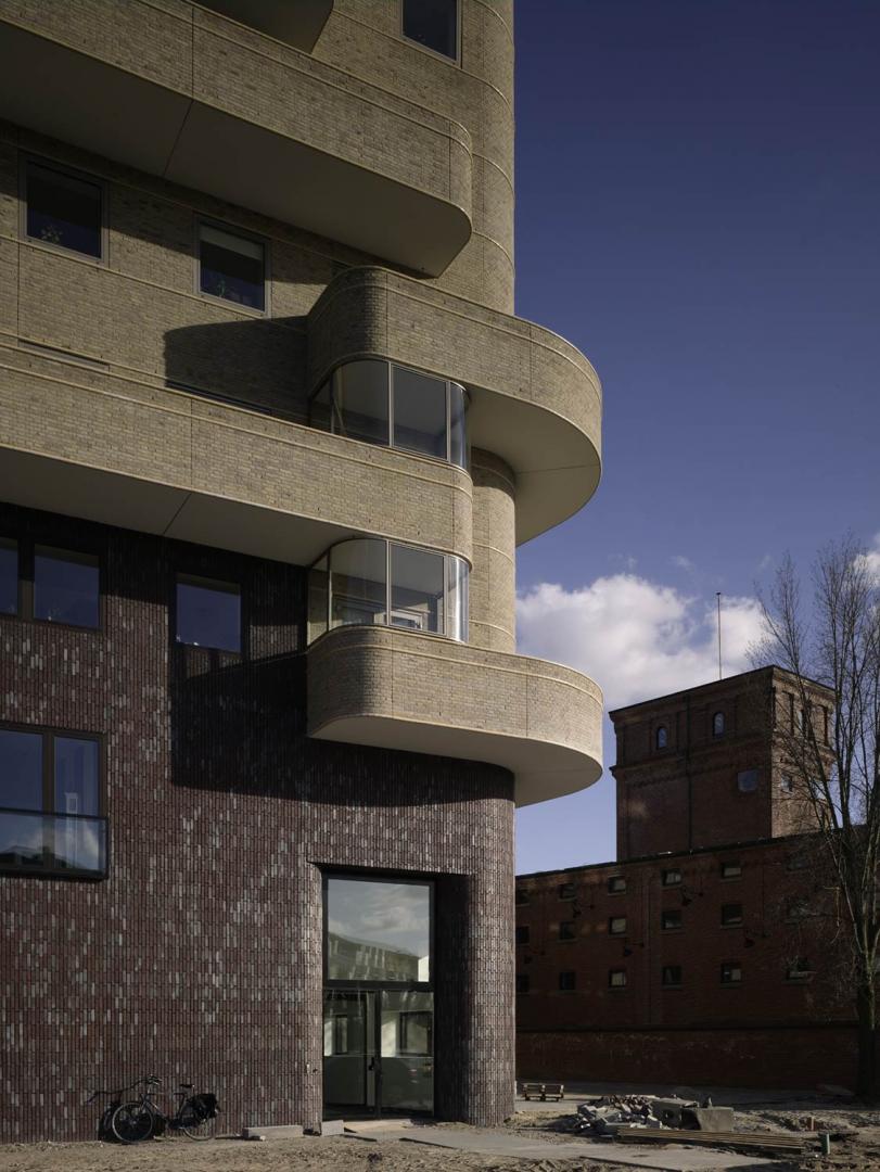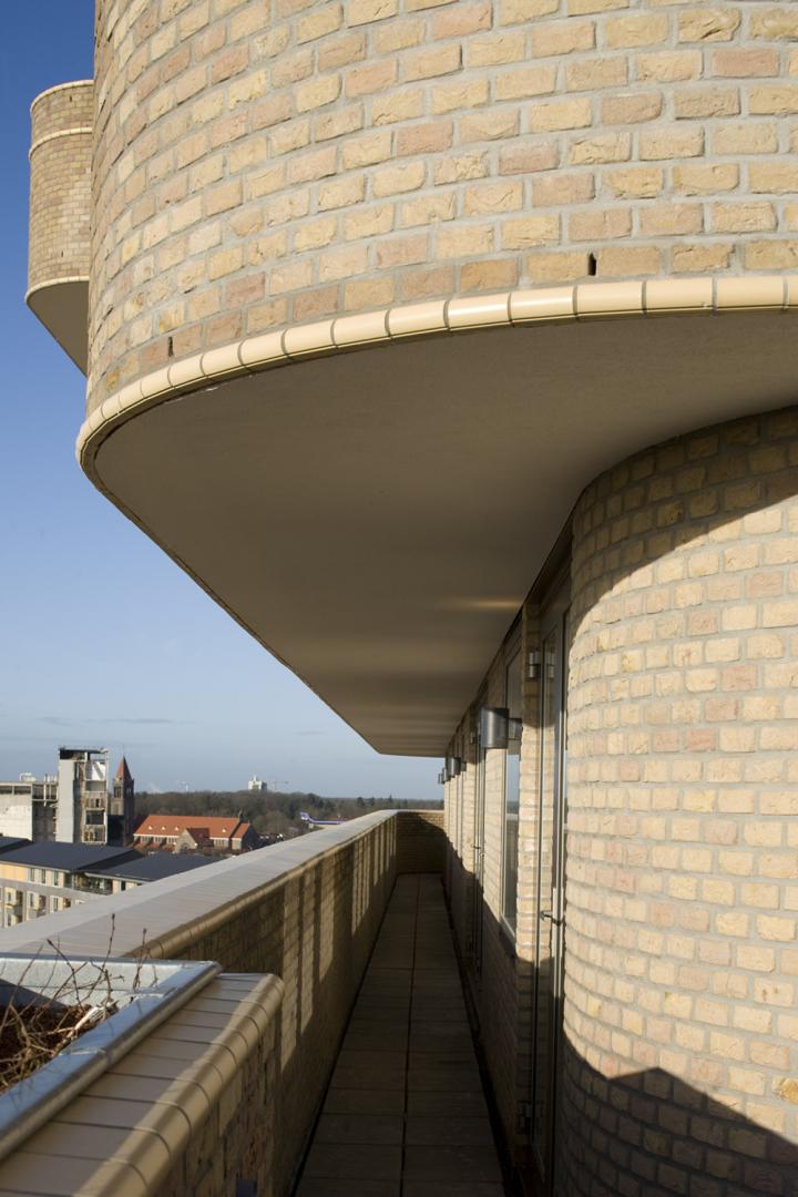 Die Apartments werden zentral über einen kreisförmigen, freien Raum erschlossen, der sich konisch nach oben erstreckt und in einer Lichtkuppel mündet. Die in ihrem Umfang abnehmenden Galerien sind rundum mit einer Wandverkleidung aus Eichenholz verarbeitet. Keine der Wohnungen besitzt denselben Grundriss; bei einer festen Wohnungsbreite variieren sie zwischen 70 und 135 m². Auch die Balkons sind nicht identisch; die meisten sind Fertigpackung, die obersten jedoch, die eine Auskragung von 3 m besitzen, wurden vor Ort an den Fußboden angegossen. Über die gesamte Breite wurden entlang der Balkones Blumenkästen entworfen, damit das Gebäude, das derzeit noch eine Backsteinskulptur besitzt, im Frühling mit hängenden Gärten aufwarten kann. Die Anwohner auf der Ostseite verfügen über große Terrassen auf den Dächern der darunter liegenden Apartments. Durch den Stufenaufbau des Gebäudes, das in östlicher Richtung bis zur Höhe der umgebenden Bebauung hinab ragt (drei Etagen), war der Einbau einer dicken Stabilisierungswand notwendig, um einen Überhang des hohen und durch den leeren Raum hohlen Bereichs zu verhindern.