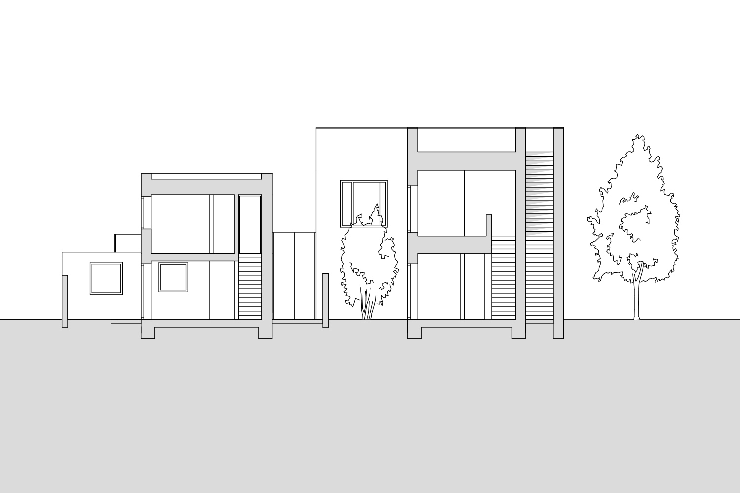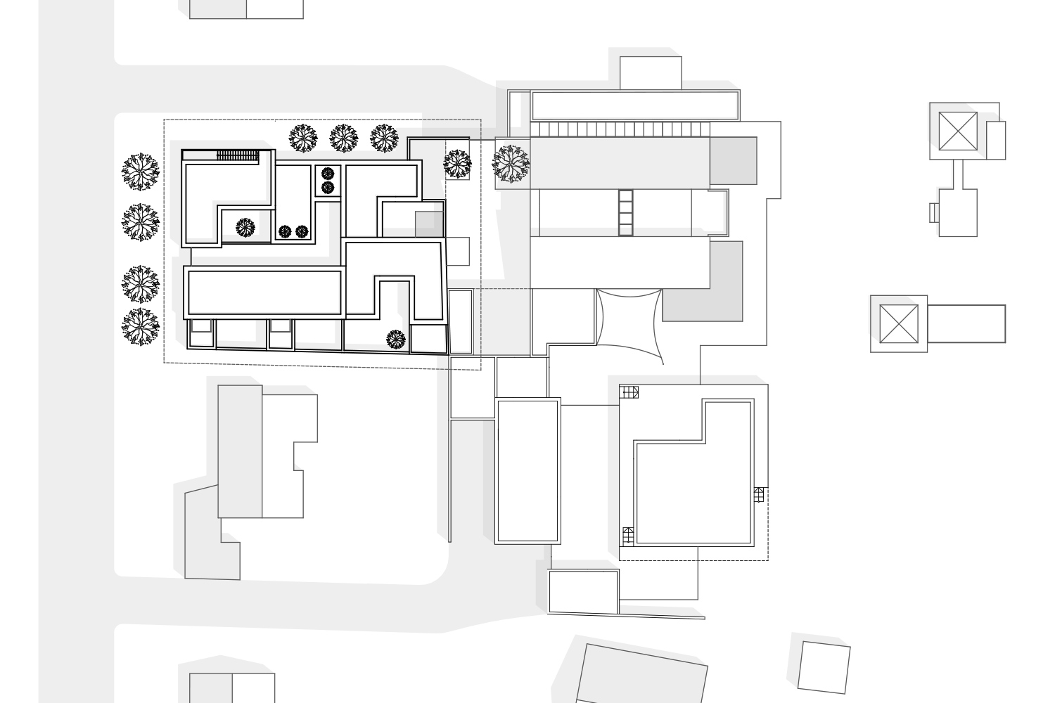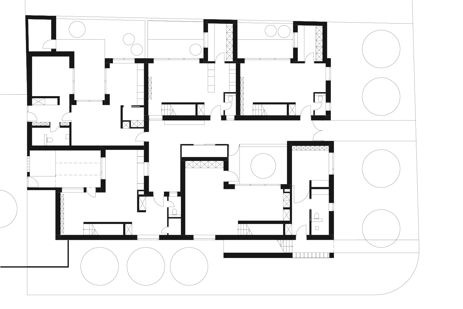 In direkter Nachbarschaft des Architekturbüros entsteht ein Einzelhaus mit sechs Wohneinheiten und Arbeitsräumen in unterschiedlichen Größen. Die Einheiten gruppieren sich um einen Innenhof, der als Erschließung dient und Begegnungsflächen schafft. Jede Einheit verfügt über einen Ausblick ins Grüne oder Terrassenflächen in den oberen Geschossen. Handwerklich wird die Tradition des Mauerwerkbaus aufgegriffen. Durch bewusst gesetzte Öffnungen, die in Kontrast zu geschlossenen Wandflächen stehen, werden Ein- und Ausblicke definiert und die Wechselwirkung des Gebäudes mit seinem Ort intensiviert. Das Entwurfsprinzip sieht vor, für viele Nutzer abwechslungsreiche Innen- und Außenräume, Gemeinschaftsflächen, Rückzugsorte, sowie Arbeits- und Büroflächen zu schaffen. Verbrauch und Versiegelung der Grundstücksfläche werden dabei minimiert. Die Umsetzung dieses Prinzips wird im Detail fortgeführt. Die Fenster werden außen flächenbündig in die Fassade integriert und der Baukörper mit seinen Vor- und Rücksprüngen im Außenraum geordnet, weite Ausblicke in die Landschaft werden gerahmt und gestalterisch betont.
