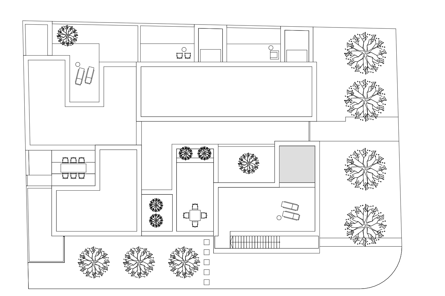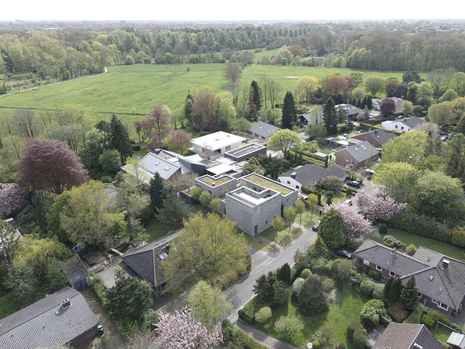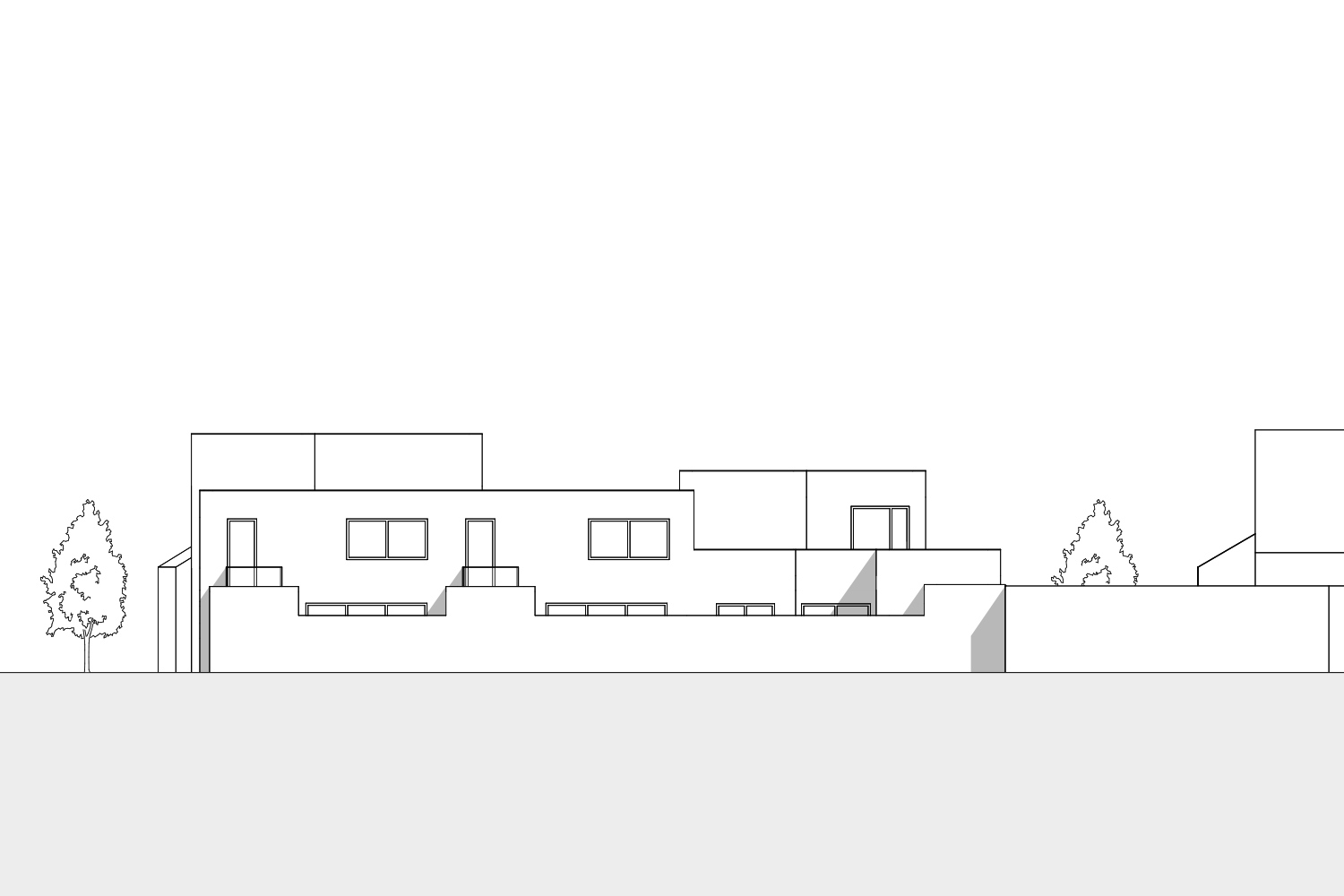 In direkter Nachbarschaft des Architekturbüros entsteht ein Einzelhaus mit sechs Wohneinheiten und Arbeitsräumen in unterschiedlichen Größen. Die Einheiten gruppieren sich um einen Innenhof, der als Erschließung dient und Begegnungsflächen schafft. Jede Einheit verfügt über einen Ausblick ins Grüne oder Terrassenflächen in den oberen Geschossen. Handwerklich wird die Tradition des Mauerwerkbaus aufgegriffen. Durch bewusst gesetzte Öffnungen, die in Kontrast zu geschlossenen Wandflächen stehen, werden Ein- und Ausblicke definiert und die Wechselwirkung des Gebäudes mit seinem Ort intensiviert. Das Entwurfsprinzip sieht vor, für viele Nutzer abwechslungsreiche Innen- und Außenräume, Gemeinschaftsflächen, Rückzugsorte, sowie Arbeits- und Büroflächen zu schaffen. Verbrauch und Versiegelung der Grundstücksfläche werden dabei minimiert. Die Umsetzung dieses Prinzips wird im Detail fortgeführt. Die Fenster werden außen flächenbündig in die Fassade integriert und der Baukörper mit seinen Vor- und Rücksprüngen im Außenraum geordnet, weite Ausblicke in die Landschaft werden gerahmt und gestalterisch betont.