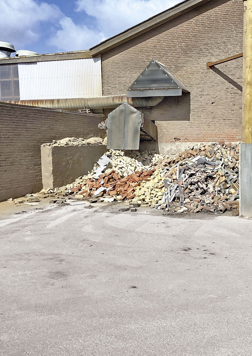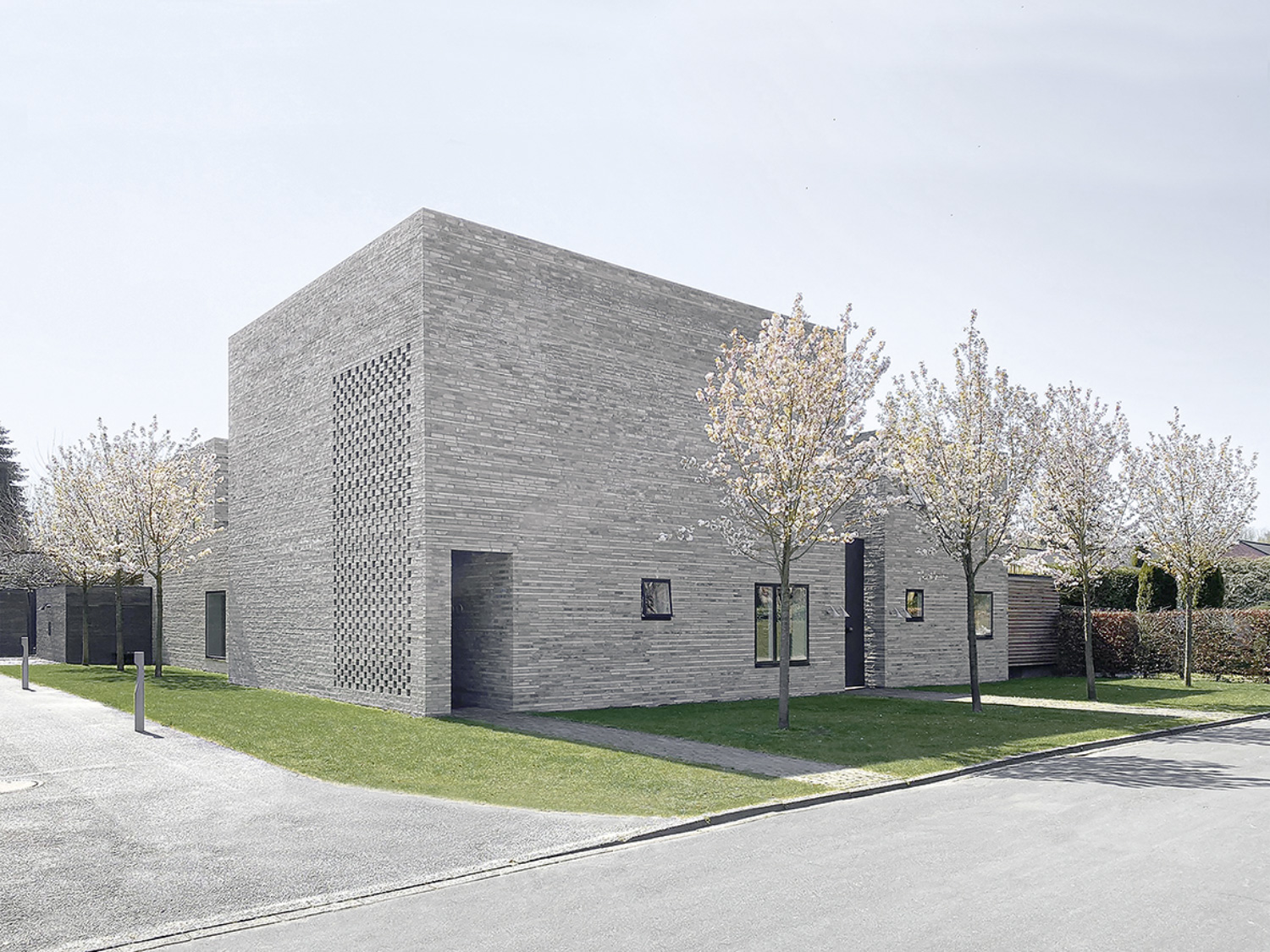 Das Verblendmauerwerk erhält in seinem Verband die Integration von Ausschussware. Dabei handelt es sich um teilweise mehrfach gebrochenen Ziegel des Kolumba-Formats. Im Werk wurde die ursprüngliche Form des Steins für die Auslieferung wieder zusammengesetzt und konnte somit bei den Mauerarbeiten vollständig verwendet werden. Die Risse blieben bei der Verfugung bewusst unberücksichtigt und zeichnen sich somit als besonderes Gestaltungsmerkmal sichtbar ab. Die horizontalen Schichten werden in einem Höhensystem angelegt, das einheitliche Sturzhöhen und quadratische Maße für alle Fenster zulässt. Das Mauerwerk wird in vier verschiedenen grau-grünen Farbtönen und vier verschiedenen Formaten ausgeführt. Der Fugmörtel wurde in Zusammenarbeit mit Firma Steba als Fertigmörtel in Ziegel- bzw. Tonfarbe entwickelt und ermöglicht das Vermauern der Steine in einem Zug. So kann auf das nachträgliche Verfugen verzichtet werden. Durch die Reihenfolge der Verbände und Farbtöne wirken die Außenwände im unteren Bereich gedrungen und dunkler und nach oben hin vertikaler und heller. Der Innenwandputz wird ohne Zementzusätze realisiert und mit Kalkfarben gestrichen.