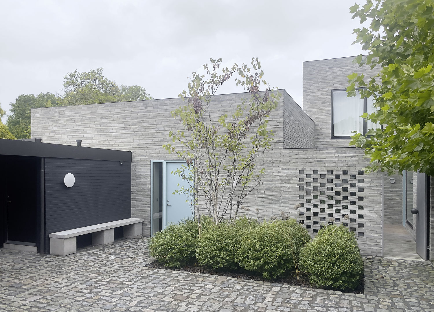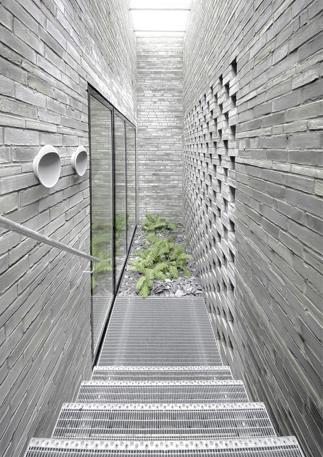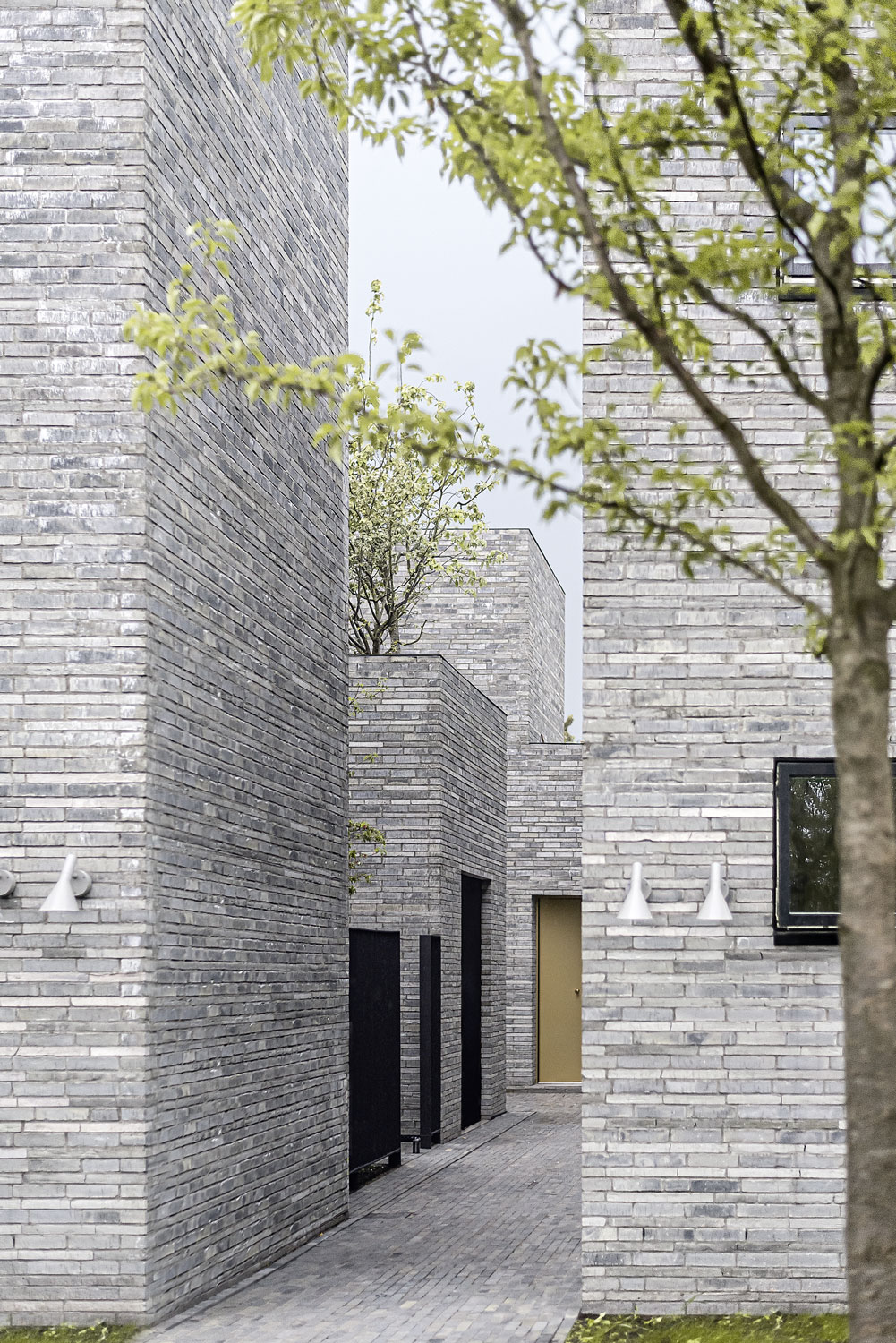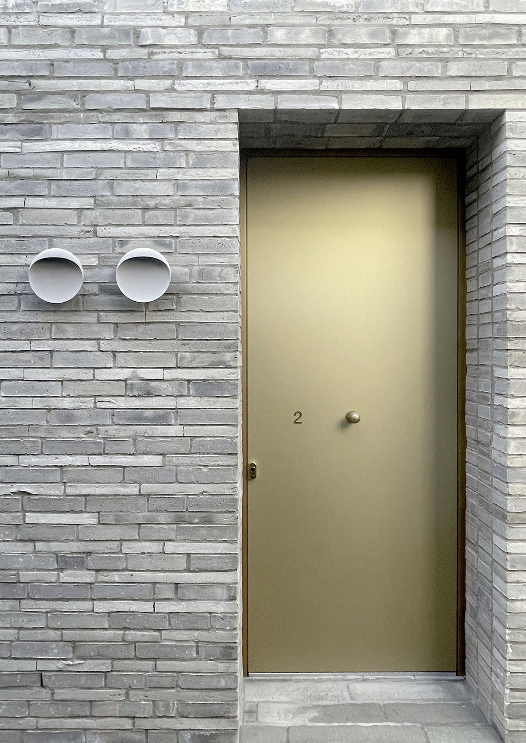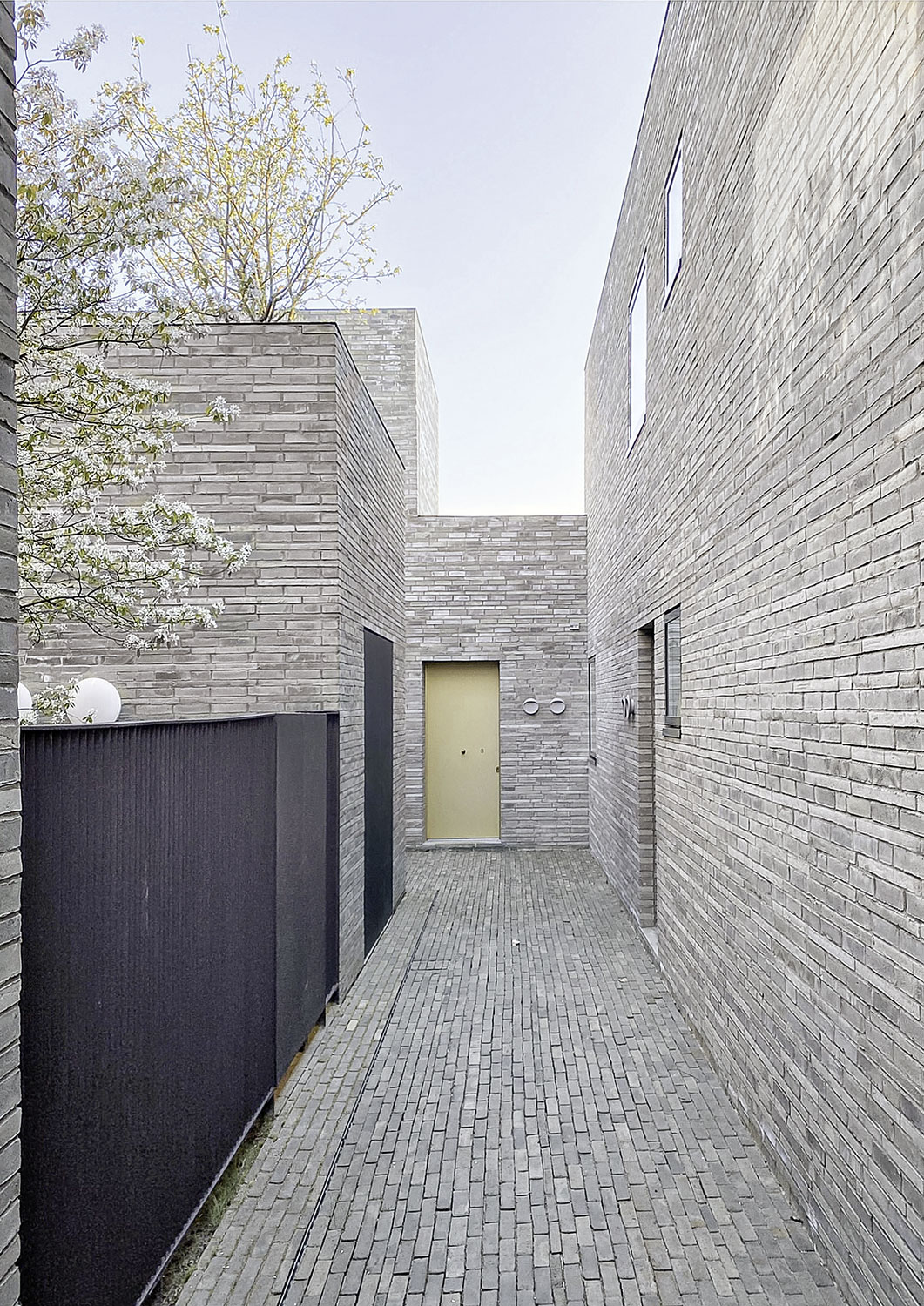 Die effizienten Innenraumgrößen erhalten durch die tiefen Laibungen eine großzügige Wirkung. Die Eingangstüren werden innen flächenbündig in Ebene des Wandputzes integriert, außen wird eine tiefe Laibung durch das Mauerwerk gebildet. Neben der gestalterisch einladenden Geste stellen die Rücksprünge einen Witterungsschutz für die Eingangsbereiche dar. Die Grunddefinition für die Benutzung sämtlicher Öffnungen wurde in der Gestaltung umgesetzt. Private Gärten und Innenhöfe werden von den Gemeinschaftsflächen mittels durchlässigen Begrenzungen aus Flachstahl-Lamellen und Gittermauerwerk getrennt. Einblicke werden reduziert, räumliche Wirkungen und Einblicke in die Gartengestaltung bleiben für alle Nutzer erhalten.