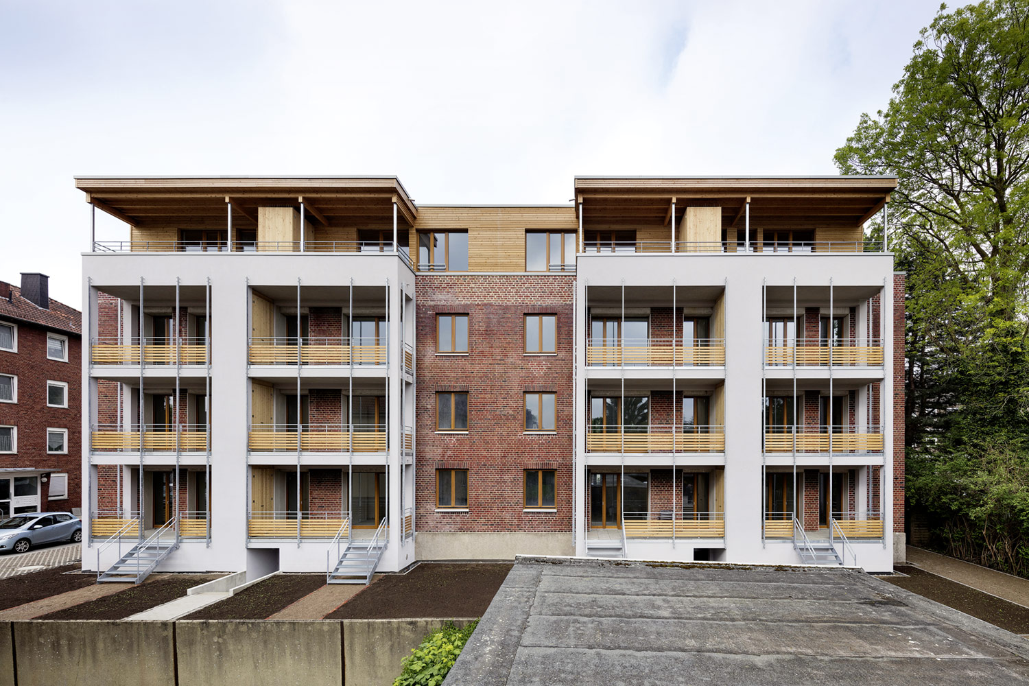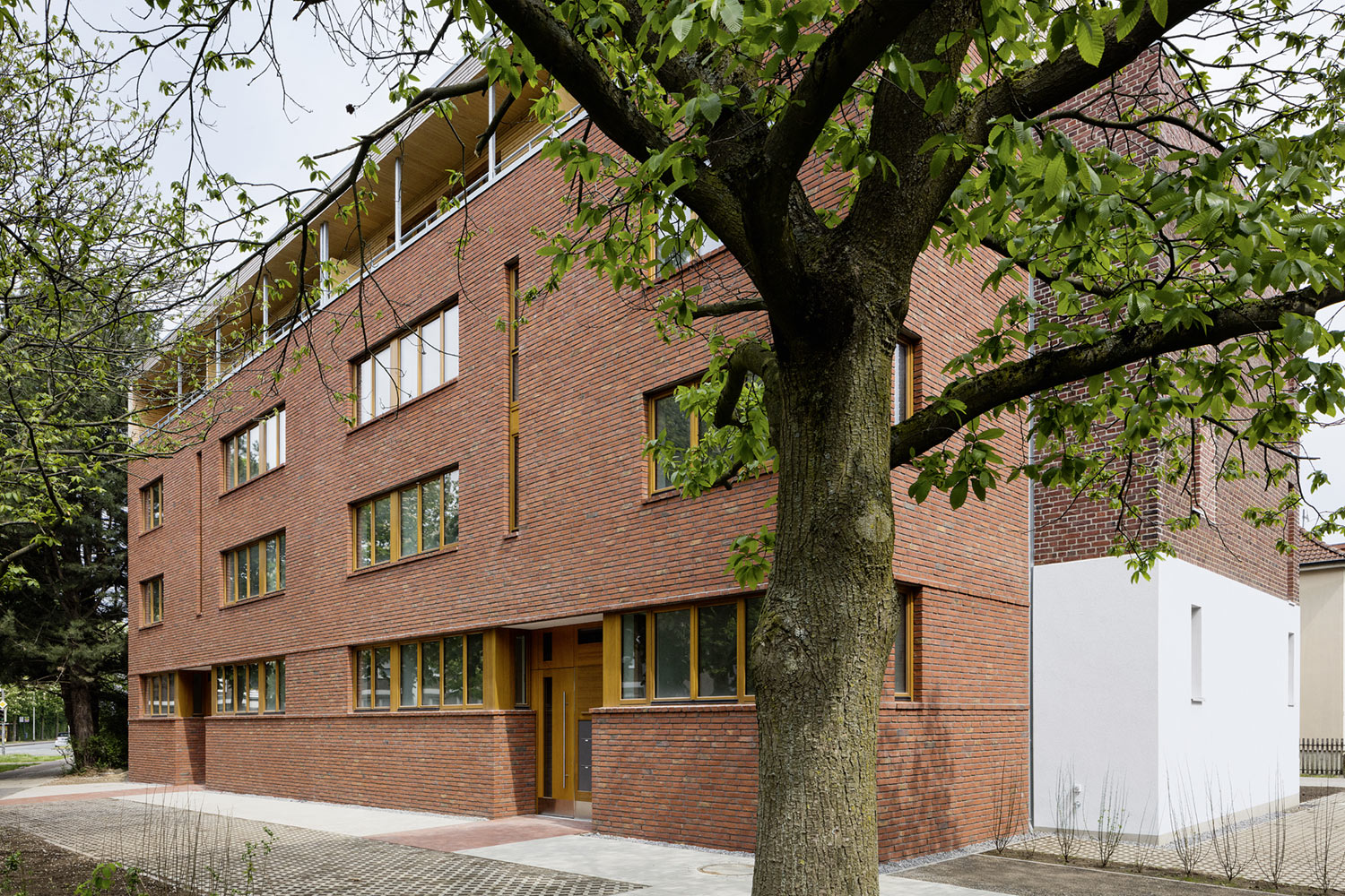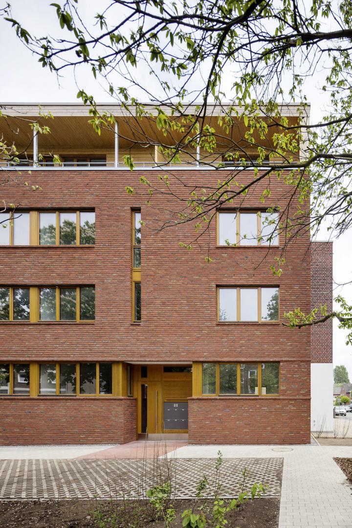 16 moderne, großzügige Wohnungen sind heute Teil eines sanierten Backstein-Altbaus in Münster. Ein Anbau mit Holzbau-Elementen unterstreicht zusätzlich die spezielle Kombination aus Alt und Neu.