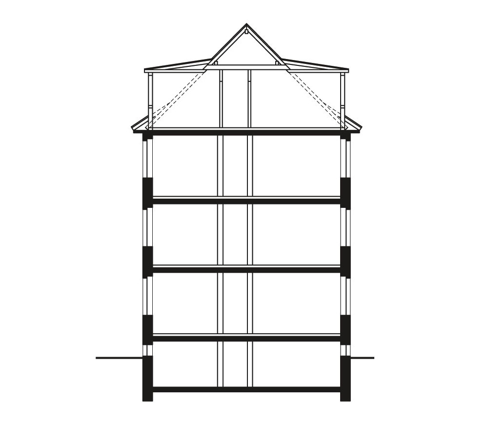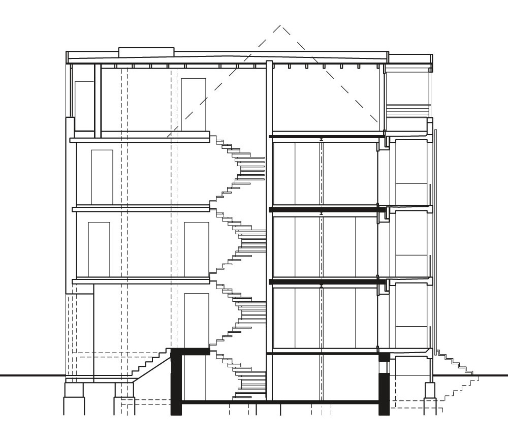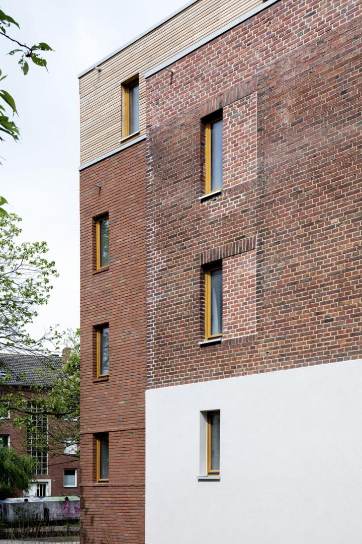 Die massiven sichtbar belassenen Backsteinwände des Altbaus regulieren mit ihrer speicherfähigen Masse das Raumklima. Aus dem robusten und etwas düsteren Altbau ist durch Transformation und Weiterbauen ein komplexes Gebäude entstanden, dessen einzelne Bauglieder durch Material und Bauzeit klar ablesbar sind. Das schöne Backsteinmauerwerk des Altbaus, der etwas hellere Backstein des Anbaus aus einer kleinen westfälischen Ziegelei, das wie eine Klammer wirkende Staffelgeschoss und die Loggien, verputzt wie der Sockel des Altbaus und als eigenständiges Bauwerk vor die Backsteinfassade gestellt, erscheinen wie aus einem Baukasten zusammengefügt. Im Ergebnis erscheint das Gebäude trotz größerem Volumen differenzierter, weniger massig und einladender als der Ursprungsbau.