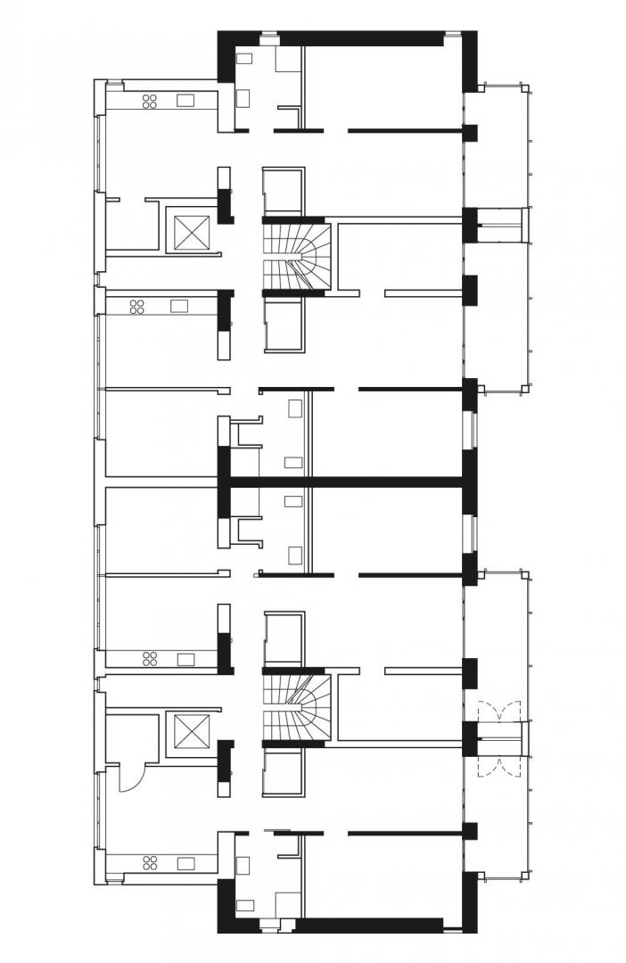 Alle Wohnungen sind nach einem ähnlichen Prinzip organisiert: Der große Raum im Anbau zur Straße ist der Multifunktionsraum für Kochen und Essen. Die sichtbar belassene Backsteinwand des Altbaus wird hier zur Innenwand. Die Räume zur ruhigen Hof-/ Gartenseite sind in ihrer Nutzung nicht definiert. Alle Räume zur Hofseite verbinden sich durch Fenstertüren mit der großzügigen Loggia, die einen wettergeschützten Außenraum bietet. Die vier Wohnungen im EG haben eine direkte Verbindung mit ihrem privaten kleinen Garten.
