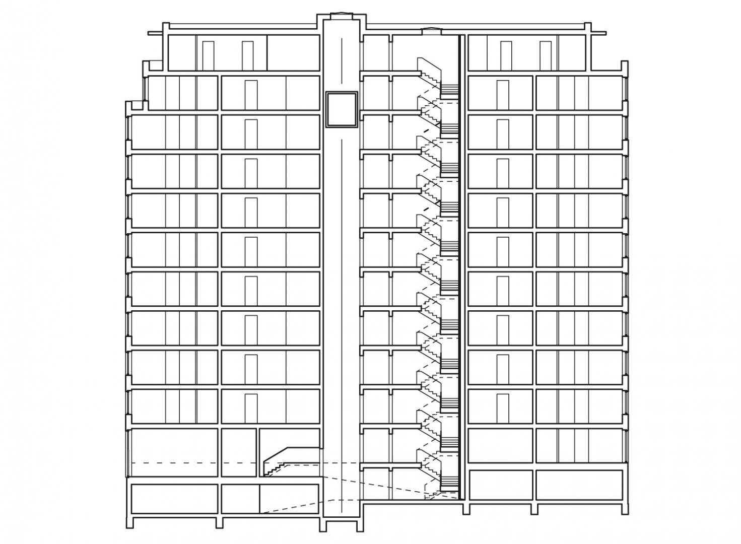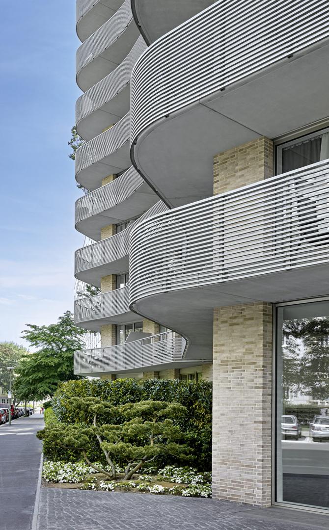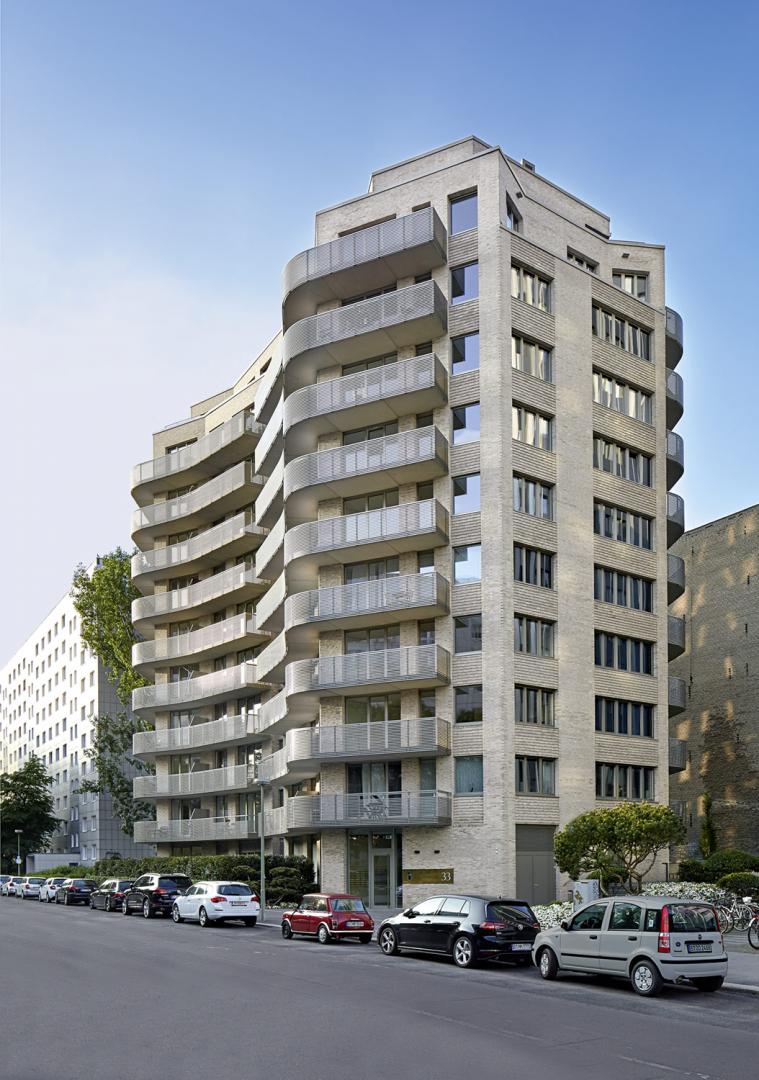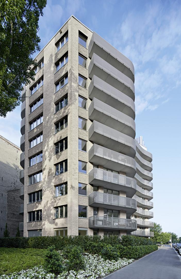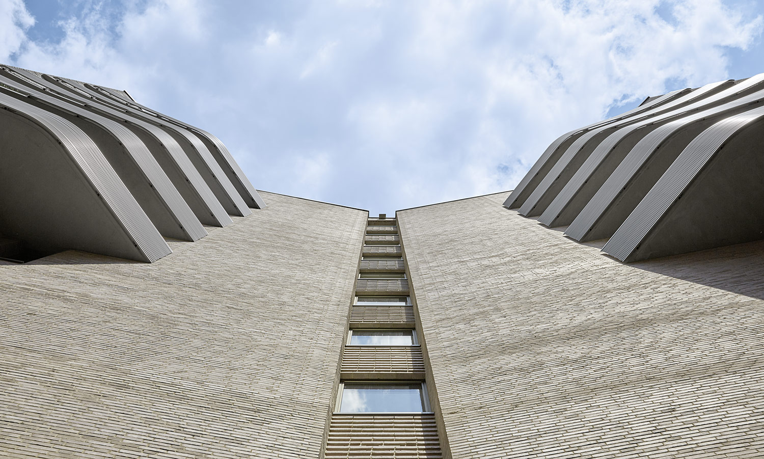 Das Gebäude ist in Stahlbeton-Skelettbauweise mit nicht tragenden Wohnungstrennwänden und einer hochwärmegedämmten Klinkerfassade konstruiert. Raffinierte Vor- und Rücksprünge in dem warm-grauen Klinkermauerwerk erzeugen ein spannendes Licht- und Schattenspiel und geben der Fassade ihre Struktur. Vertikale Glasfugen als Pfosten-Riegel-Konstruktion durchbrechen die horizontalen Balkonbänder und proportionieren die breiteren Gebäudefassaden. Die champagnerfarbenen Holz-Alu-Fenster sowie die großzügig horizontal geschwungenen Balkongeländer verleihen zusammen mit dem Klinker dem Wohnhochhaus eine elegante Leichtigkeit.