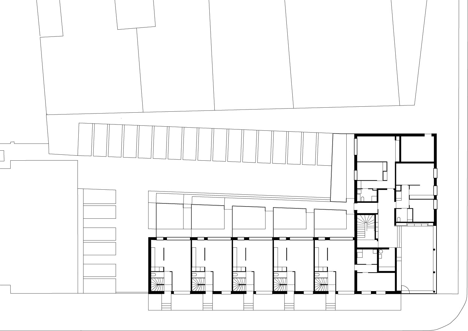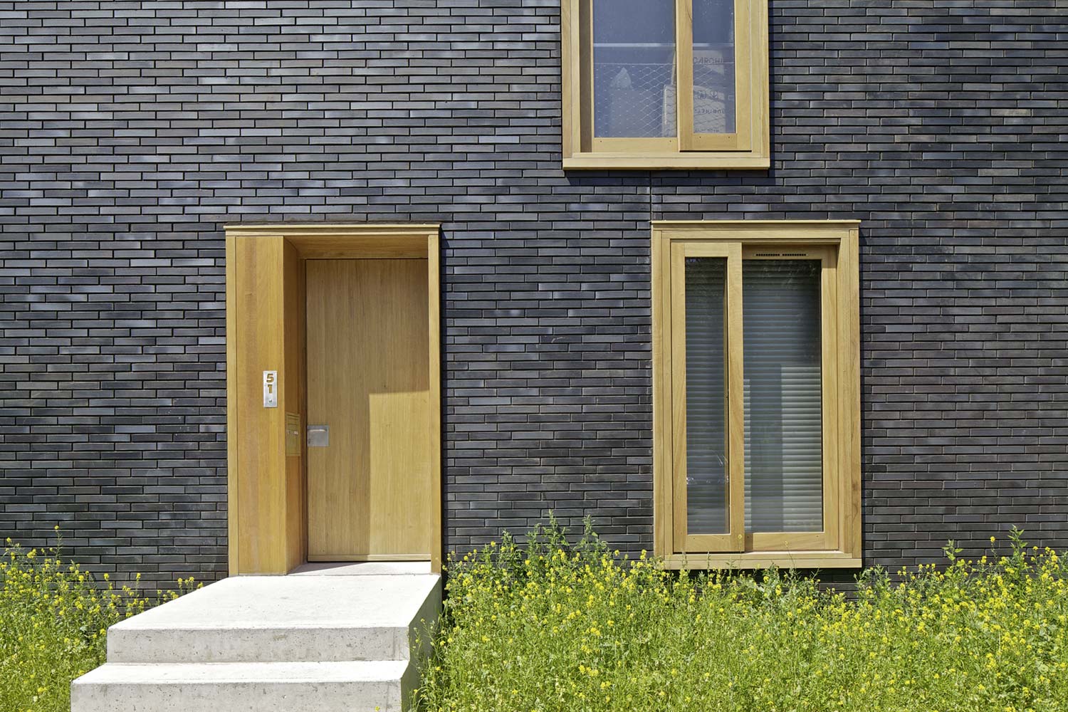 Ein kleines Landschaftsprojekt im Innenhof unterstützt diesen Ansatz. Die Haustüren der einzelnen Häuser sind mit Klingeln und Briefkästen versehen, ausladende Vordächer bieten Schutz vor der Witterung. Die baulichen Elemente leiten unmerklich über von den öffentlichen zu den privaten Bereichen, wobei der Eingangsbereich architektonisch so gestaltet ist, das die Bewohner sich beim Durchqueren der Gemeinschaftseinrichtungen zusehends „zu Hause“ fühlen. Die Fenster und Ziegelsteine wurden sorgfältig ausgewählt und verwendet. Die Außenwände sind als Doppelwände mit Beton, Isolationsmaterial und Ziegelsteinen gestaltet. Der Eingangsbereich weist Schiebetüren aus tropischem Movingui-Holz auf und nimmt einen eigenen Raum ein. Die Ausbuchtung nach draußen erweitert die bauliche Anlage und belebt die Fassaden durch die wandernden Schatten.