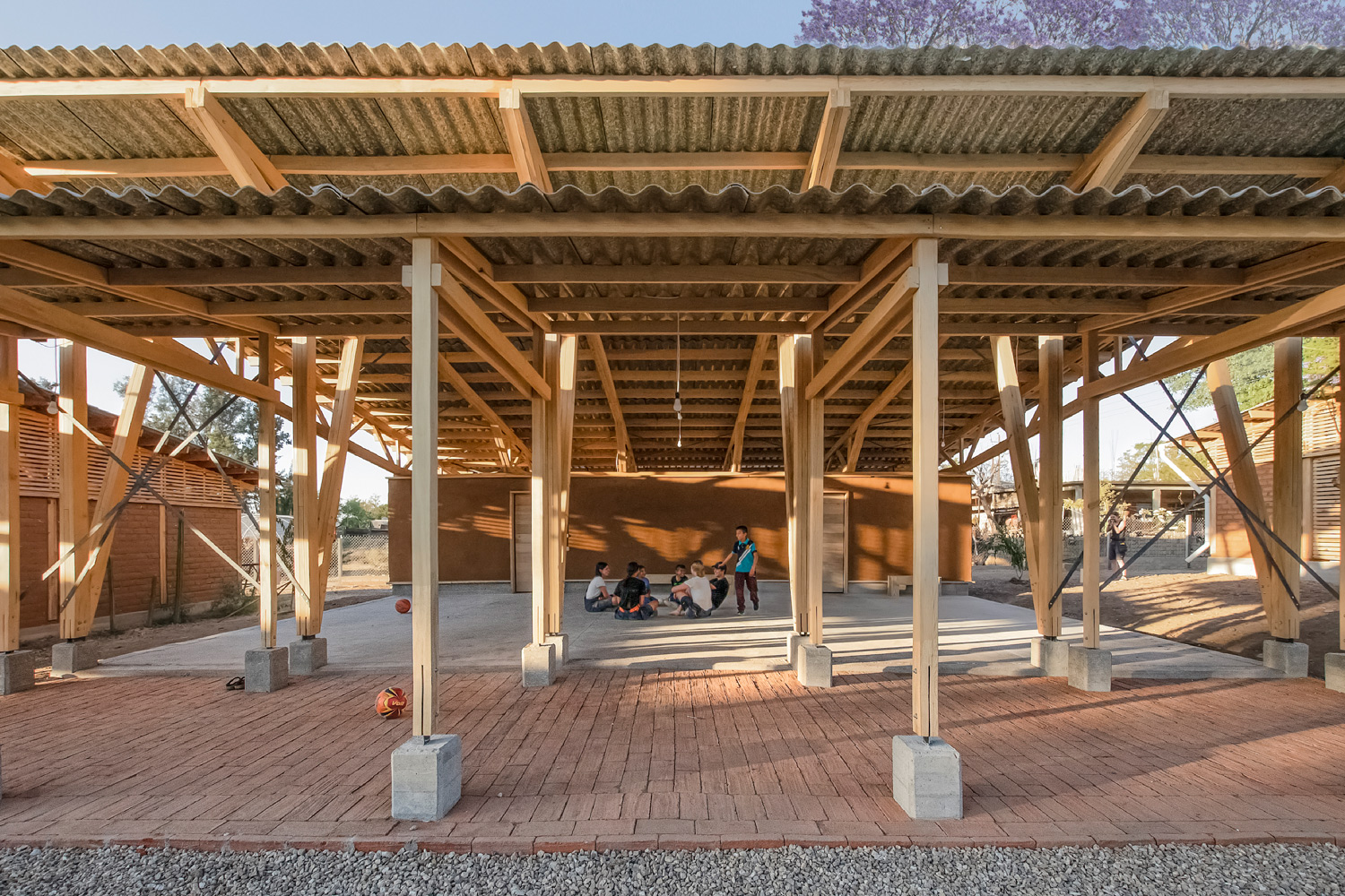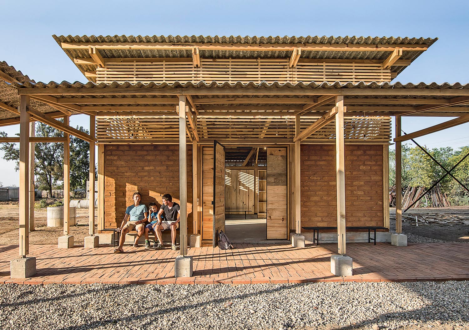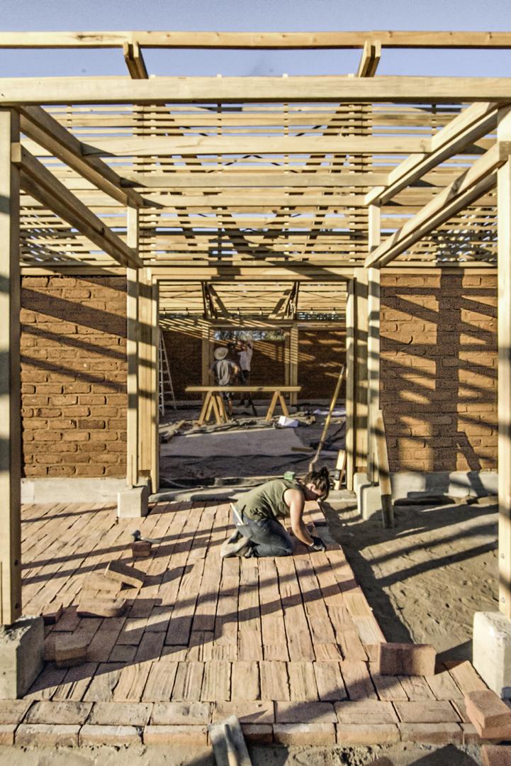 Erdbebengerechtes Bauen, einfache und kostengünstige Bautechnologie, die Verwendung von lokalen, ökologischen und nachhaltigen Materialien wie Lehmstein und Ziegel, die Beachtung von Akzeptanz und Angemessenheit, aber auch die Machbarkeit in einem knappen Zeit- und Kostenrahmen waren die wichtigsten Entwurfskriterien. Alle Gebäude orientieren sich durch ihre ansteigenden Pultdächer am zentralen Platz. Für Küche, Sanitärgebäude so wie Aula wurde ein schwellenloser, modularer Holzständerbaugewählt, dessen Außenwände mit nichtgebrannten Lehmsteinen ausgefacht oder auch mit modulgroßen Fensterelementen, Türen oder Holzlamellen gefüllt sind. Den Rücken der Halle bildet eine Box aus Holzrahmenelementen, die in traditioneller Weise mit einem Lehmputz (Bajareque) verkleidet ist. Alle Dächer sind mit Wellplatten aus recyceltem Tetrapack gedeckt. Das Galerieband erhielt einen Boden aus lokal gebrannten Ziegeln. Das helle Rot der Ziegel, das Braun des ungebrannten Lehms und die Farbe des Holzes bestimmen den Charakter des Zentrums und geben ihm eine warme, willkommen heißende Atmosphäre.
