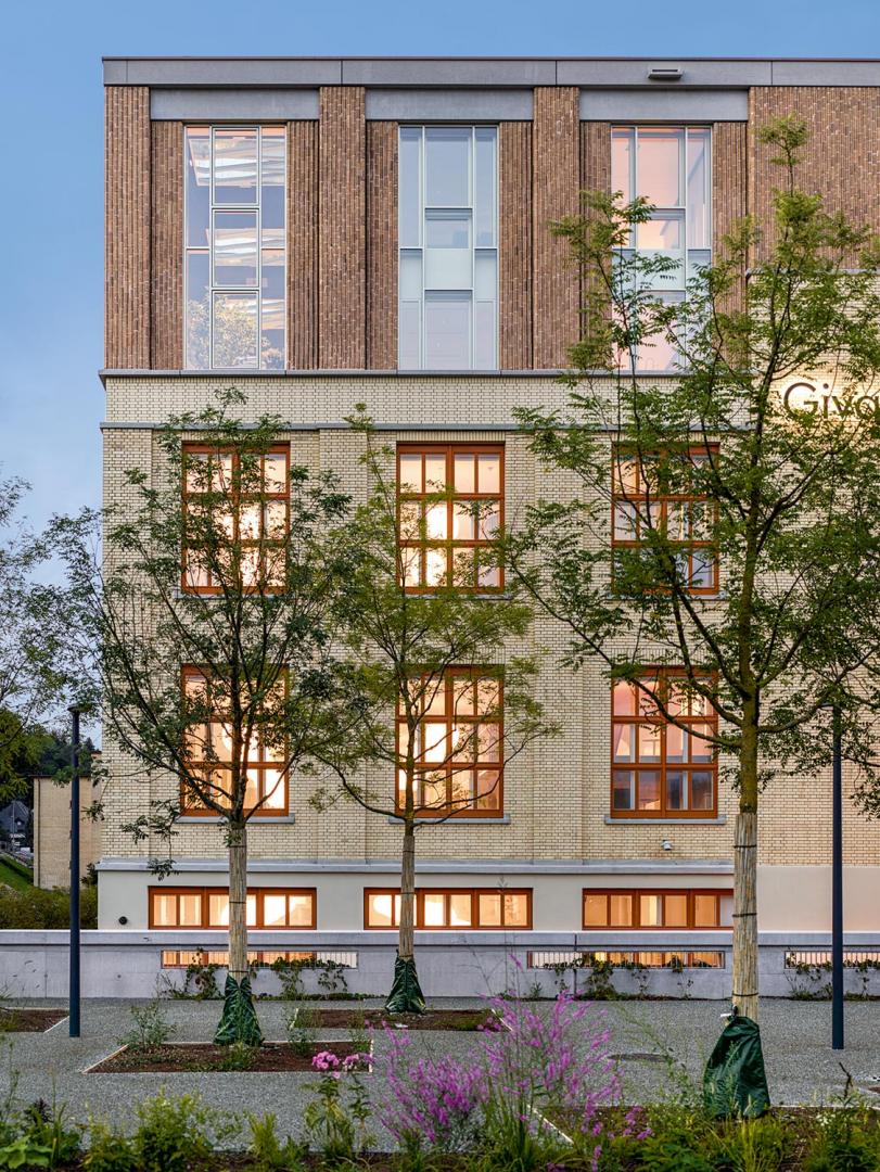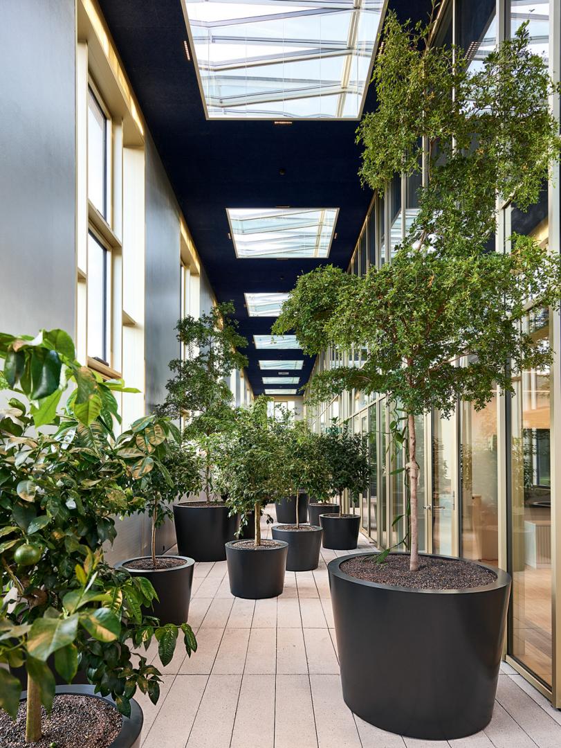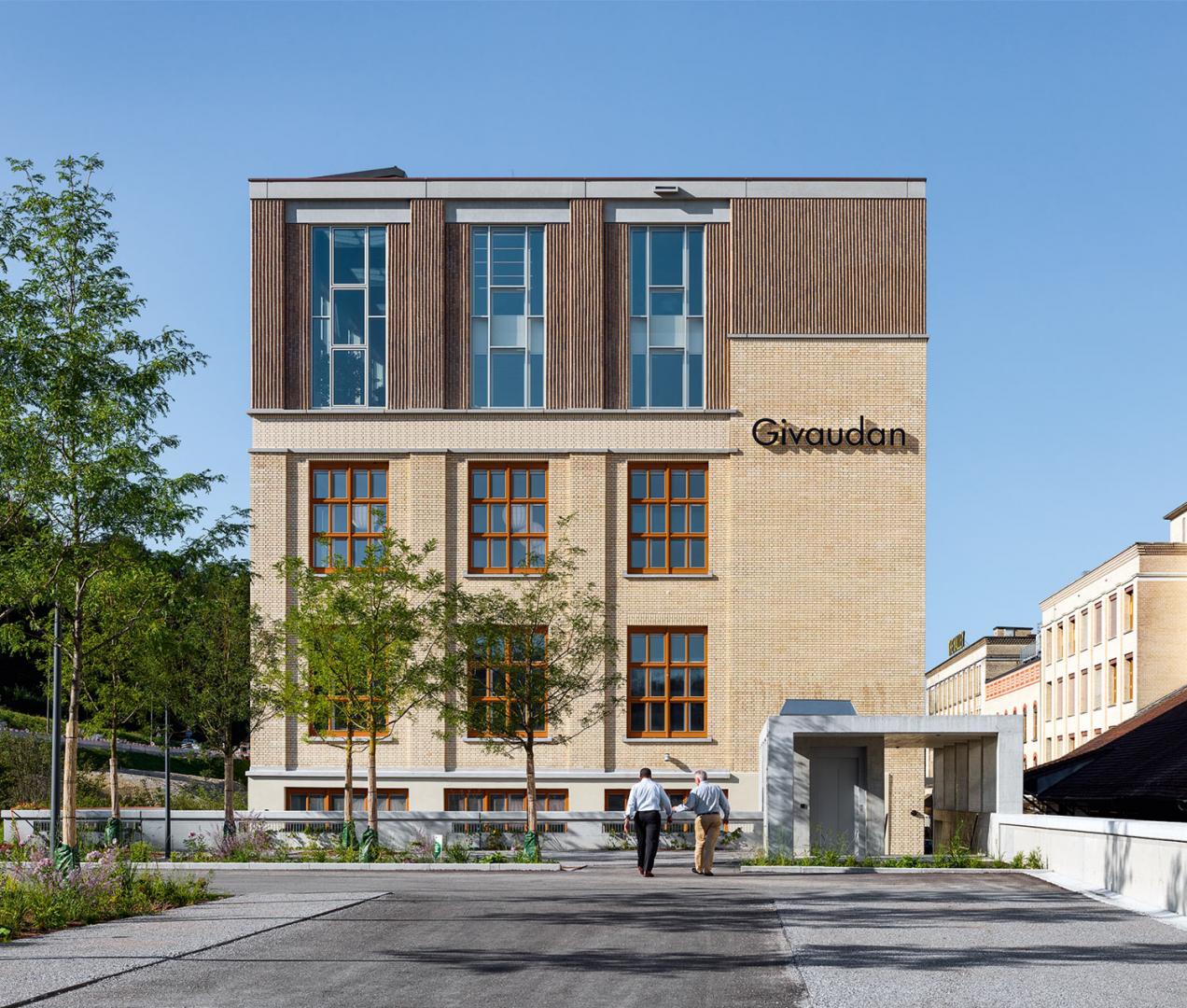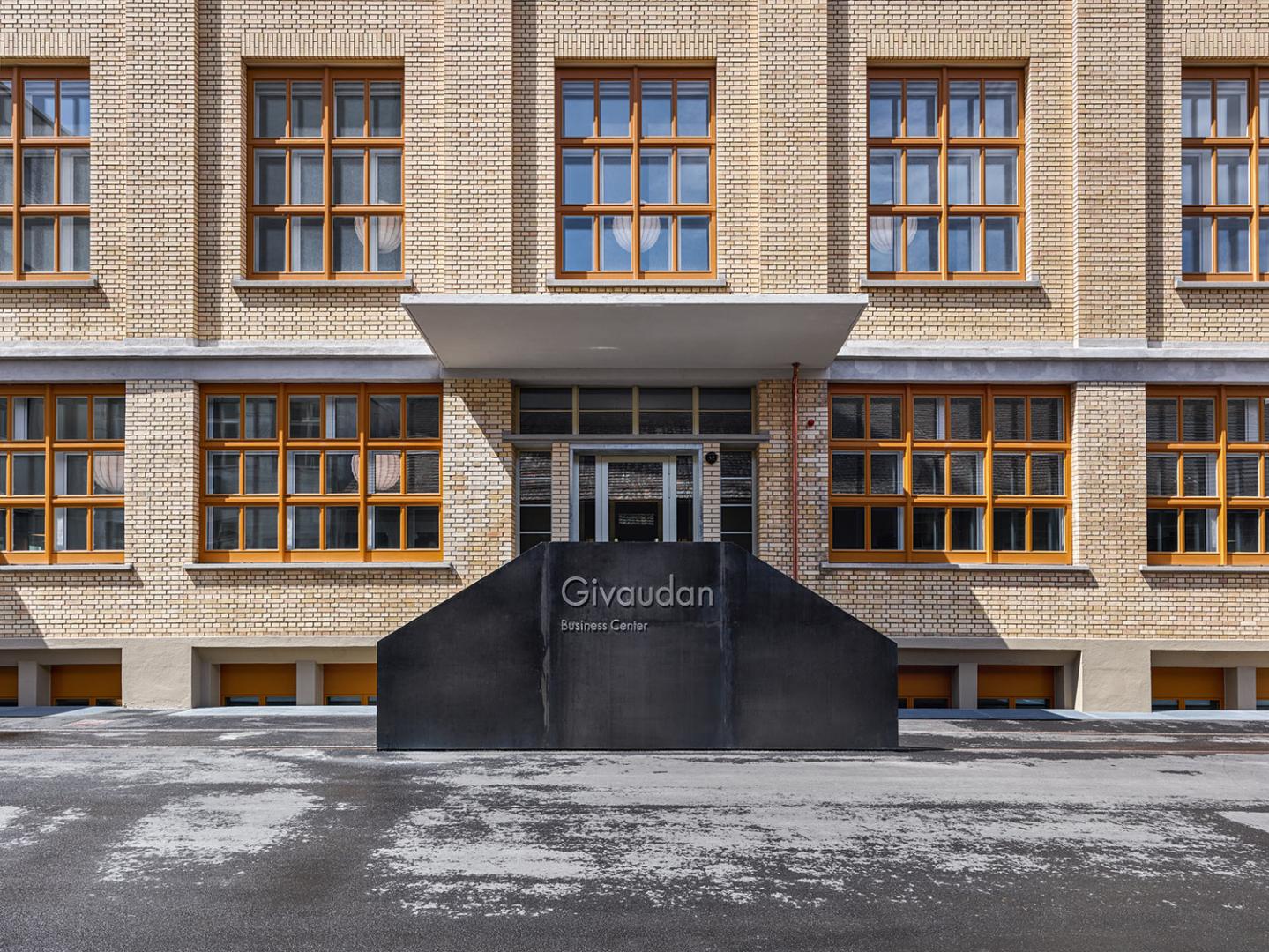 Die Materialisierung der Räume stellt das Raumerlebnis in den Vordergrund. Schattierungen von Grau prägen die Räume – vom dunkleren Grau der PU-Beläge über die hellen Grautöne der Holzverkleidungen bis hin zu den roh belassenen und beinahe weiß gestrichenen Betondecken und Stützen. Die zweigeschossige Aufstockung führt die Grundstruktur des Gebäudes weiter. An den Fassaden liegen die überhohen und im Innern des Gebäudes die eingeschossigen Räume. Die überhohen Räume sind als Orangerien mit für die Aromaproduktion relevanten Pflanzen ausgeführt – hier ist der Ort für informellen Kontakt und Austausch, während im Innern des Gebäudes zwei einzelne Geschosse die Sitzungsbereiche und die Open-Space-Räume der Geschäftsleitung aufnehmen. Die bestehenden Fenster waren in einem nicht mehr sanierbaren Zustand und wurden mit originalen Beschlägen und Gläsern sowie in einer farbarchäologisch ermittelten Farbigkeit in Holz nachgebaut. Dabei dienen diese Fenster nun als Vorfenster, welche den neuen textilen Sonnenschutz aufnehmen und die Innenräume vor dem Lärm der Autobahn schützen. Im Innern interpretieren dreifach verglaste Holzfenster die Proportionen des Bestandes.