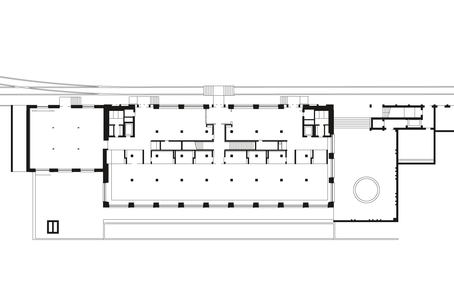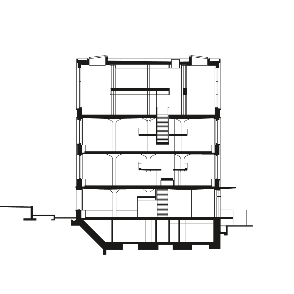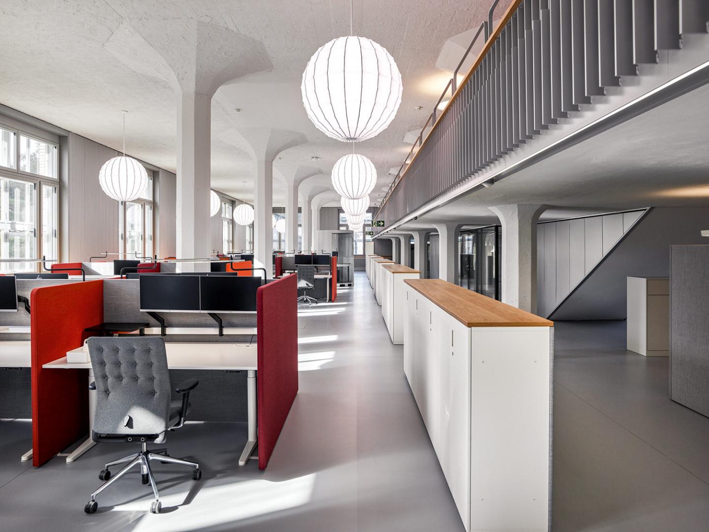 Diese einzigartige Struktur und die Fassaden zu erhalten und zu stärken, war die architektonische Herausforderung für den Umbau und die Aufstockung des Gebäudes für 200 hochinstallierte Arbeitsplätze. Heizung, Lüftung, Kühlung, Kommunikation und Elektro wurden horizontal in einem extra entwickelten Brüstungselement geführt und die komplette vertikale Haustechnik-Erschliessung und Erdbebenaussteifung wurde im Umriss der bestehenden Treppenhauskerne neu erstellt. Die bauphysikalisch notwendige Wärme- und Akustikdämmung wurde über eine innere Verkleidung gewährleistet. So konnten die gesamten Räume technisch auf den neuesten Stand gebracht und trotzdem die Fassade im ursprünglichen Erscheinungsbild erhalten werden. Der prägende Raumeindruck bleibt erhalten. Eigens zusammen mit der Innenarchitektin Verena Frey und Zumtobel Licht AG entwickelte textile Kugelleuchten nehmen Bezug auf die ursprünglichen Leuchten und stärken so anschaulich den hallenähnlichen Raumeindruck. Die Nutzung orientiert sich an der räumlichen Struktur des Gebäudes. In den Hallen sind kompakte Arbeitsplätze in Clusterbüros angeordnet, unter den Galerien die unmittelbar dienenden Strukturen und auf den Galerien die Orte des informellen Kontaktes und Rückzugs. Die zweigeschossige Aufstockung beherbergt die Cafeteria mit Tagungszentrum und die Räume der Geschäftsleitung.