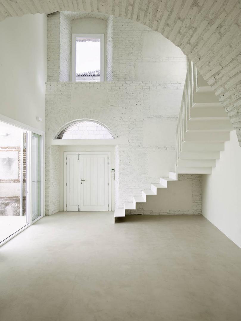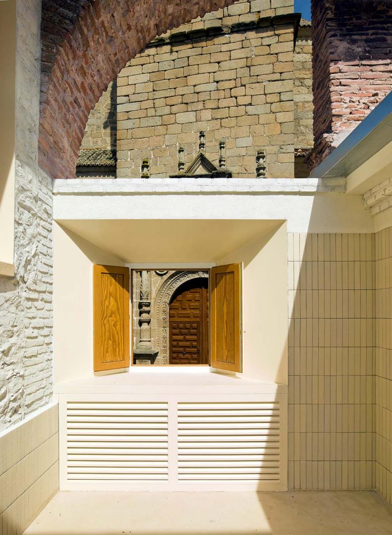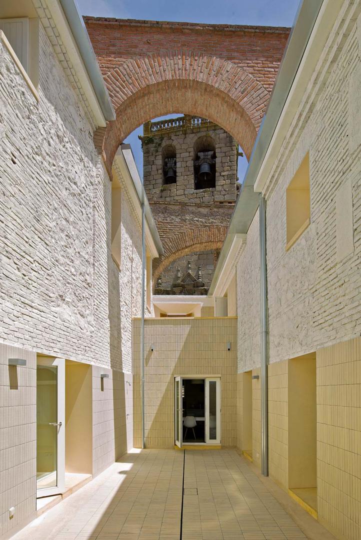 Dieser längslaufende Innenhof gibt nun einen wunderbaren Blick auf den Kirchturm aus dem 16. Jahrhundert frei. Durch den Hof werden die Gebäude zudem mit viel natürlichem Licht durchflutet. Beide Häuser sind zum zentralen Hof hin geöffnet, eines der Häuser hat zudem einen kleinen privaten Innenhof. Die alten Mauern bestehen aus einem unregelmäßigen Mix aus Back- und Natursteinmauerwerk, genannt „Aparejo Toledo“. Die zum Teil stark beschädigten Sockelbereiche des Mauerwerks sowie der Hofboden wurden mit einem Gitter aus Ziegelriemchen überzogen, das als verstärkende Deckschicht dient. Die restaurierten Wände wurden weiß gestrichen passend zu den sandsteinfarbenen Backsteinen.