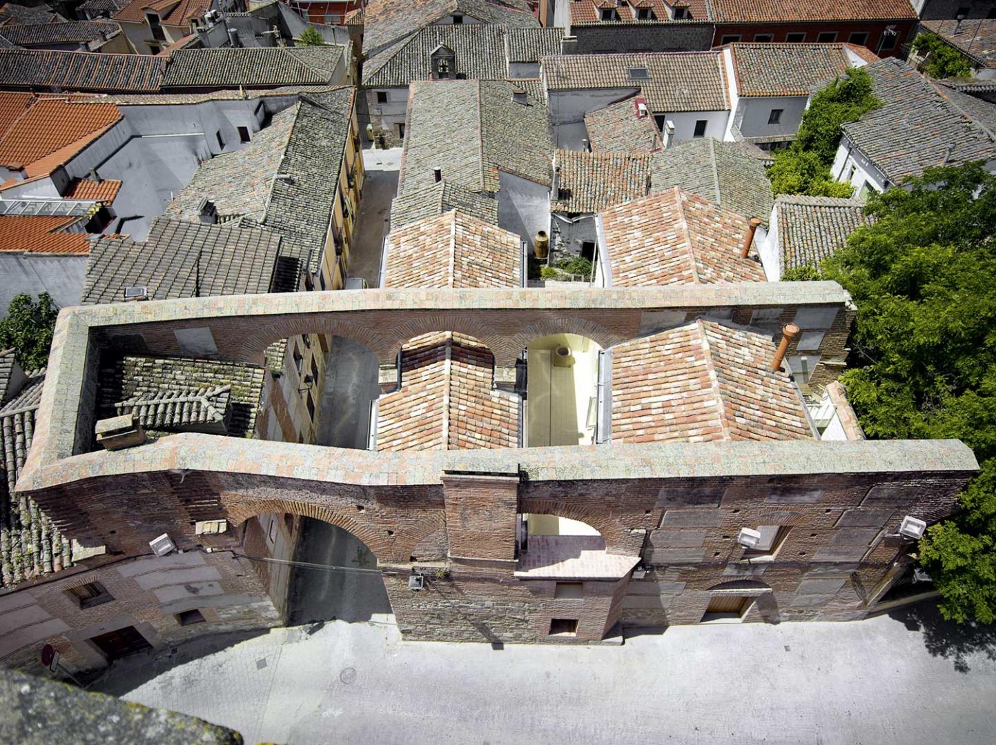 Oropesa liegt am Fuße der Sierra de Gredos. Von hier aus hat man einen grandiosen Blick über schneebedeckte Berggipfel und Olivenhaine. Die Kleinstadt ist bekannt für ihre Burg aus dem Jahr 1402. Sie sollte über nie fertiggestellte Arkaden mit der Kirche Nuestra Señora de la Asunción verbunden werden. In diesen aus Bögen und Mauern bestehenden Arkaden, die die Stadt durchkreuzen, sind die Häuser verborgen. Zunächst waren es drei kleine Häuser. Hinter der Fassade, die über Jahre unverändert erhalten blieb und durch große Backsteinbögen geprägt ist, lagen ursprünglich zwei Innenhöfe. Die wenigen Fenster sorgten nur unzureichend für Luftzirkulation und Lichteinfall. Da eine Vorgabe des Projekts in der Erhaltung der Fassade bestand, schuf man im Inneren einen langen und breiten Hof, an dessen Seiten die beiden ungleichen Häuser für die Geschwister gestaltet wurden.