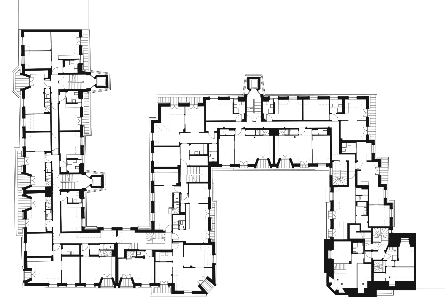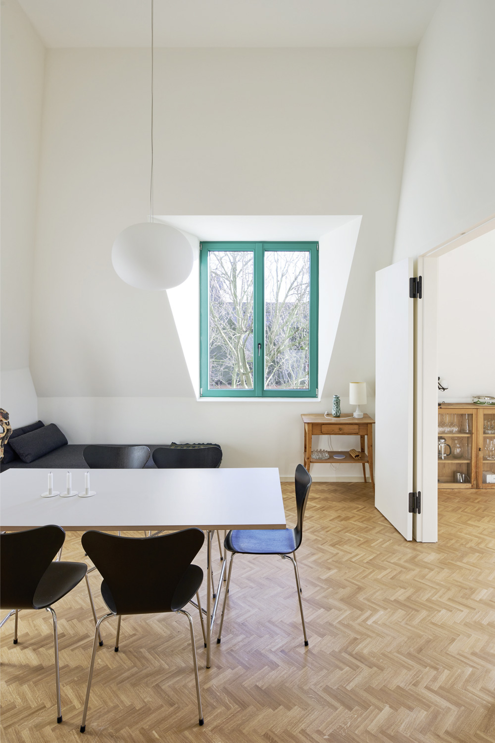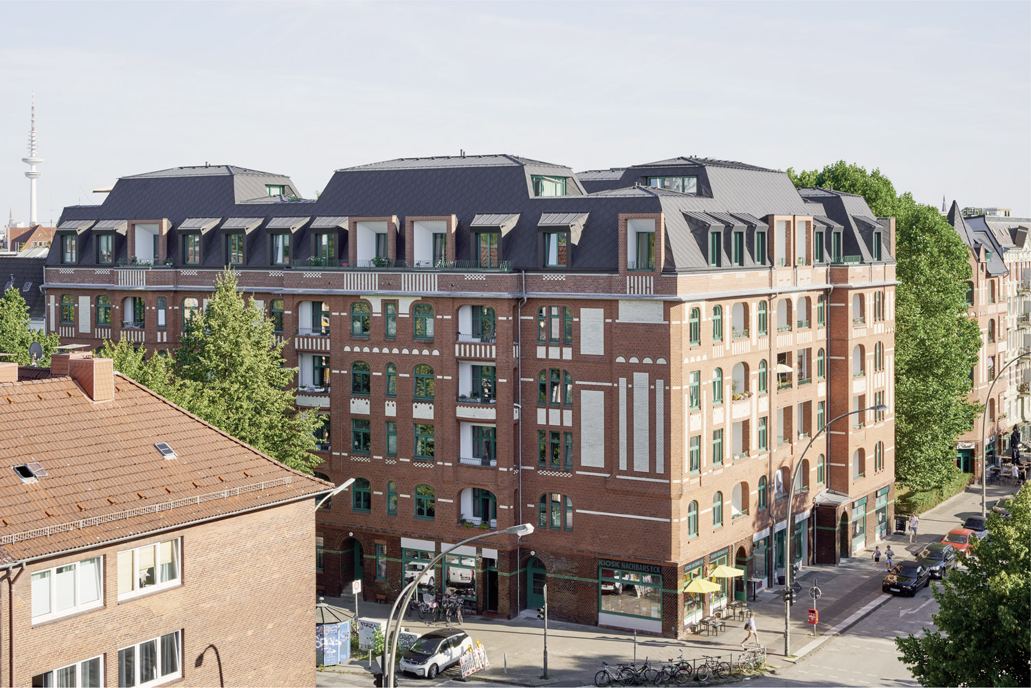 Die Sanierung und zweigeschossige Aufstockung eines denkmalgeschützten Ensembles in Hamburg setzt das Vorhandene im selben Rhythmus fort. Die Erweiterung fügt sich nahezu nahtlos in das historische Umfeld ein.