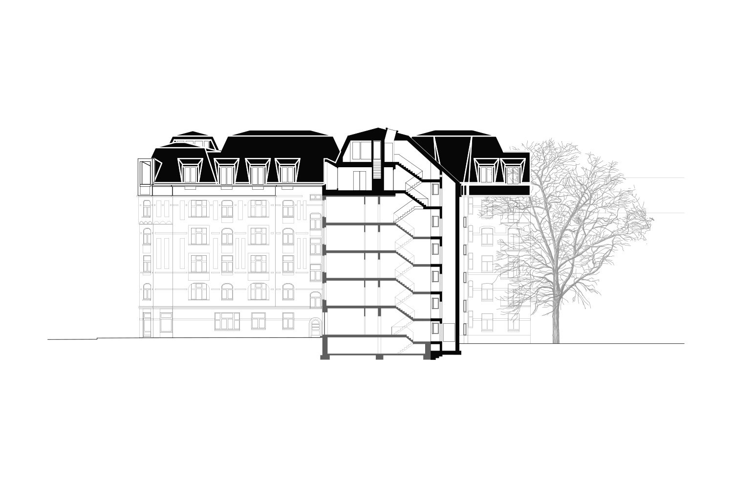 Die aus acht Einzelgebäuden bestehende Mietshausgruppe Methfessel-Ecke Lutterothstraße in Hamburg-Eimsbüttel wurde 1908 von der Konsumgenossenschaft „Produktion“ errichtet. Nach starken Kriegszerstörungen reduziert wieder aufgebaut, genießt die großstädtische Anlage mit ihren mehr als einhundert Wohnungen und mehreren Ladenlokalen als Zeugnis der Reformarchitektur heute Denkmalschutz. Notwendig gewordene umfassende Sanierungsarbeiten der imposanten Backstein-Fassade und des Notdaches der 1950er-Jahre wurden zum Anlass für eine Erweiterung des Mietwohnungsangebotes genommen. Nach einem intensiven Abstimmungsprozess mit den Baubehörden konnte schließlich eine innerstädtische Nachverdichtung in Form einer zweigeschossigen Aufstockung umgesetzt werden. Baukörperliche und stadträumliche Akzente der neuen Dachlandschaft sind ihre Hochpunkte und Loggiavorbauten, die mit der historische Fassadengliederung in einem formalen dialogischen Bezug stehen und die Rhythmisierung der historischen Großform in der neuen Dachebene fortsetzen.