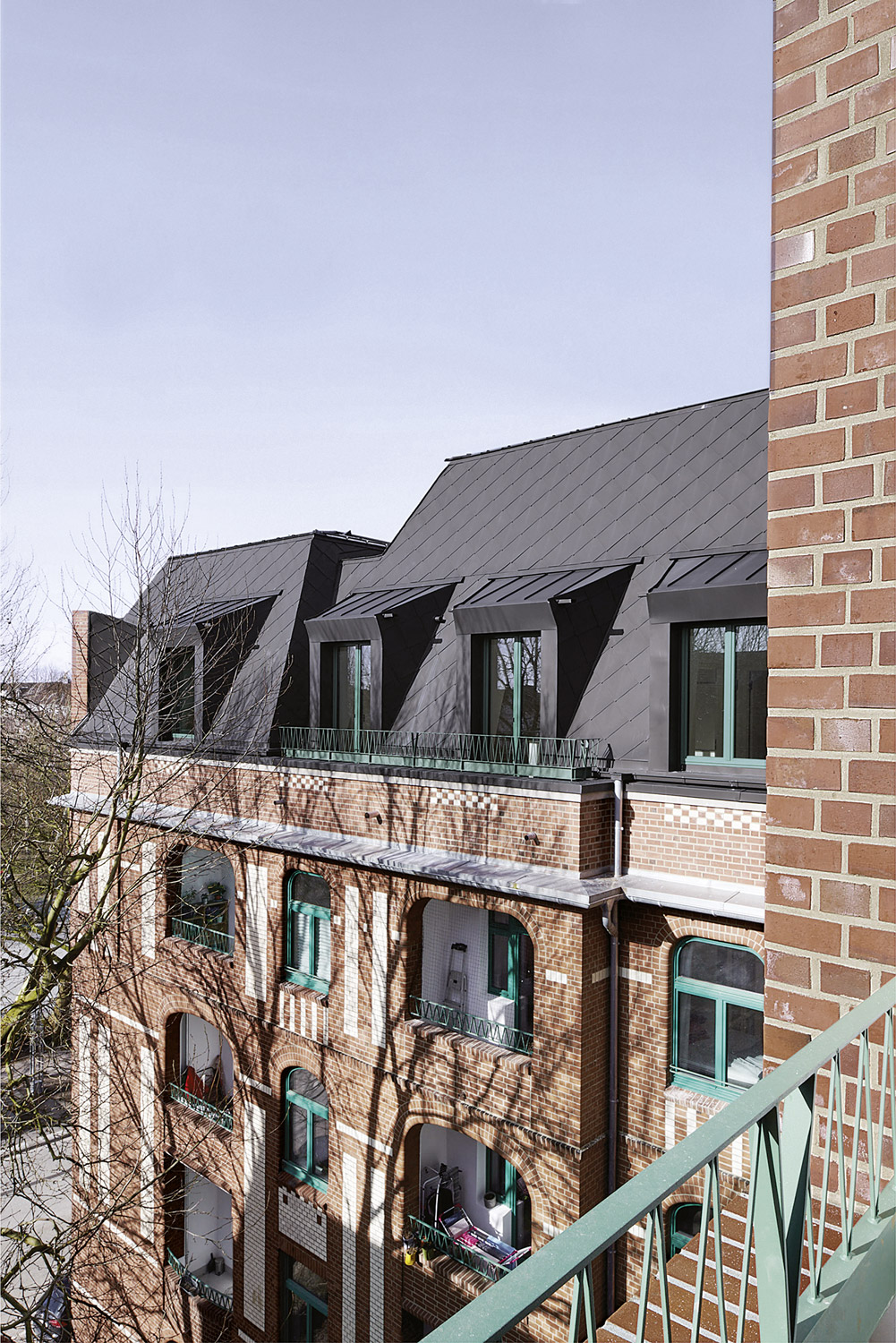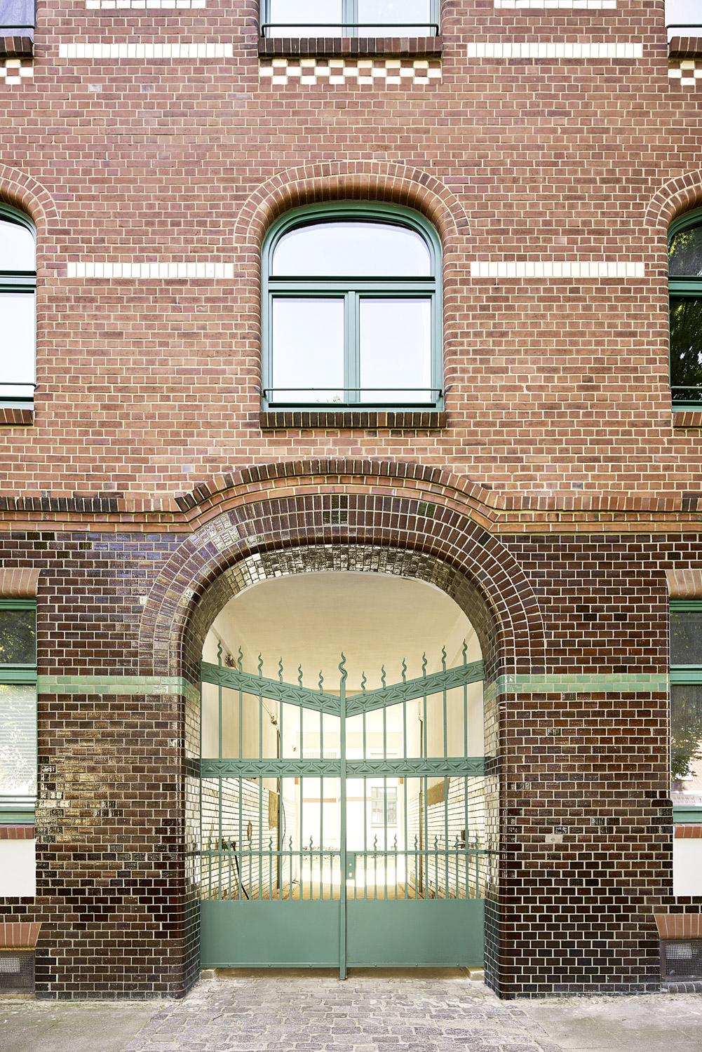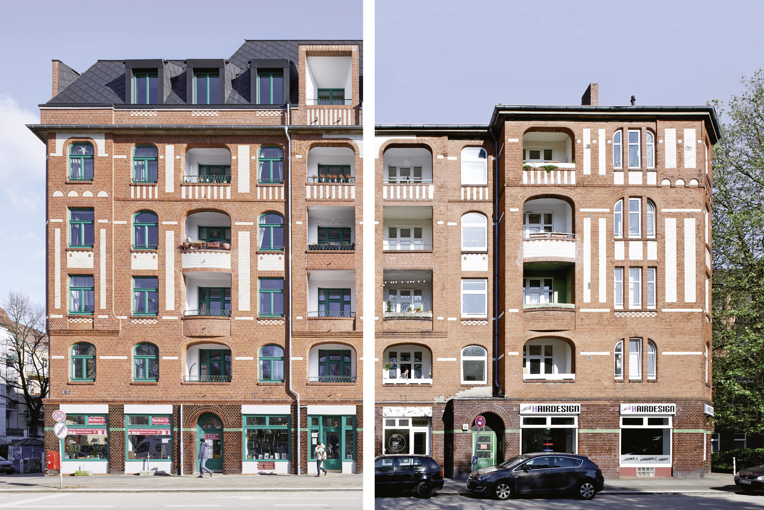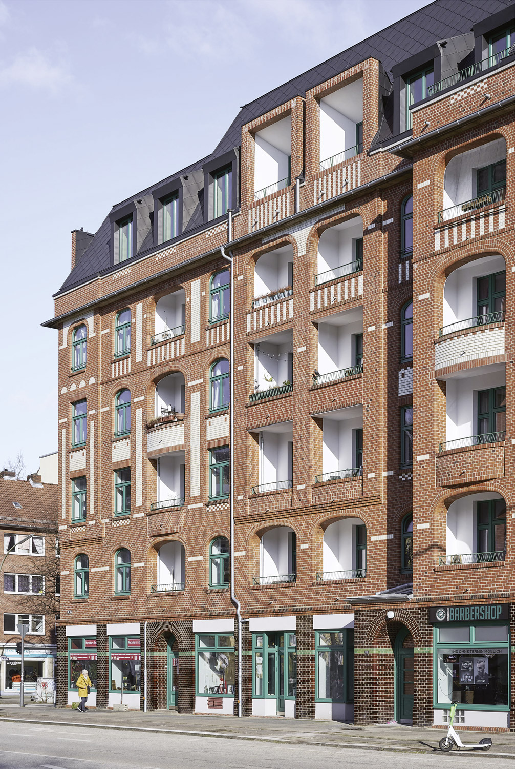 Die bestehende Sichtmauerwerksfassade aus roten Backsteinen im Hamburger Format mit Teilflächen und Mustern aus verschiedenfarbig glasierten Backsteinen war stark sanierungsbedürftig. Ein farblich und haptisch ideal dem Bestand entsprechender Backstein war gefunden, der sowohl für Reparaturen als auch für die bauliche Erweiterung verwendet werden konnte. Das gesamte Fugennetz wurde mit einem Traßkalkmörtel neu abgedichtet. Ein neuer Mauerwerksdrempel mit einer hell glasierten Musterung aus Baukeramik vermittelt nun zwischen den Zeitschichten von Bestandsbau und Erweiterung. In Erinnerung an eine ursprüngliche Schieferdeckung wurden schwarze Schindeln aus Titanzink als Dachmaterial verwendet. In die farbig neu gefasste verputzte Hoffassade wurden zwei Aufzugstürme integriert. Die dreiundzwanzig vielfältigen neuen Mieteinheiten sind Etagen- oder Maisonettewohnungen und werden über konisch zulaufende Gauben oder über von der Straße aus nicht sichtbare Türanlagen zu den Dachterrassen belichtet. Der Ringofenklinker fand im Bereich der Drempel- und Dachterrassenbrüstungen, der Loggienportale und als Belag der Terrassenböden vielfältige Verwendung.
